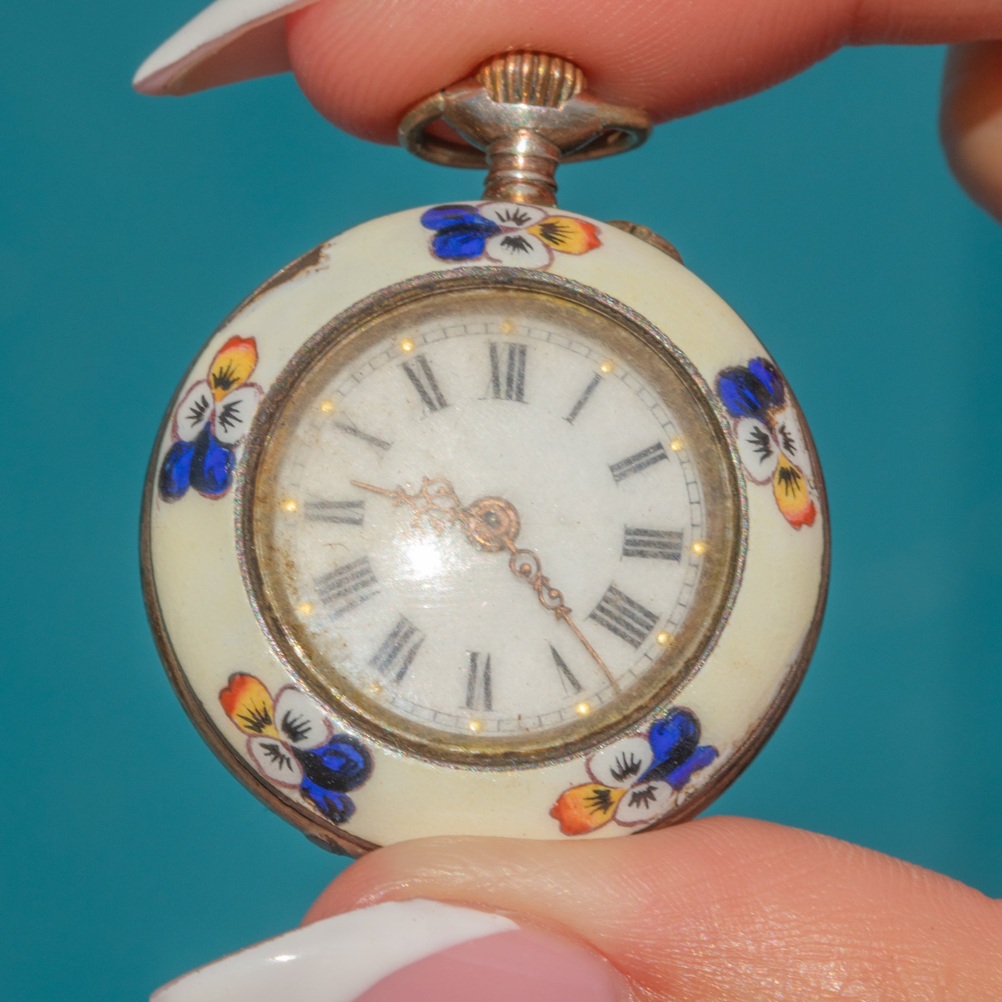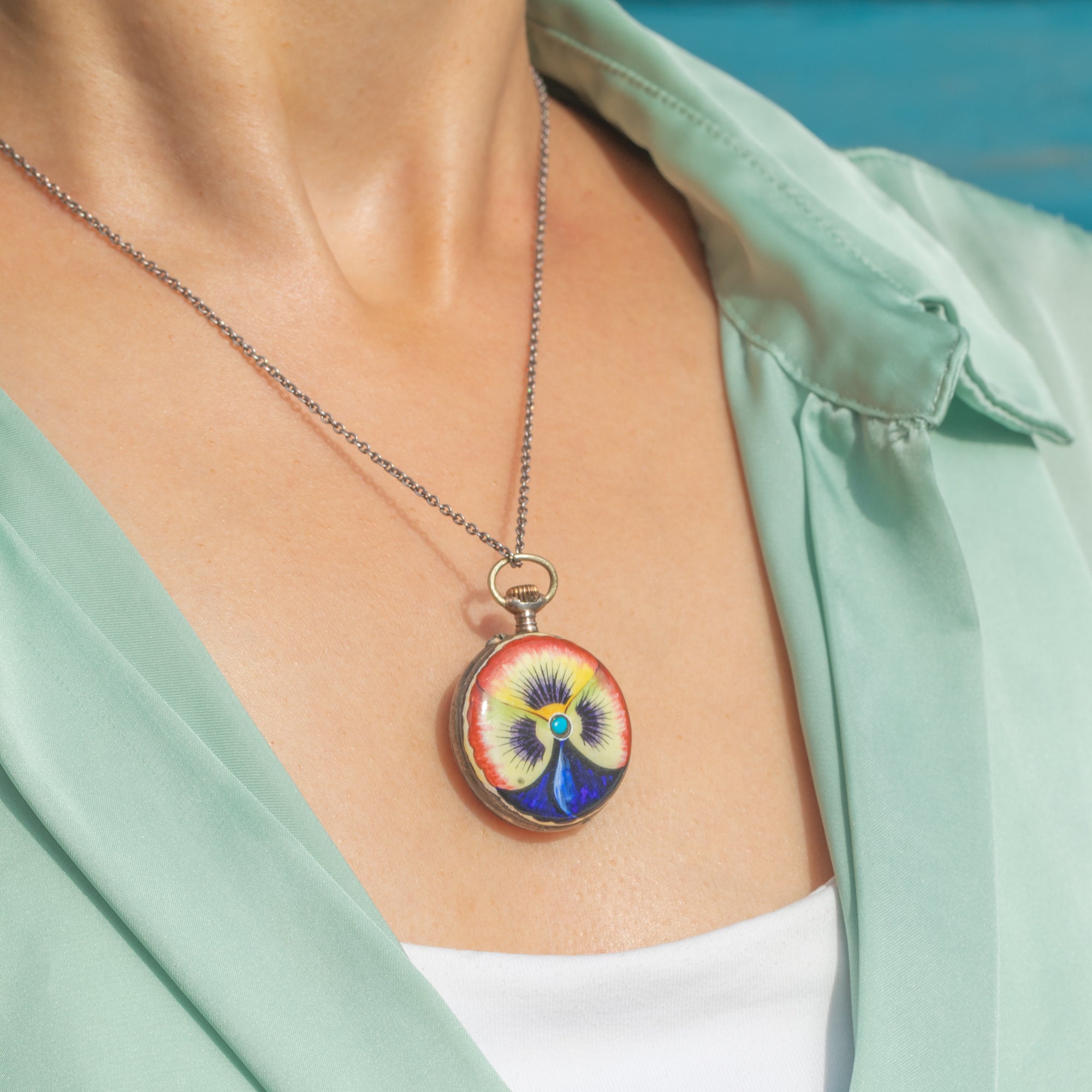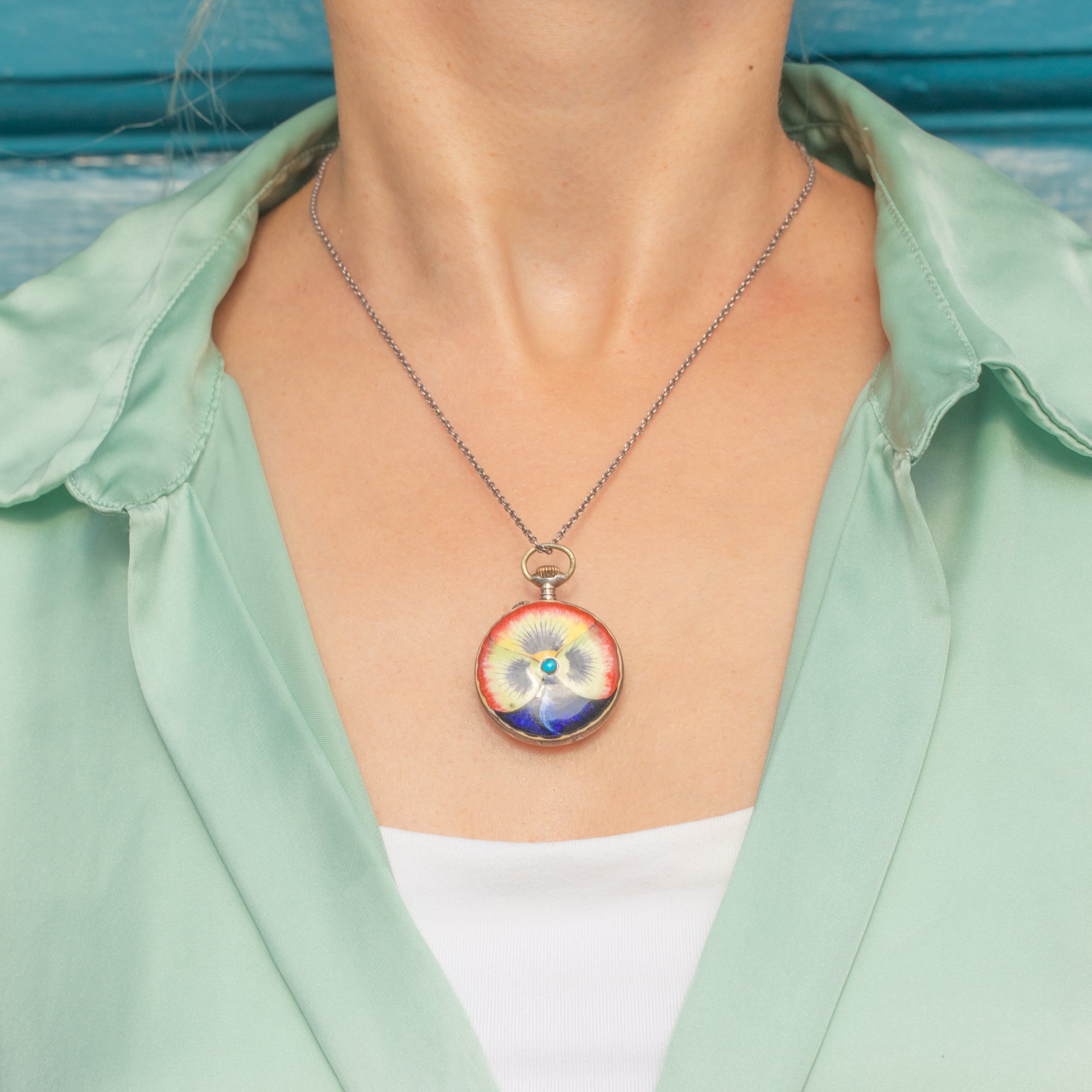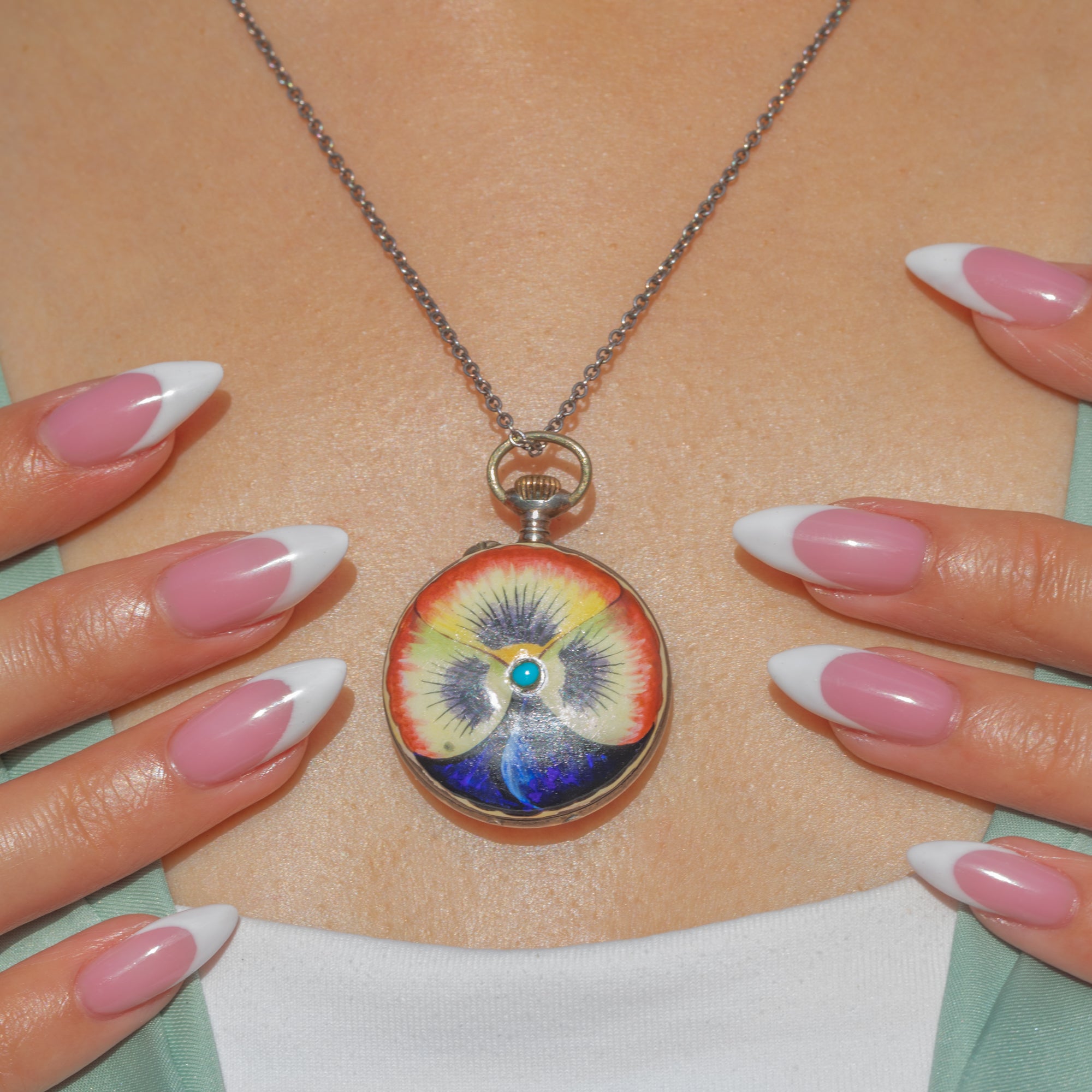 This phenomenal Art Nouveau Enamel pocket watch will set your collection apart from the rest! Perfectly capturing the intricate craftsmanship of the turn of the 19th century, she features a beautiful pansy, accented with a Turquoise stone on one side and a clock-face haloed by smaller pansies on her reverse - she is a floral delight!