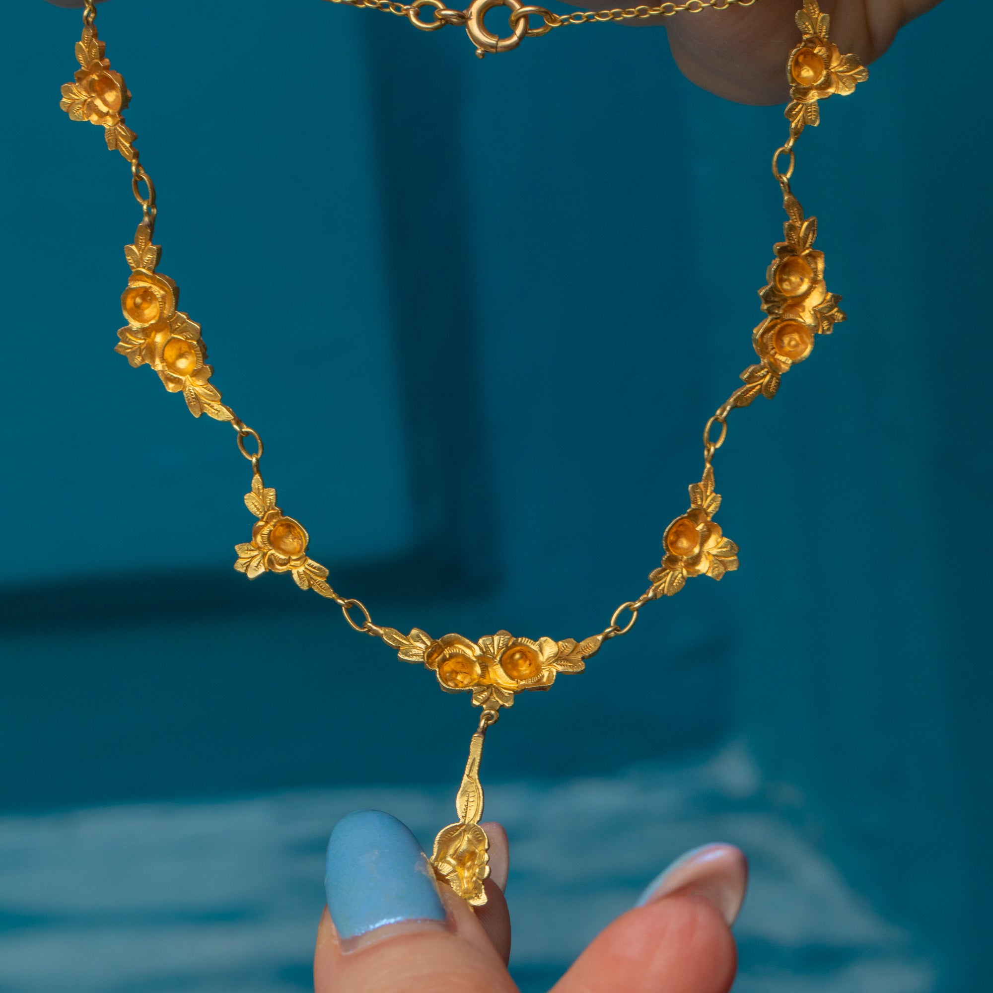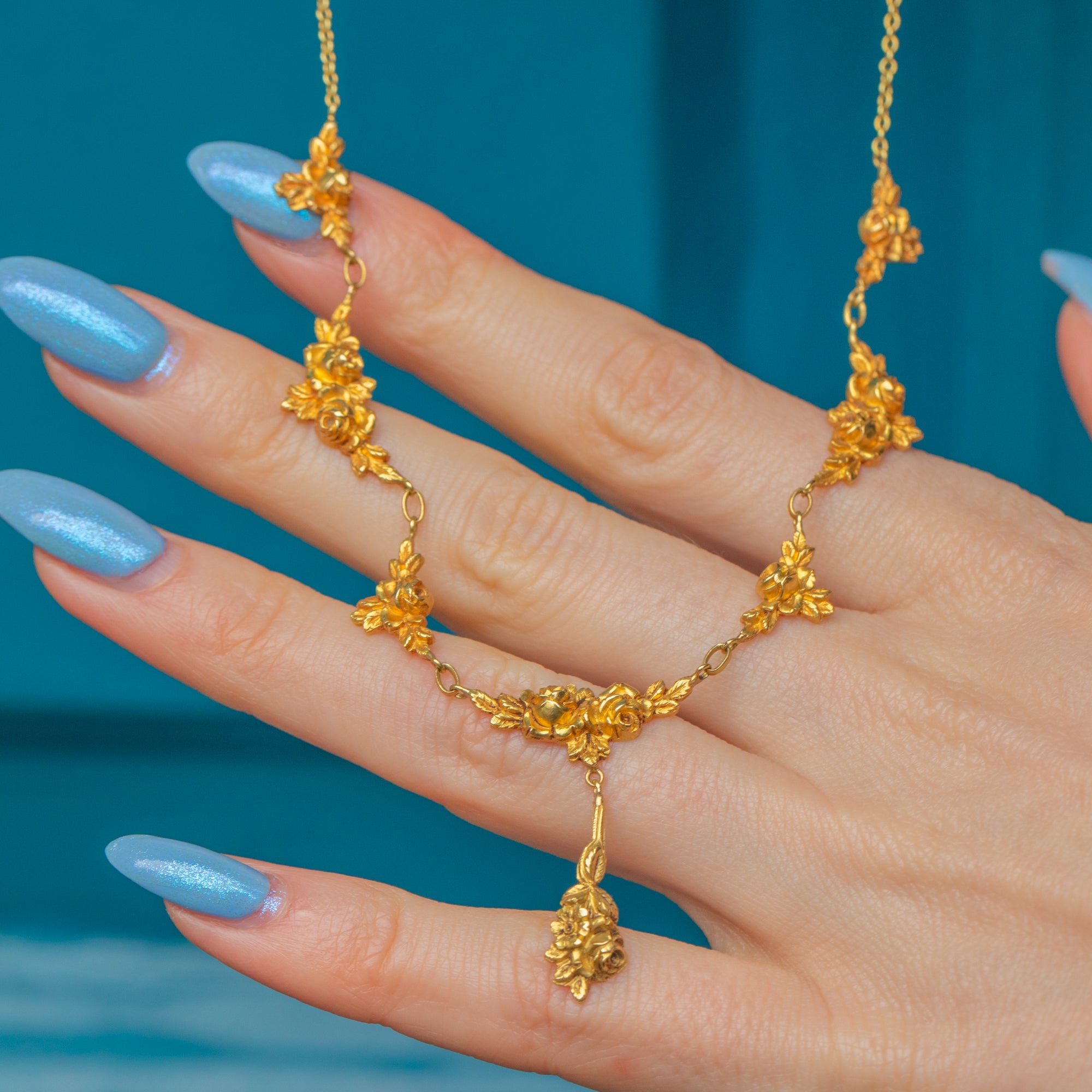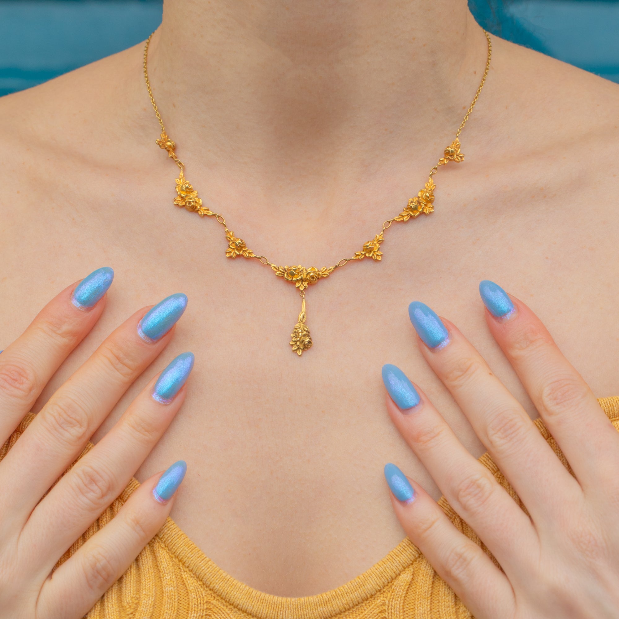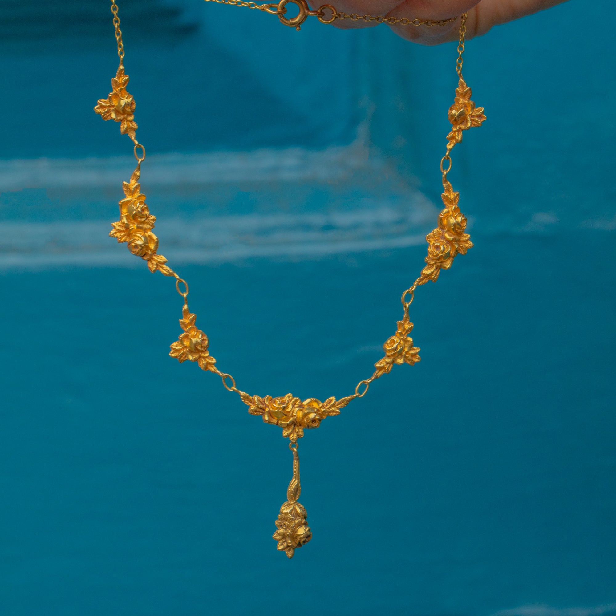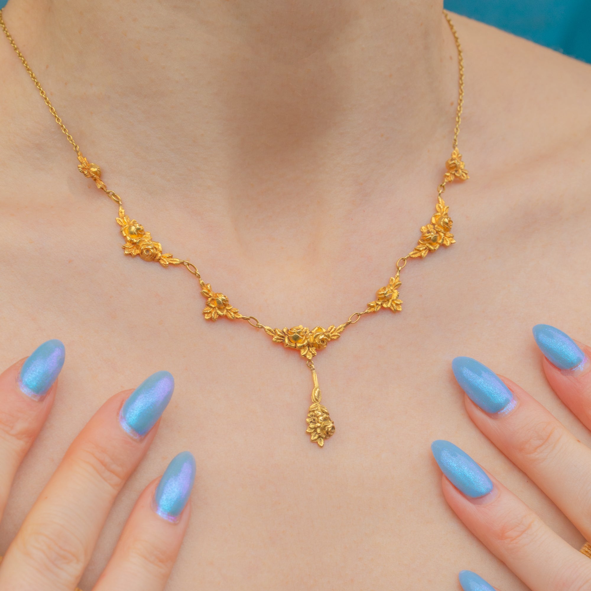 This elegant Art Nouveau French 18ct Gold roses necklace will add a romantic flourish to any outfit! The 16-inch length allows this antique flower necklace to sit delicately across your décolletage, suspending the central drop elegantly between your collarbones.