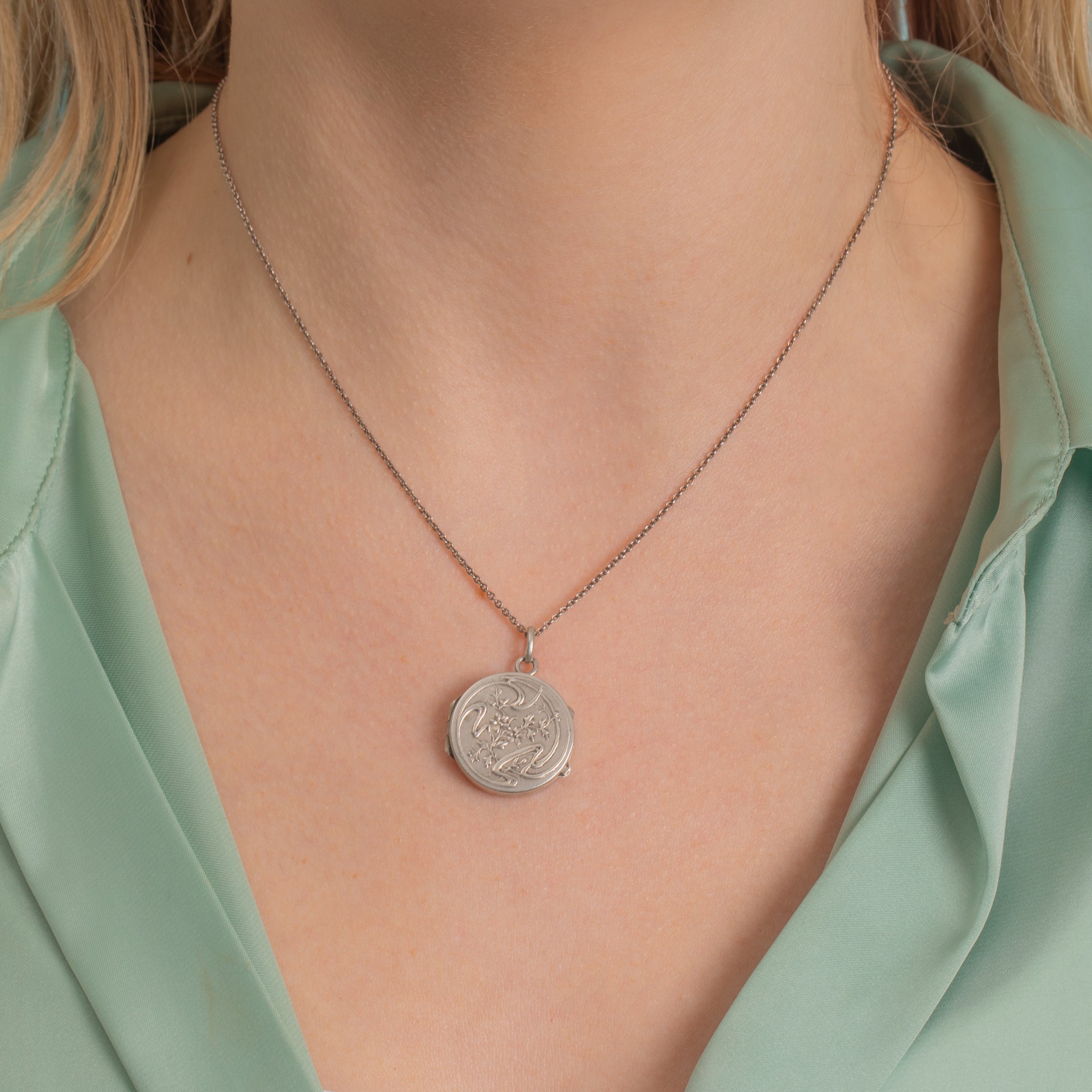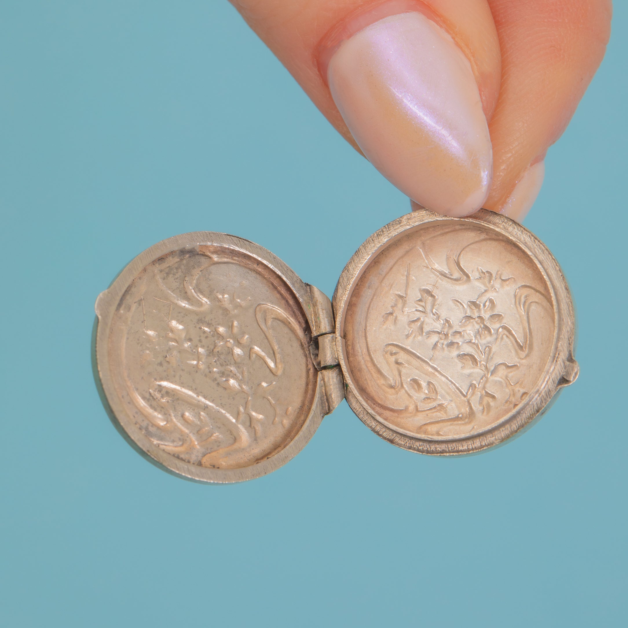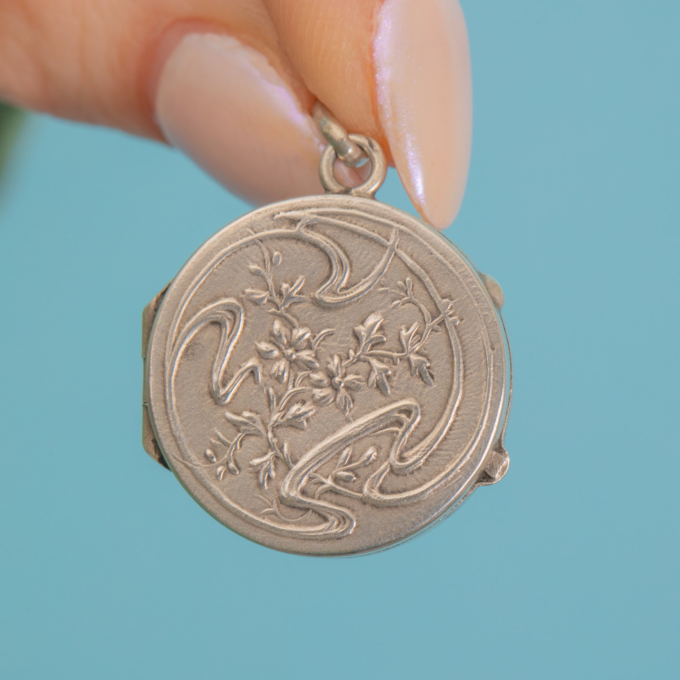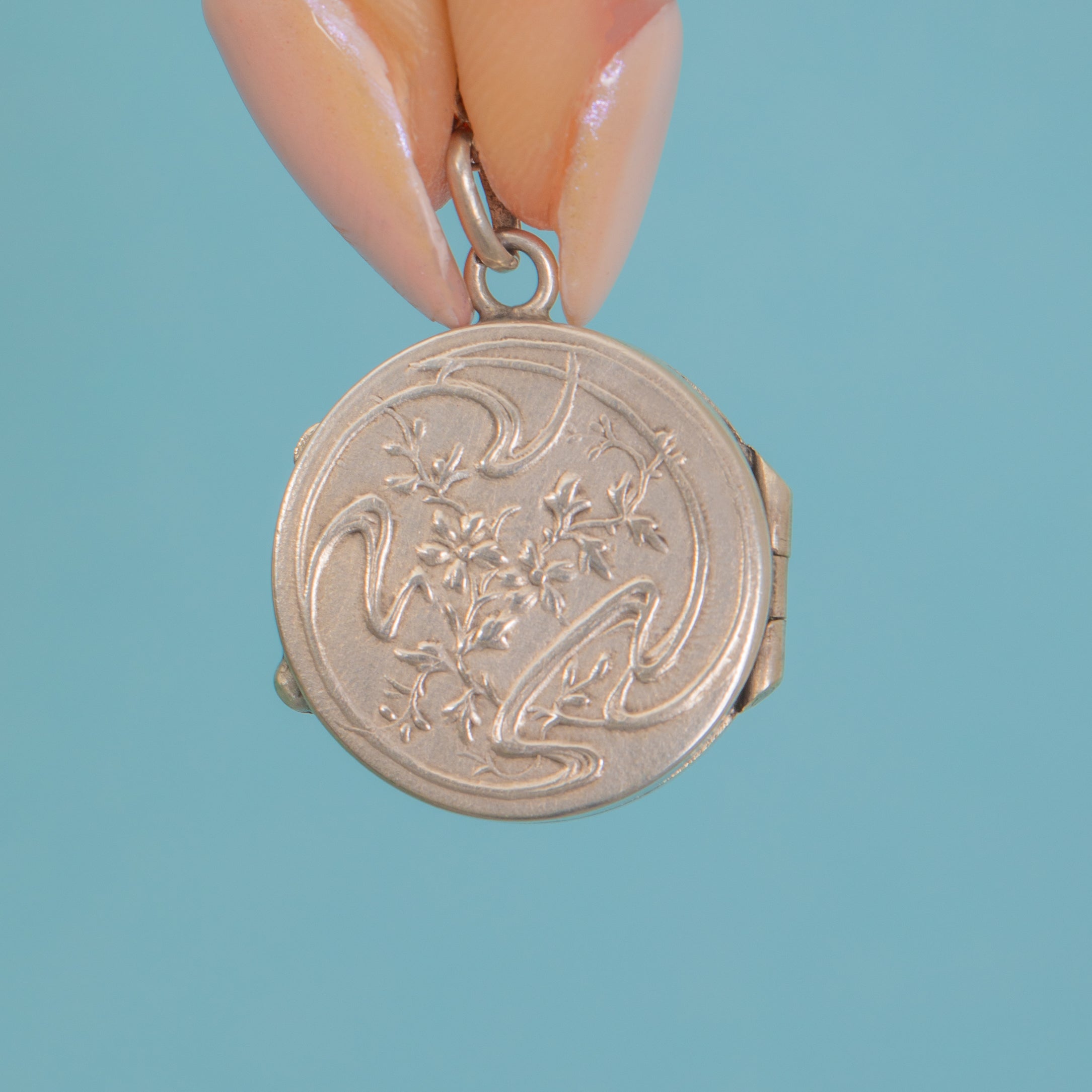 Perfectly sized to hold two photos or keepsakes, she makes a stunning focal point when suspended from a fine chain, catching the light with her intricate detailing. Whether worn alone or layered, this Art Nouveau locket adds a touch of timeless beauty to any outfit.