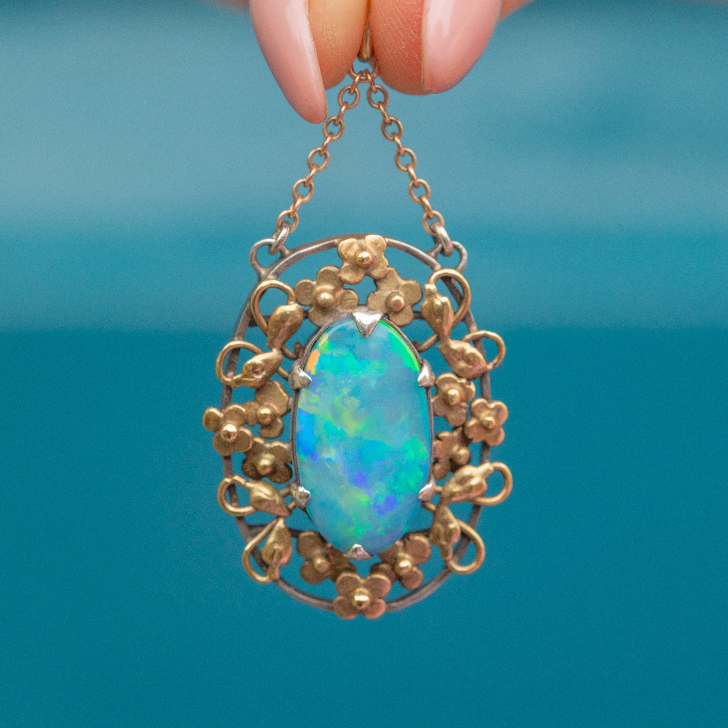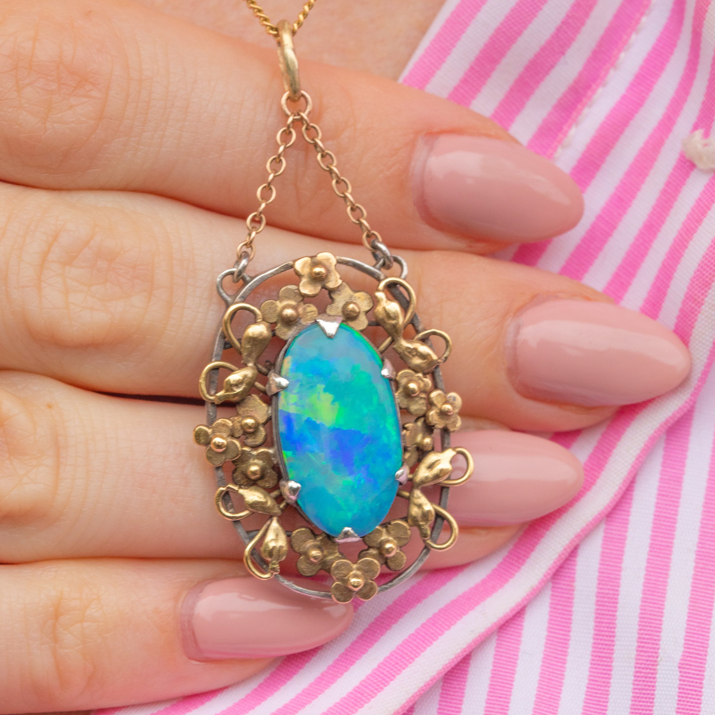 EXCELLENT. This Arts & Crafts 9ct Gold Floral Opal Doublet pendant is in excellent condition. Her Opal doublet remains flawless, displaying vibrant colours with no chips or cracks. The 9ct Gold floral detailing is well-preserved, with no signs of wear or tarnish. The patina on the Silver enhances its antique character while maintaining the pendant’s overall beauty.
