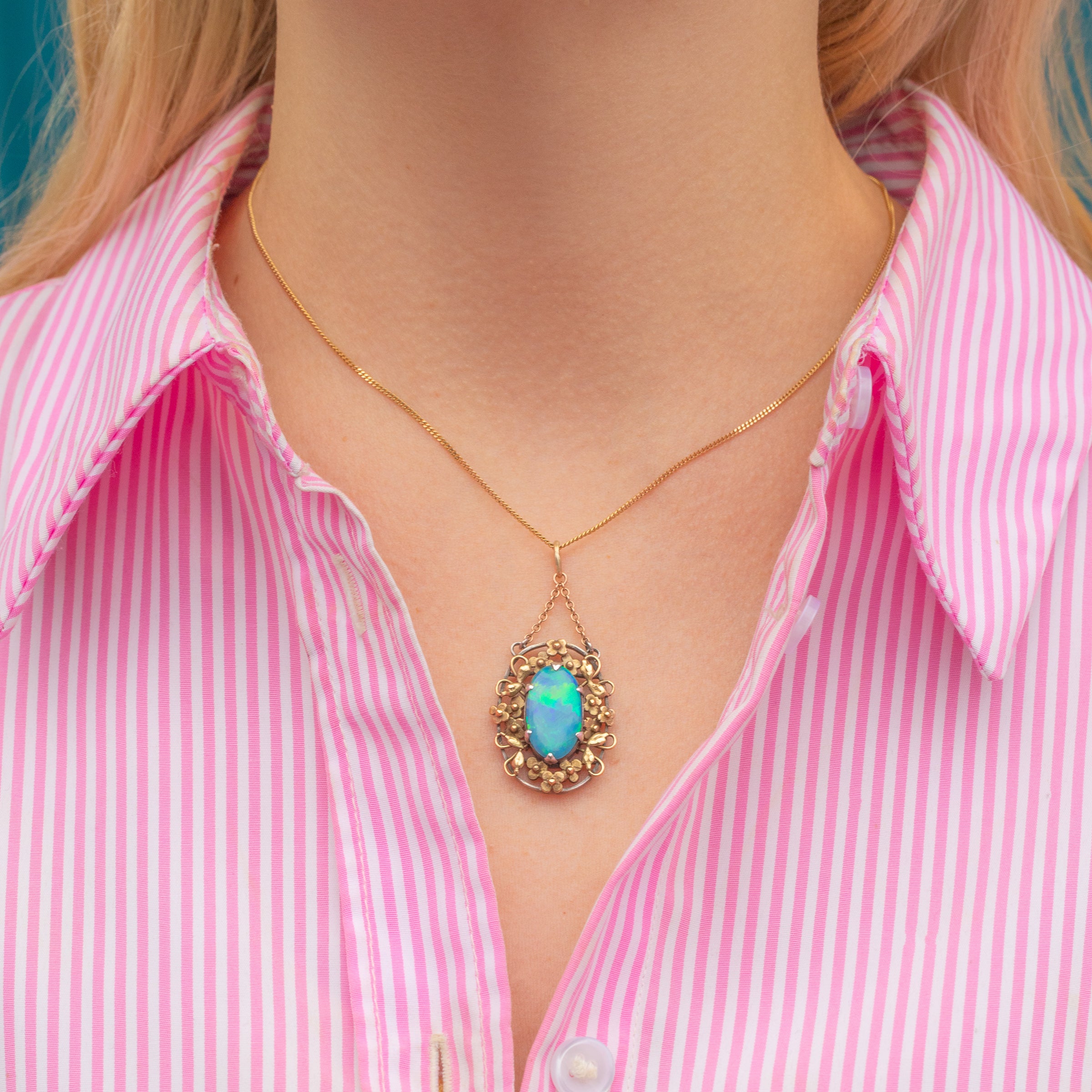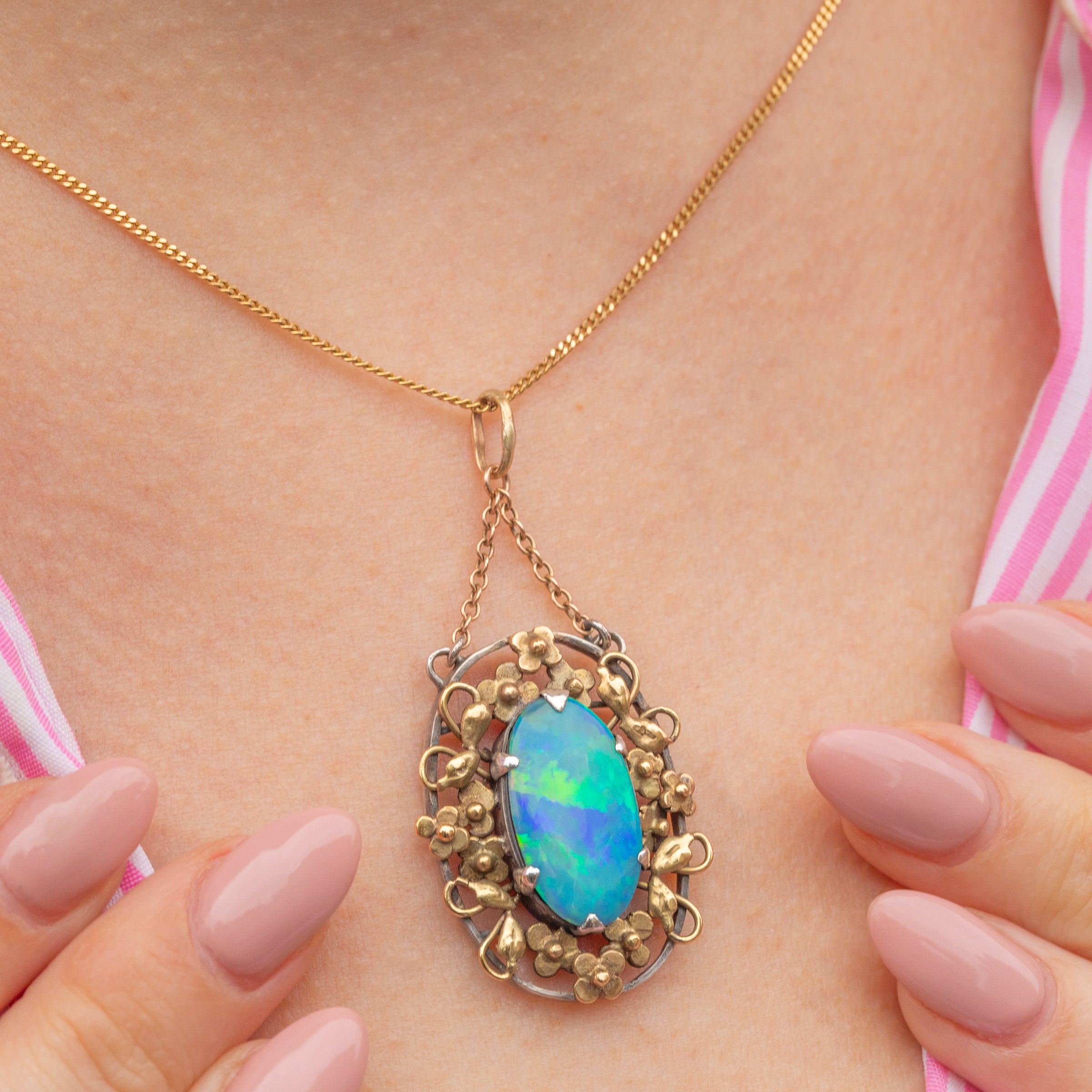 This striking Arts & Crafts 9ct Gold Floral Opal Doublet pendant will bring the perfect touch of whimsy and charm to your collection! She features a gorgeous, big oval Opal doublet that shimmers with dreamy hues of blues and greens, casting a magical, iridescent glow.