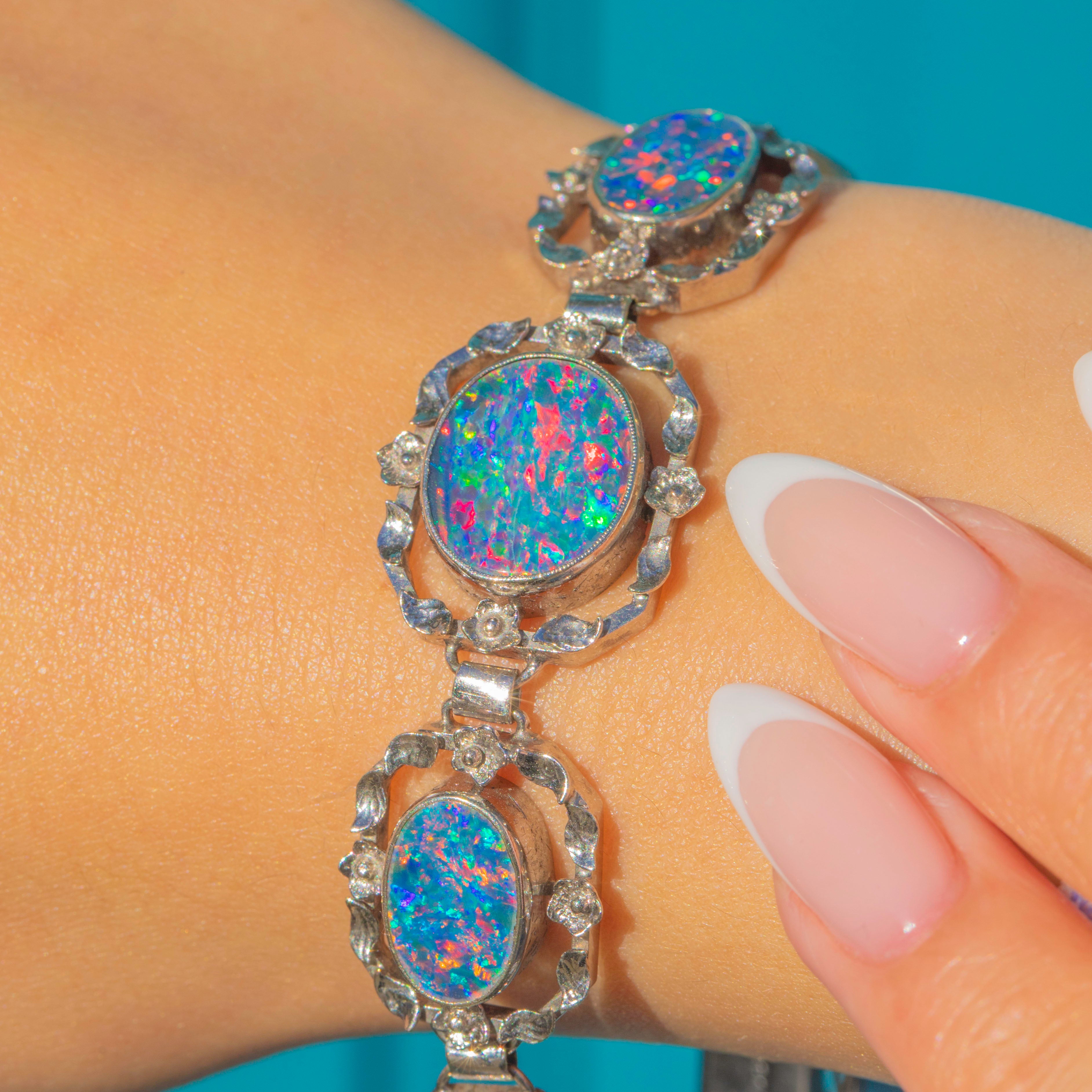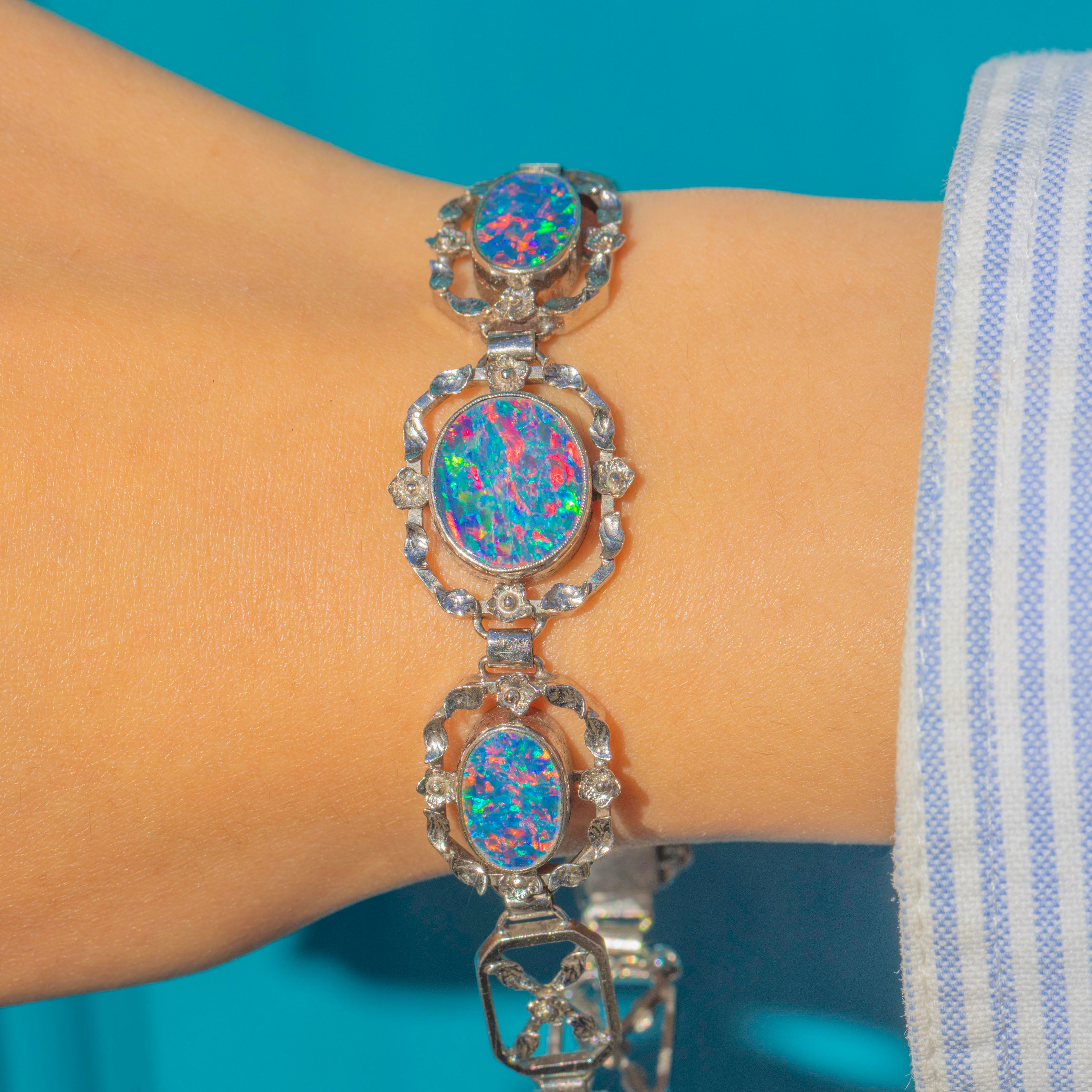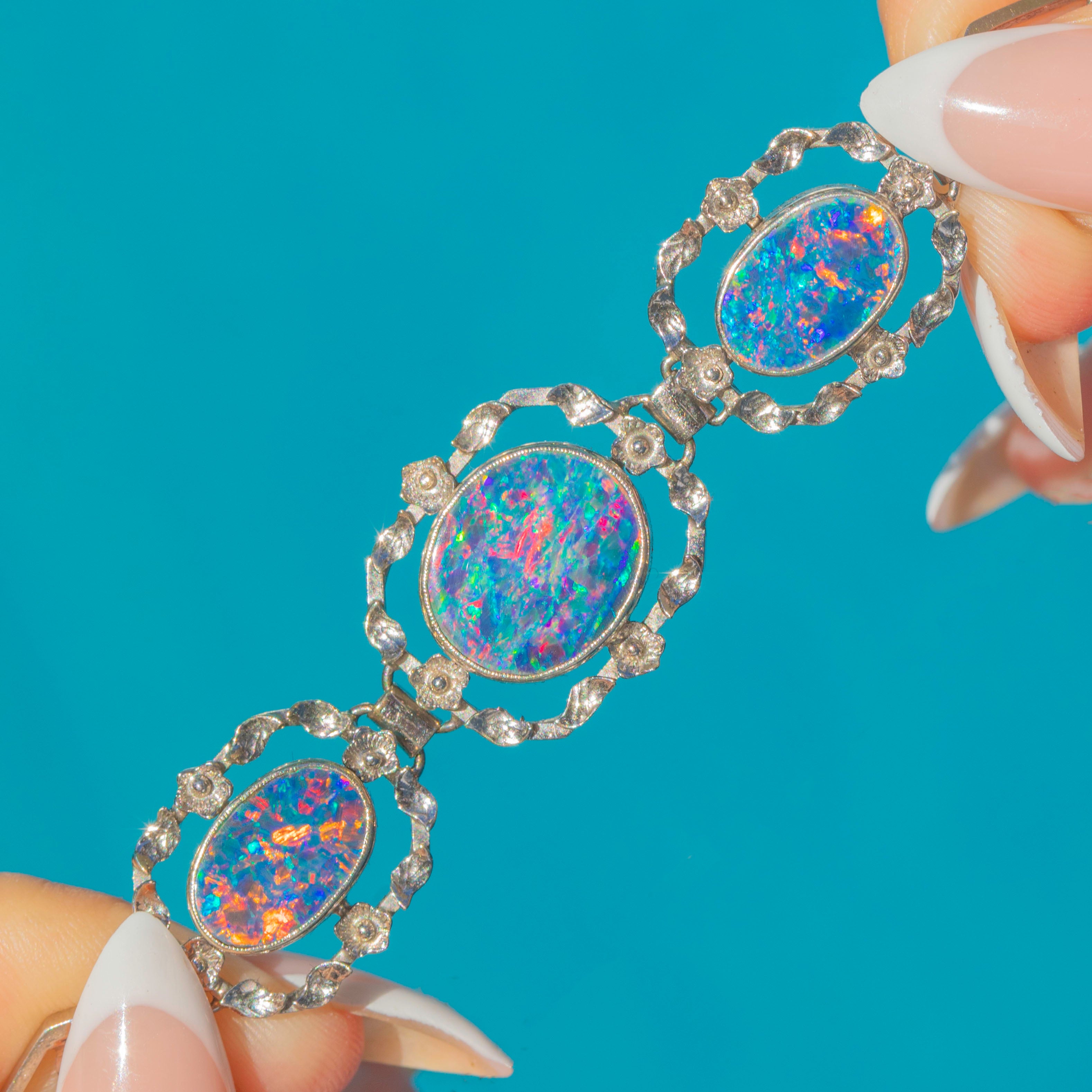 This extraordinary Arts & Crafts era bracelet showcases three rare natural Black Opals, ablaze with neon flashes of orange, red, pink, purple, teal, and green. The Opals are solid and natural—not doublets or triplets—making them exceptionally scarce and highly valuable.