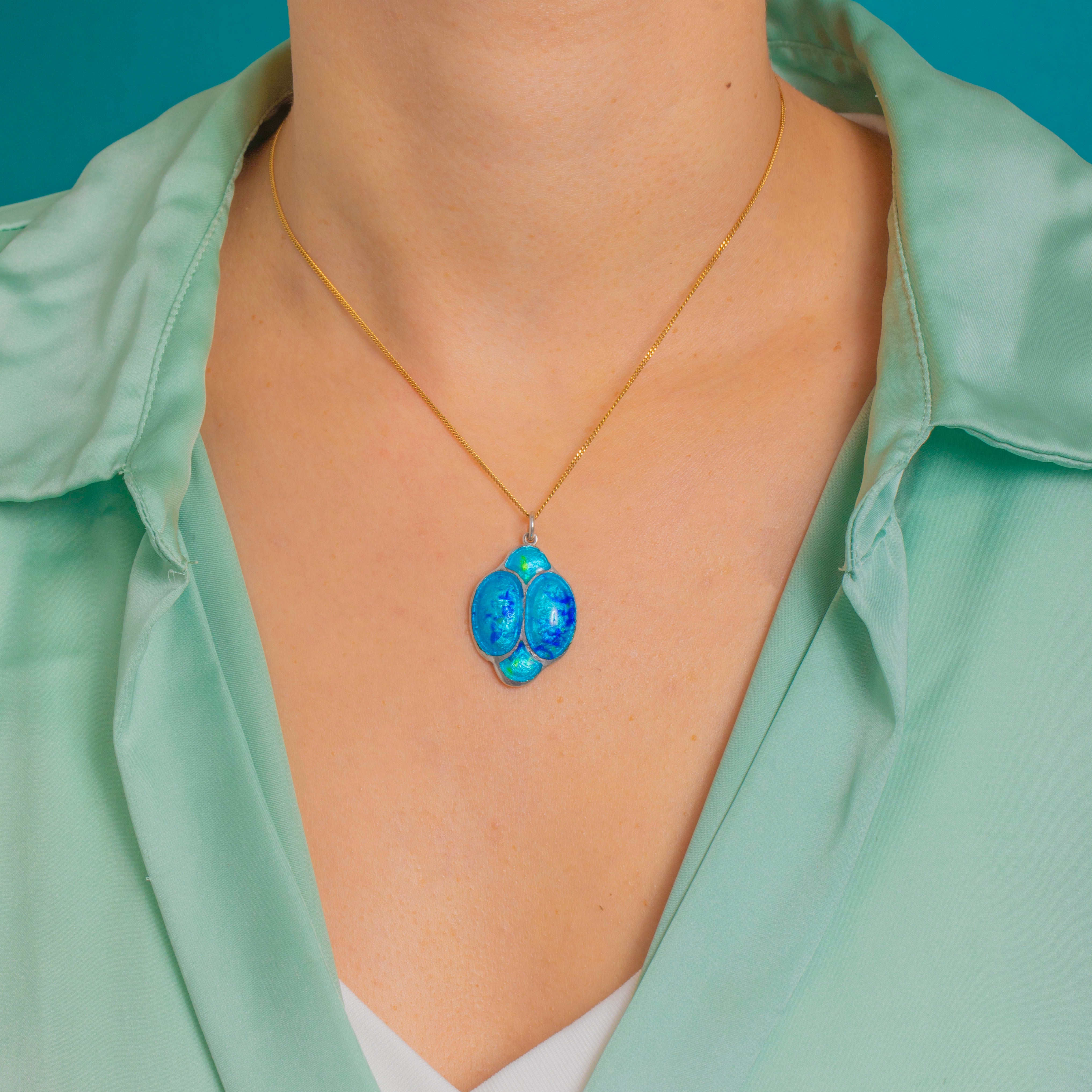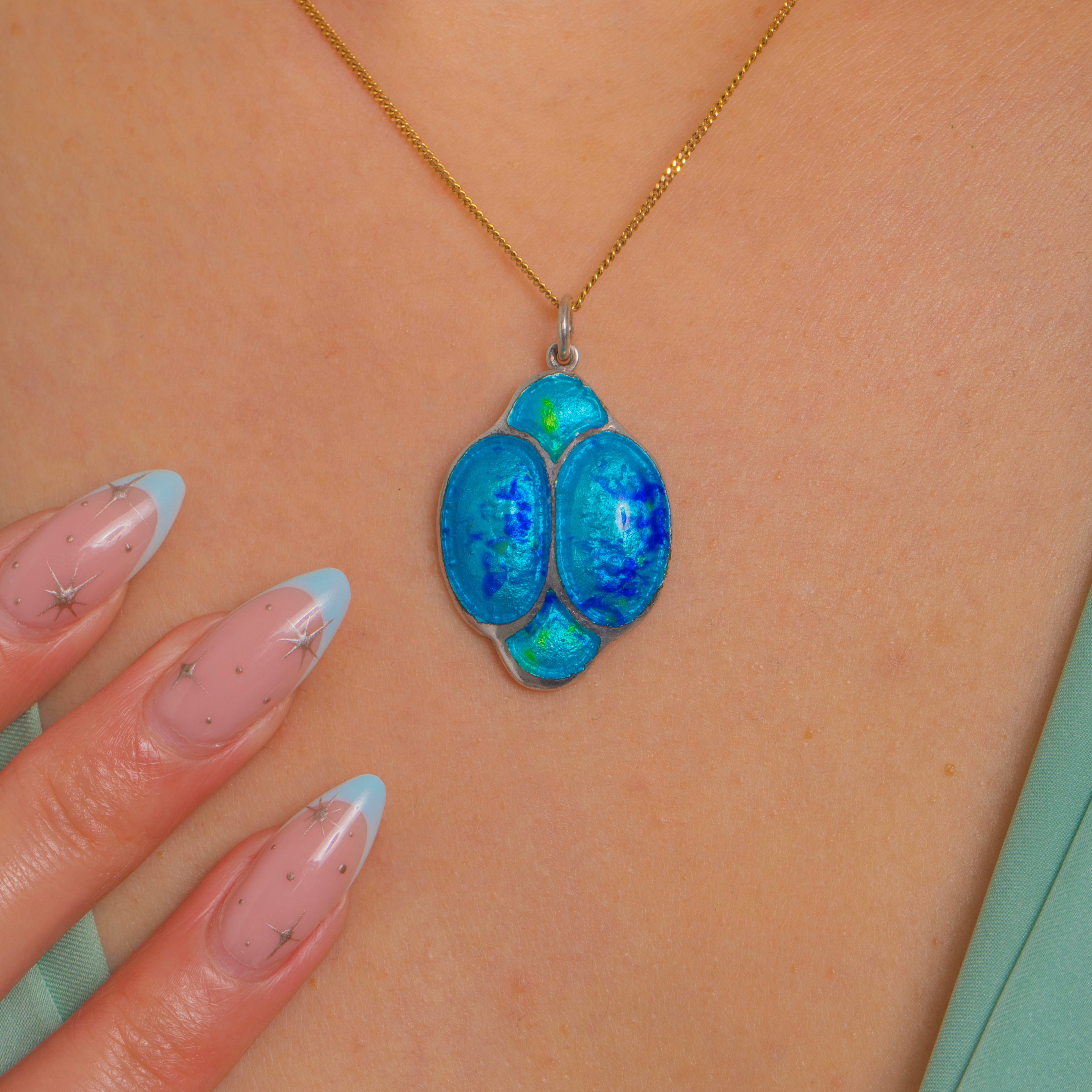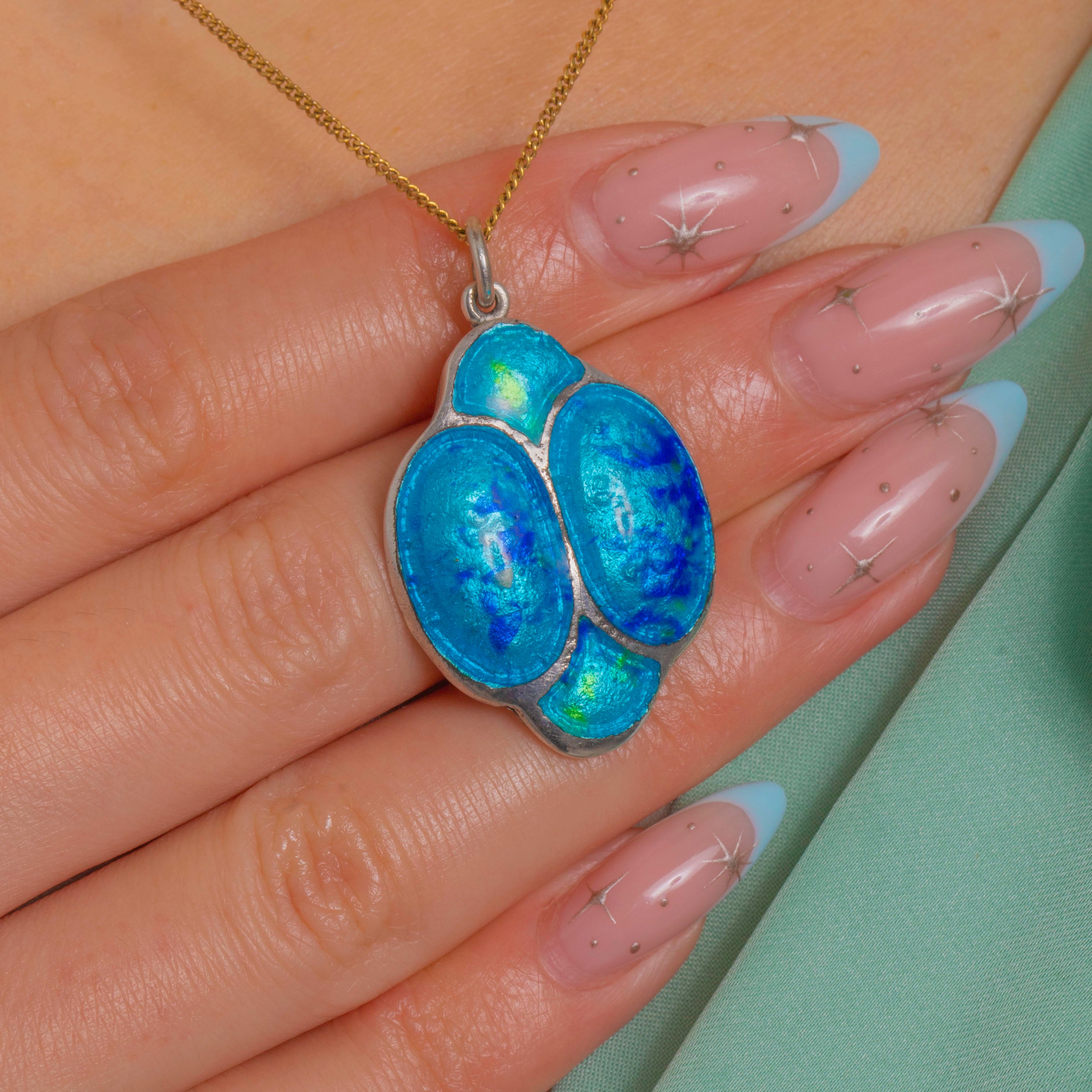 A striking Arts and Crafts Silver and Enamel pendant with a bold, sculptural presence. Four recessed Enamel cells are divided by raised Silver partitions, forming a stylised, biomorphic motif. The glossy Enamel shimmers in saturated turquoise and cobalt blues with lively green flashes, delivering a rich play of colour against the cool Silver frame.