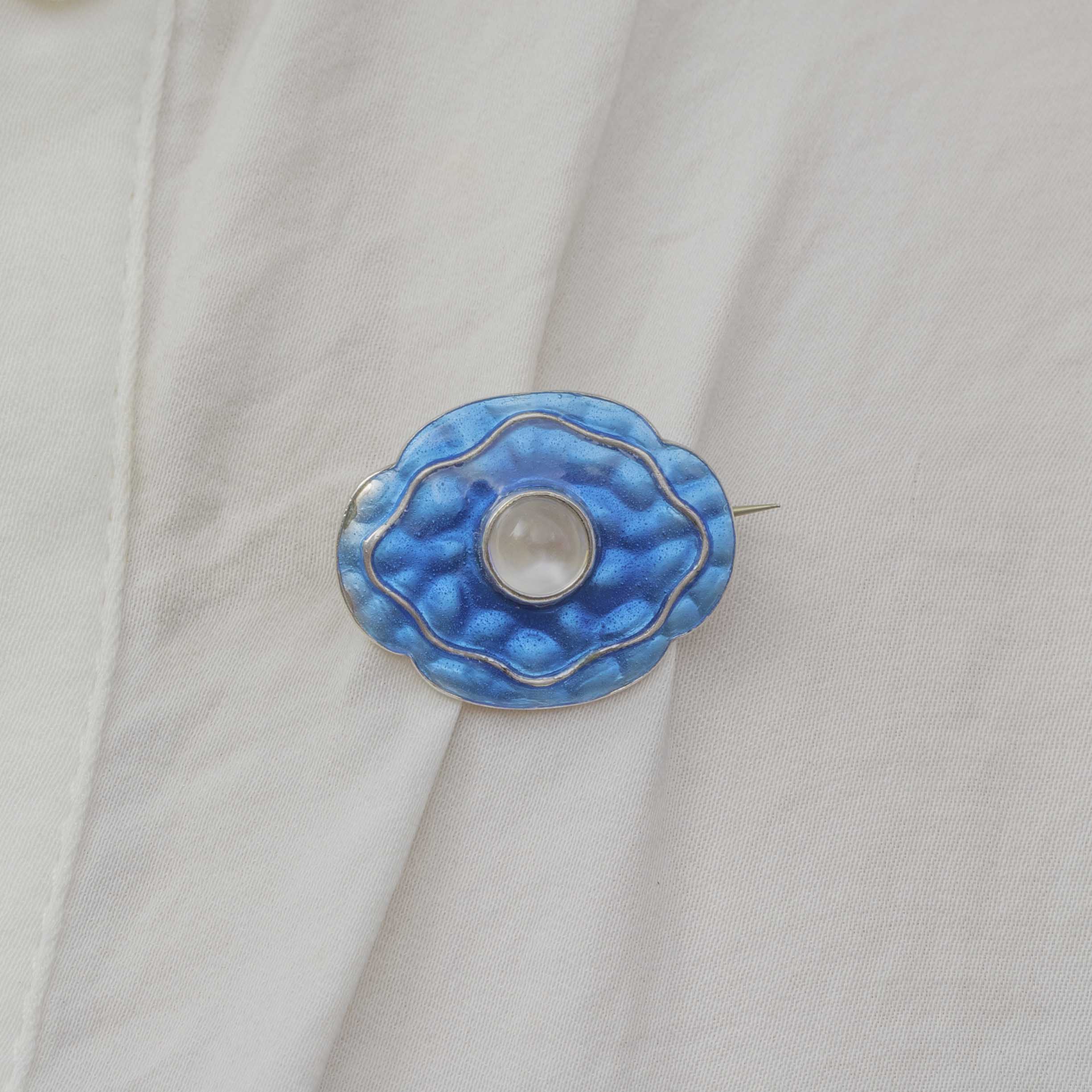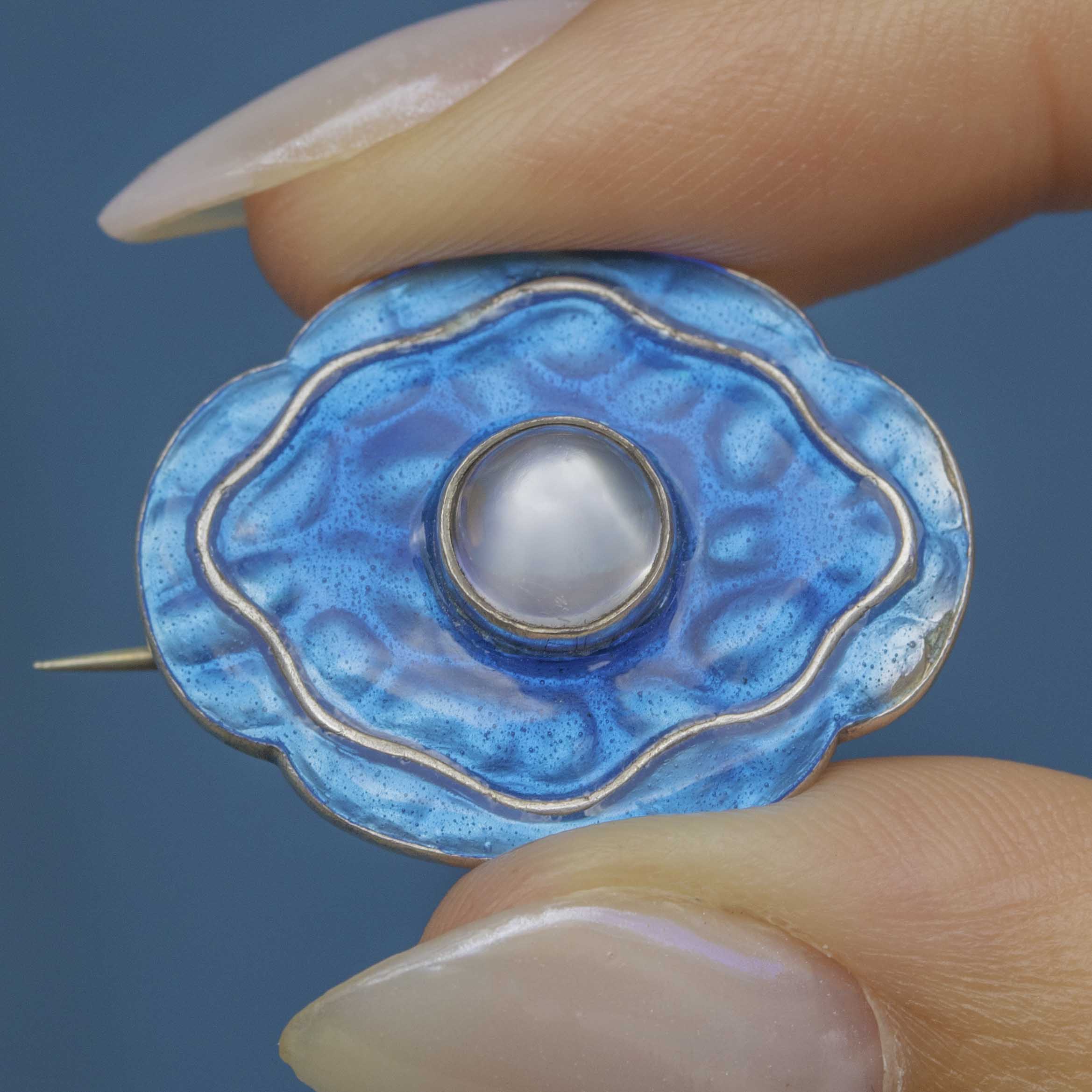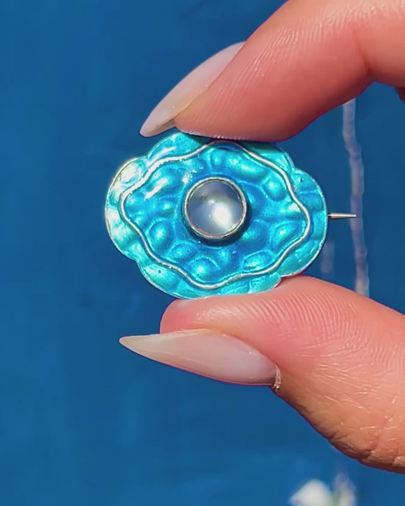 This vibrant Arts & Crafts blue Enamel brooch has a beautifully textured surface, creating a wonderful iridescent shimmer as it catches the light. In its centre sits an enchanting 0.60ct Moonstone cabochon with a gorgeous silvery adularescence, ensuring splendour from every angle.