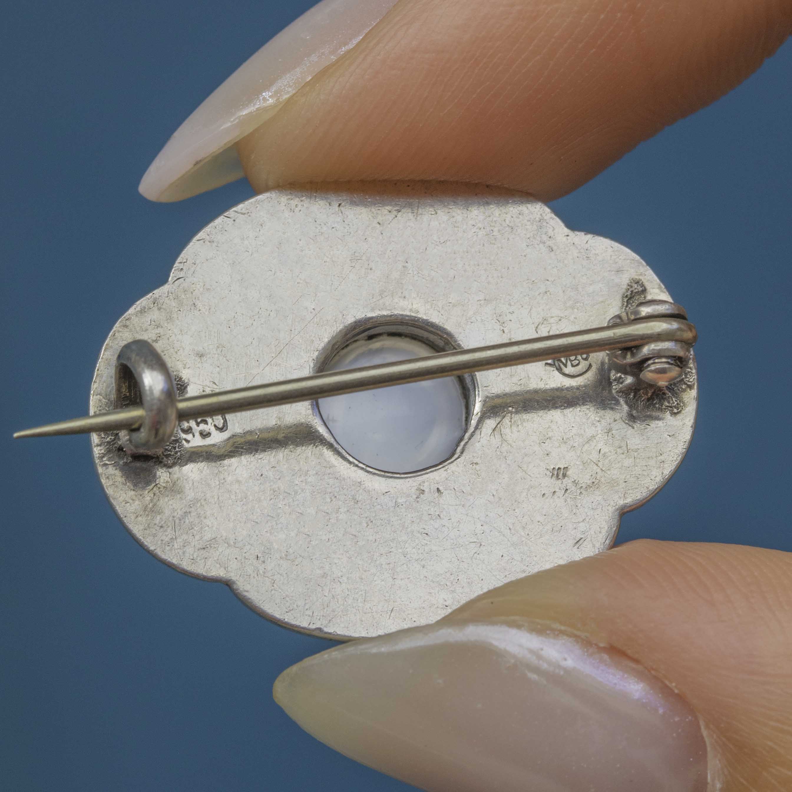 VERY GOOD-EXCELLENT: The Moonstone is beautiful, free from any scratches or nibbles, and is set securely within its bezel. The Enamel is vibrant and saturated, and though there is some minor wear present on the sides, this is expected with age. The brooch back is on the looser side, though it is still functional. With a nice patina having built on the Silver, this brooch simply radiates antique charm!
