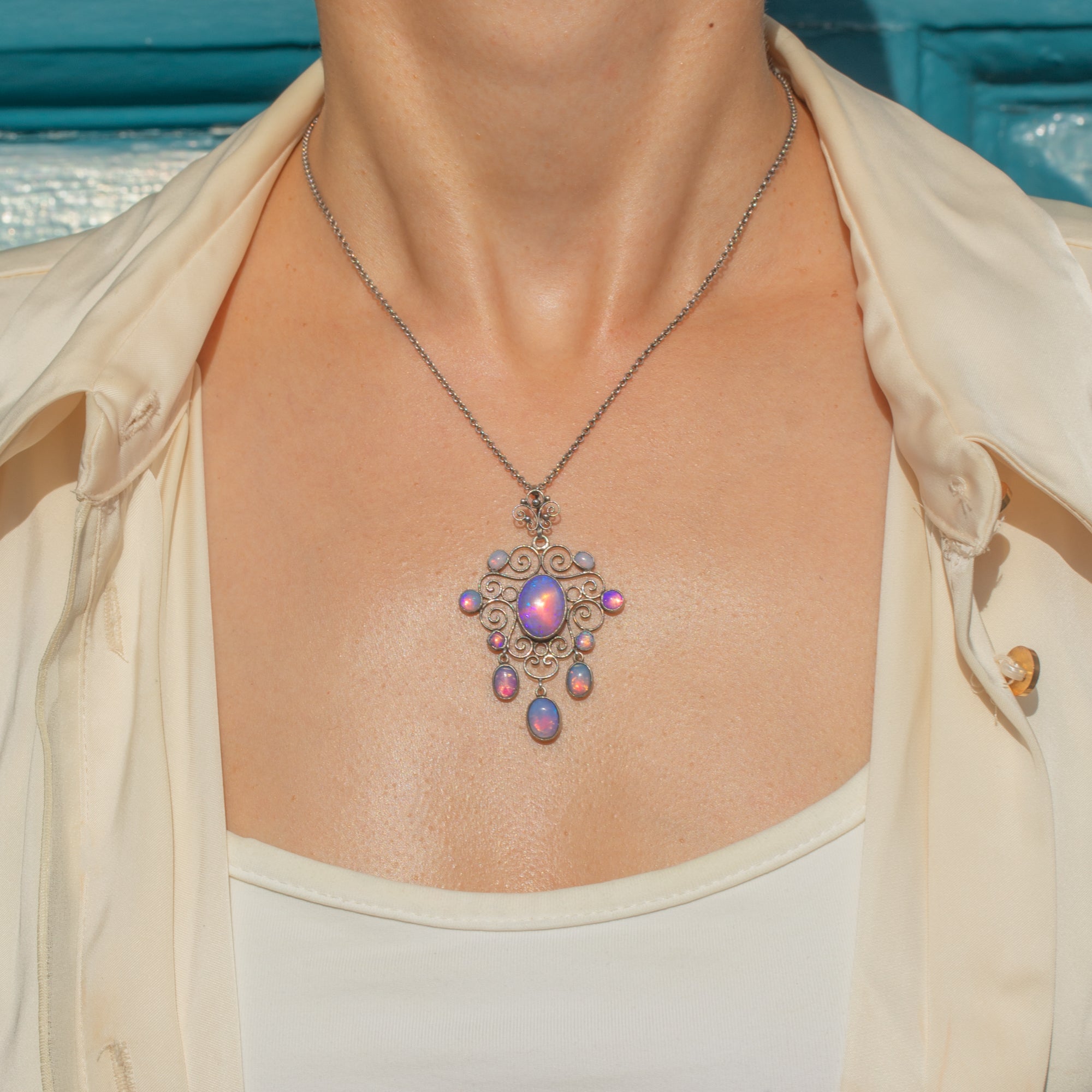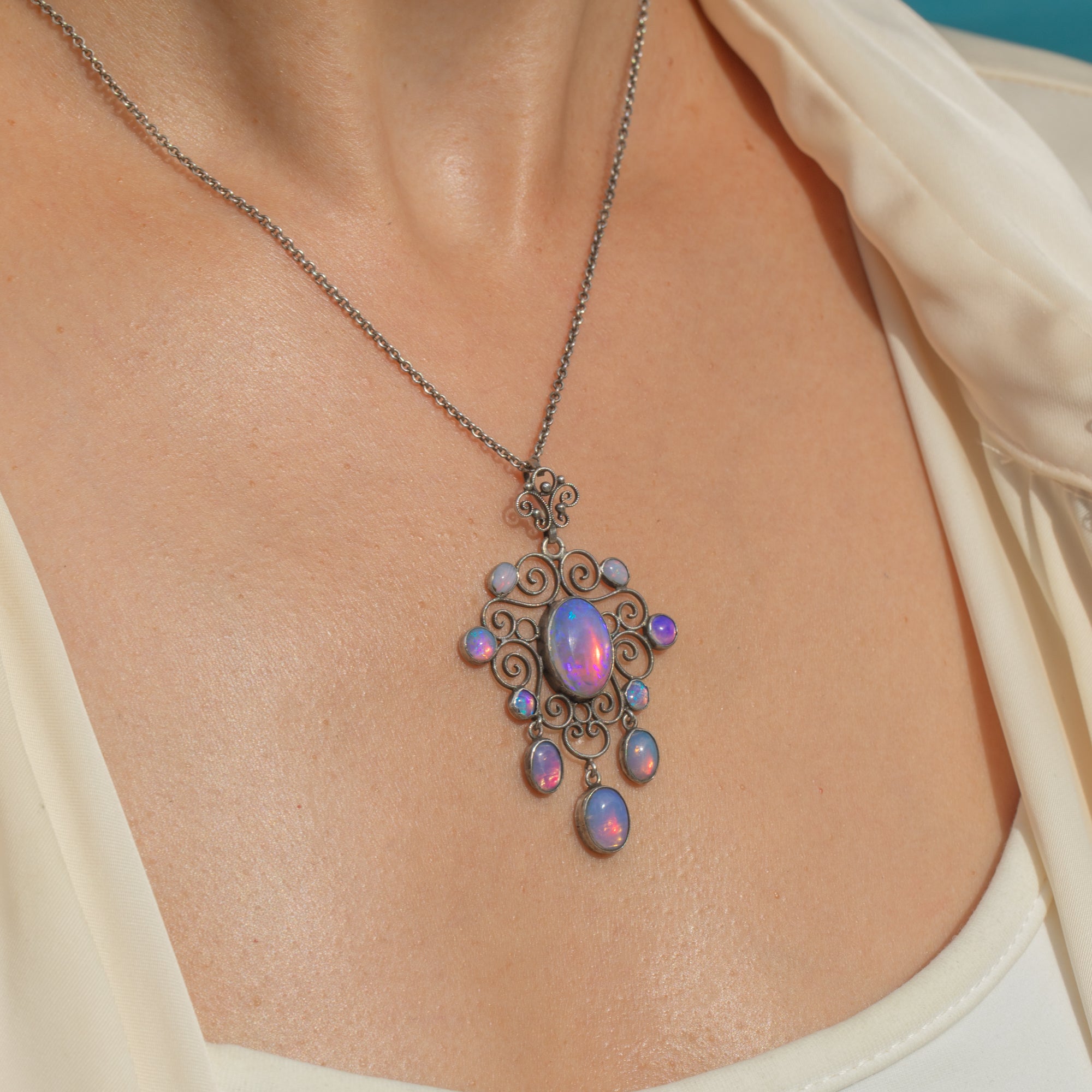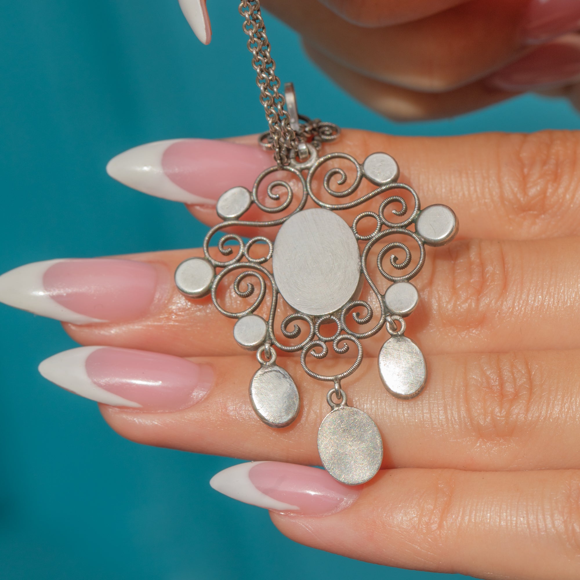 Made in Silver and suspended from an 18" antique Silver chain, the pendant’s generous proportions give it a striking presence while remaining elegant and wearable. A beautiful example of early 20th-century artistry in excellent condition.