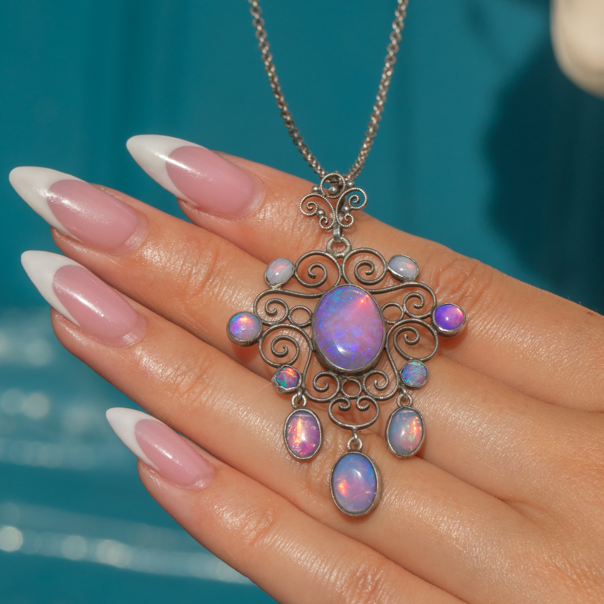 This Arts & Crafts pendant is set with captivating “Dragonsbreath” Glass cabochons, glowing with pink tones and a characteristic iridescent flash. The large 10 x 13mm central stone is framed by an ornate arrangement of smaller pink glass gems, graduating in size for a harmonious, handcrafted look.