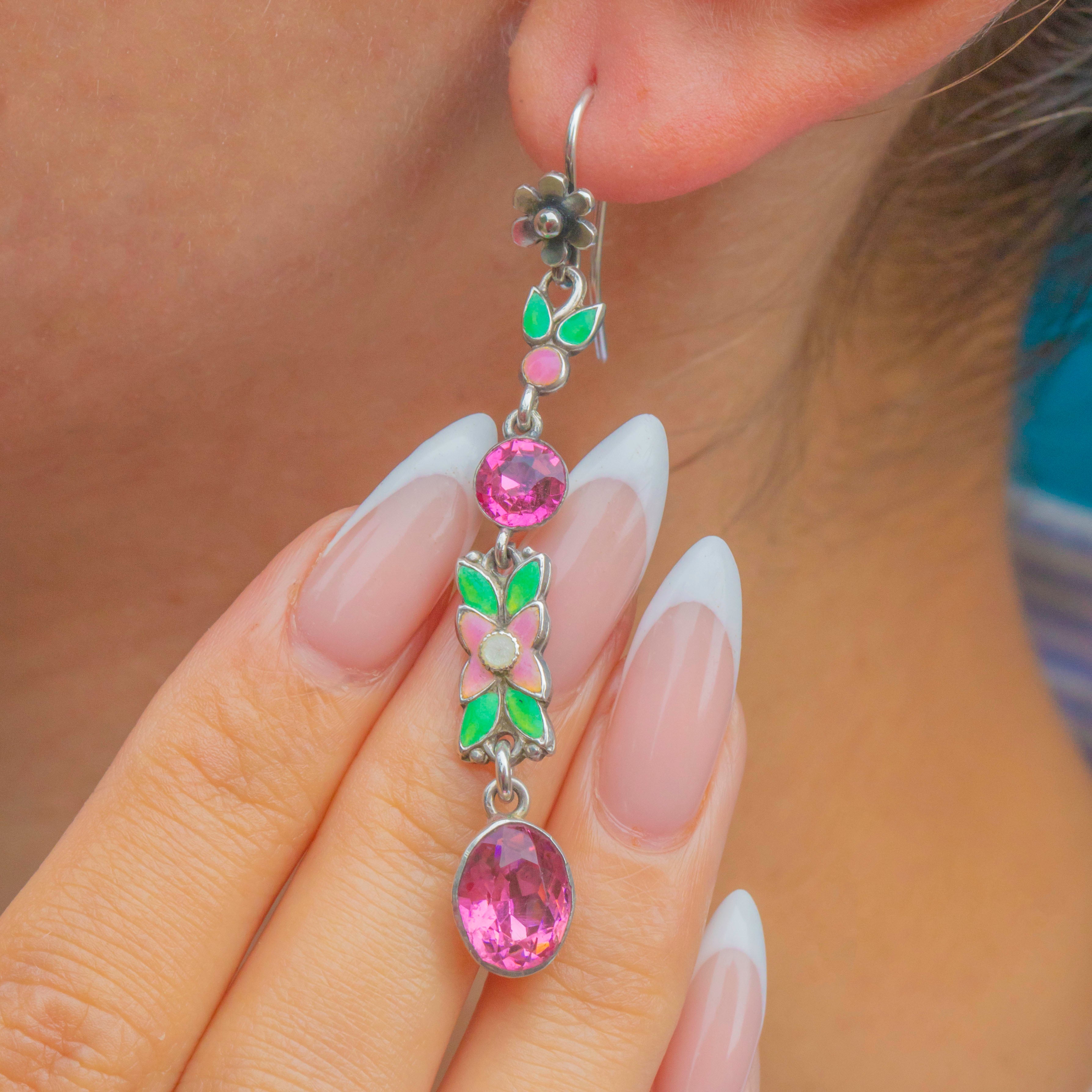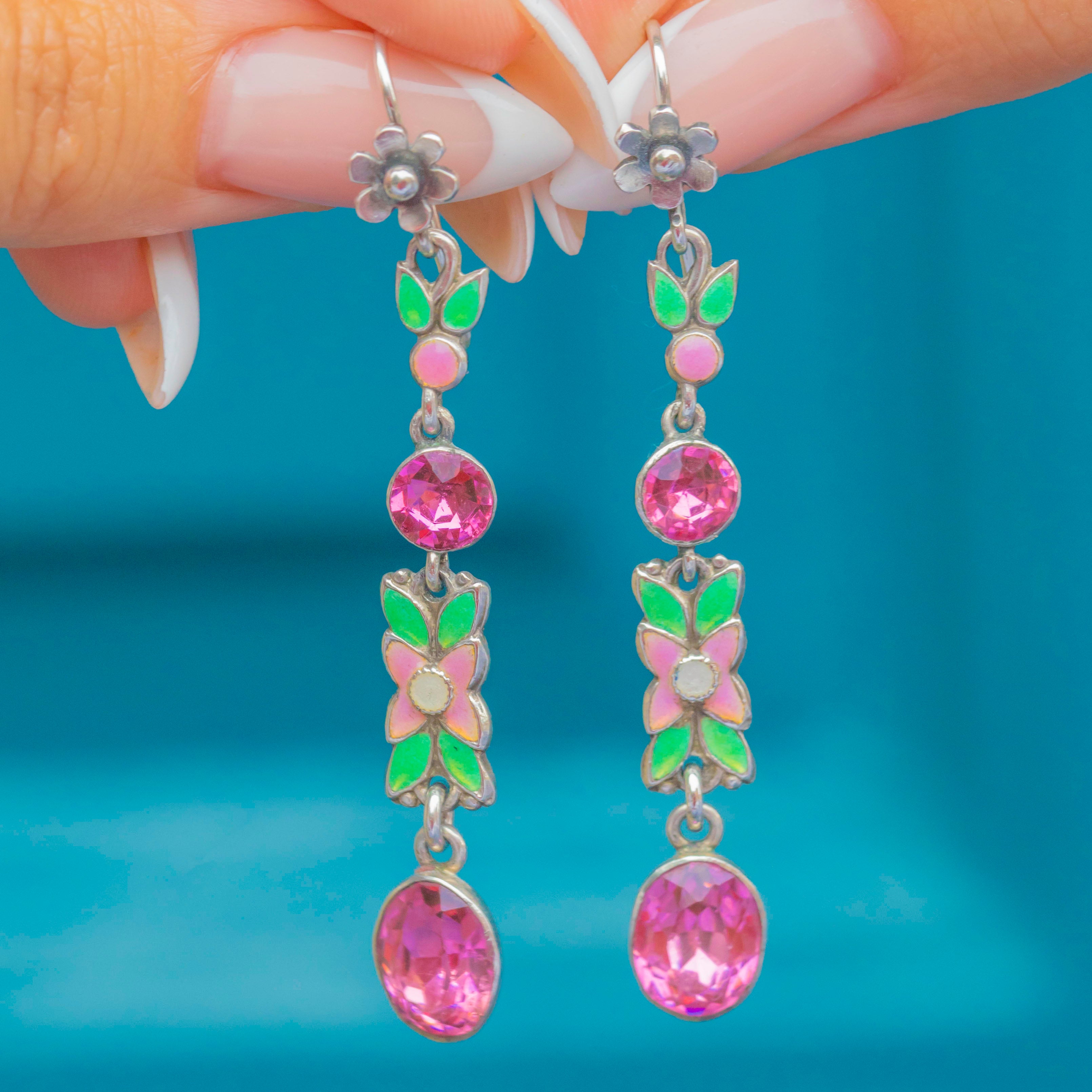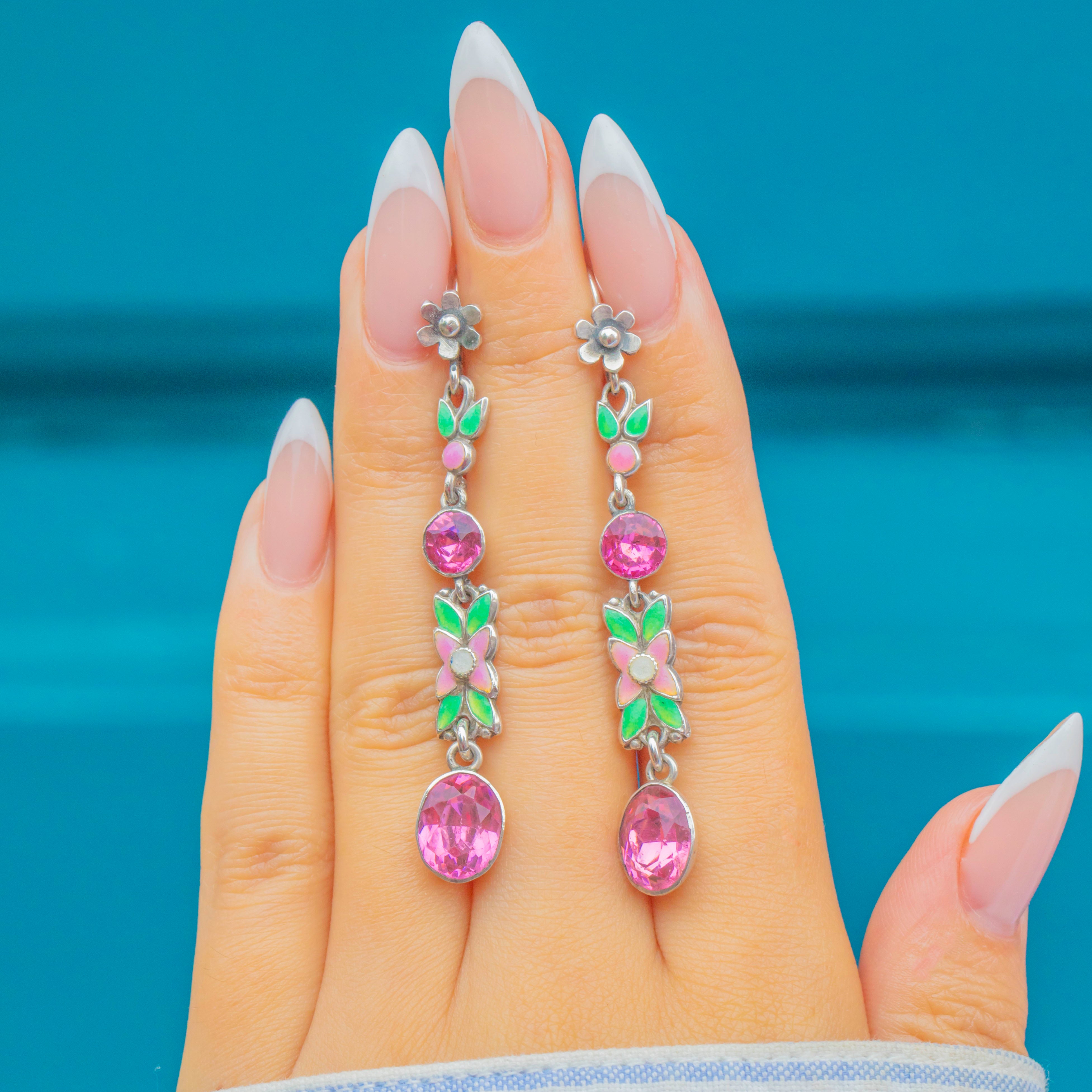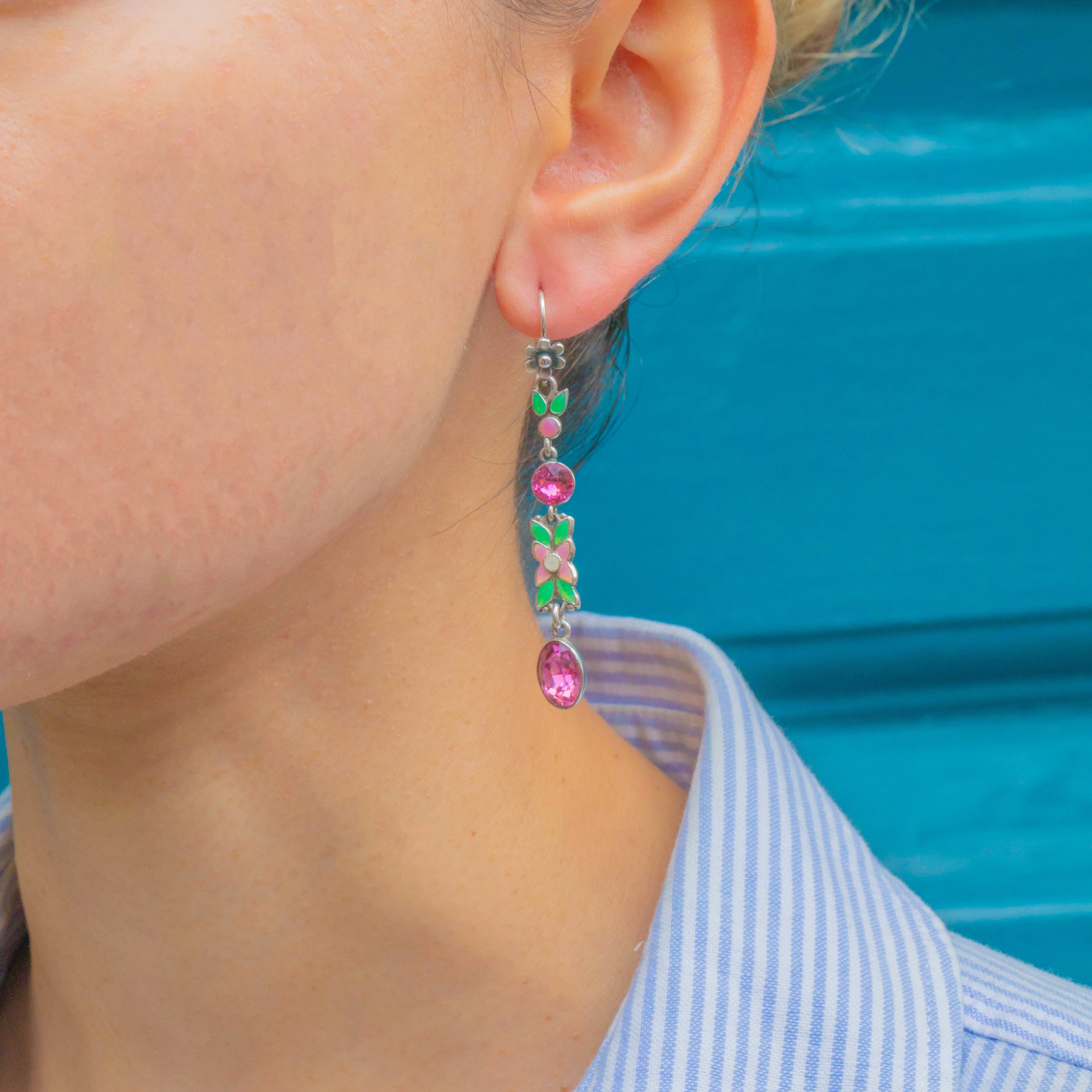 Suspended from sweet silver flower tops, the earrings graduate into a delicate arrangement of enamel leaves and petals, punctuated by bright pink round and oval Paste stones. Their feminine palette and fluid drop design make them a wonderful statement piece, perfectly balanced between elegance and whimsy.