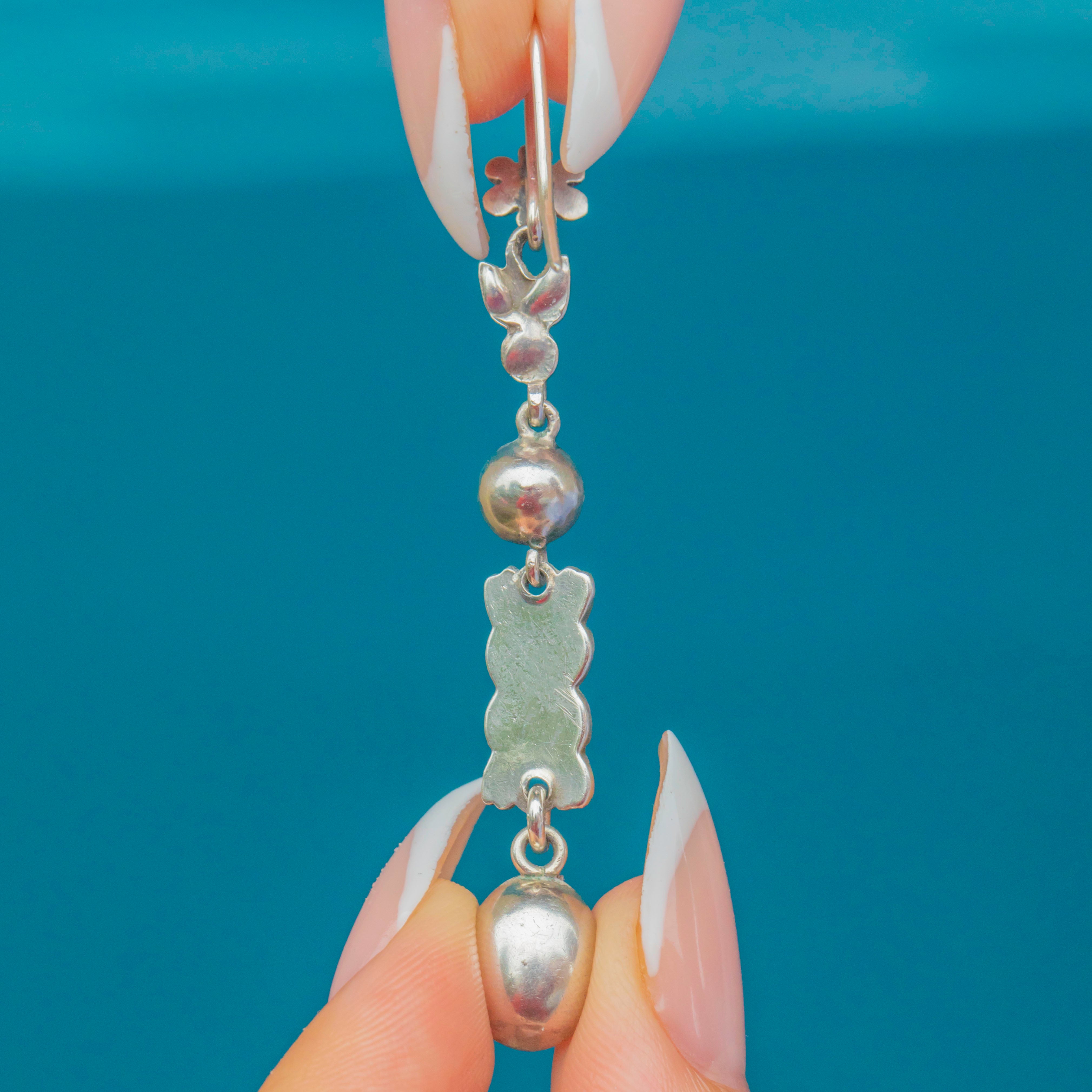 These stunning Bernard Instone earrings are a vibrant example of the Arts and Crafts movement, showcasing the celebrated silversmith’s talent for bold design and meticulous detail. They feature a charming floral motif in pastel pink and green enamel, highlighted by sparkling pink Paste gemstones that radiate with joyful colour.
