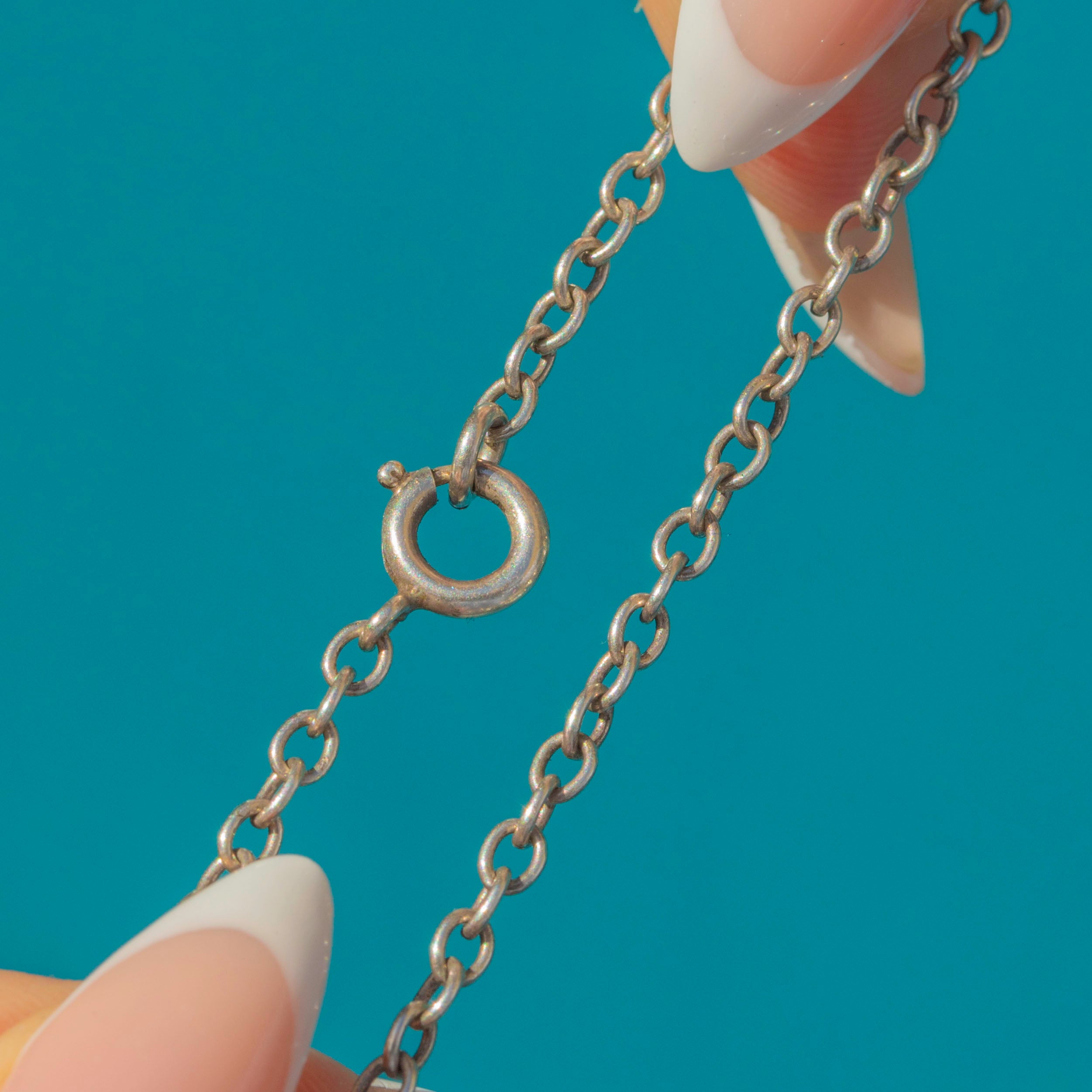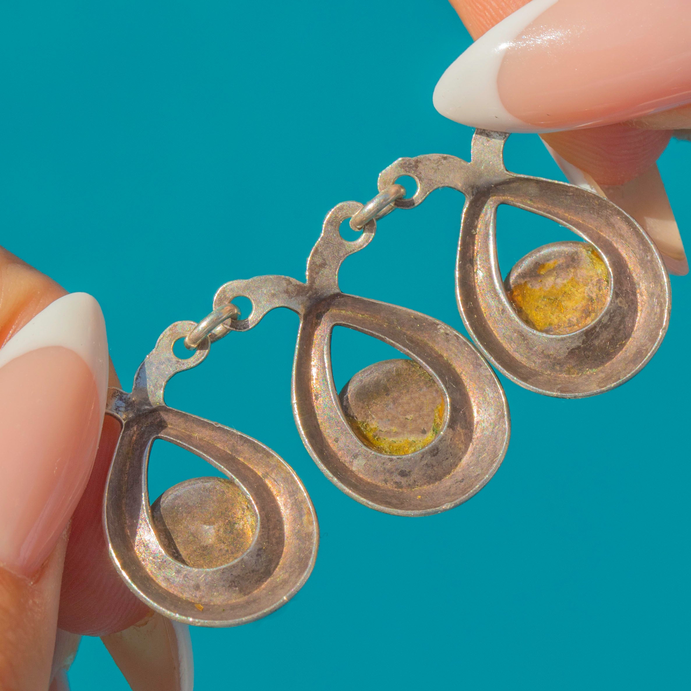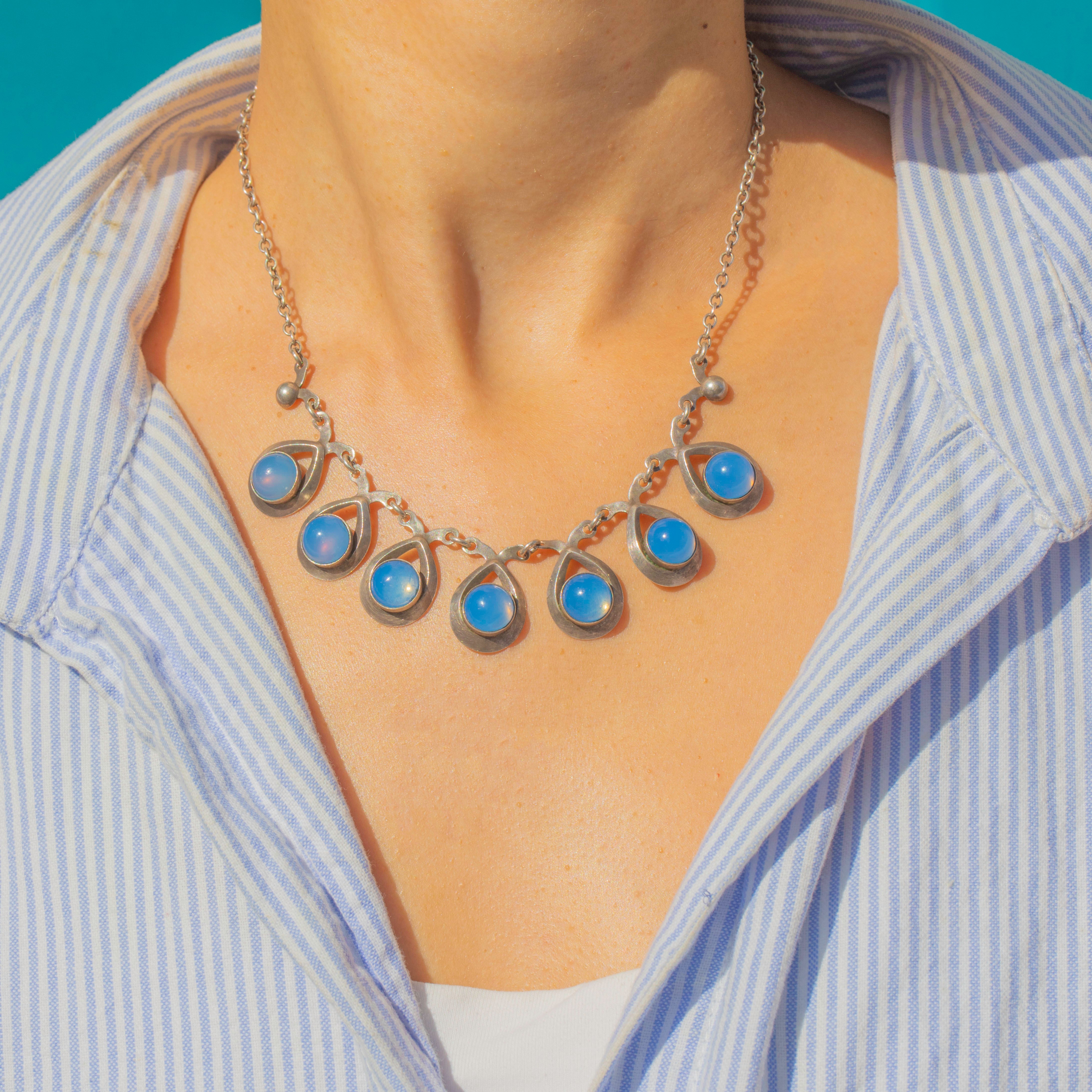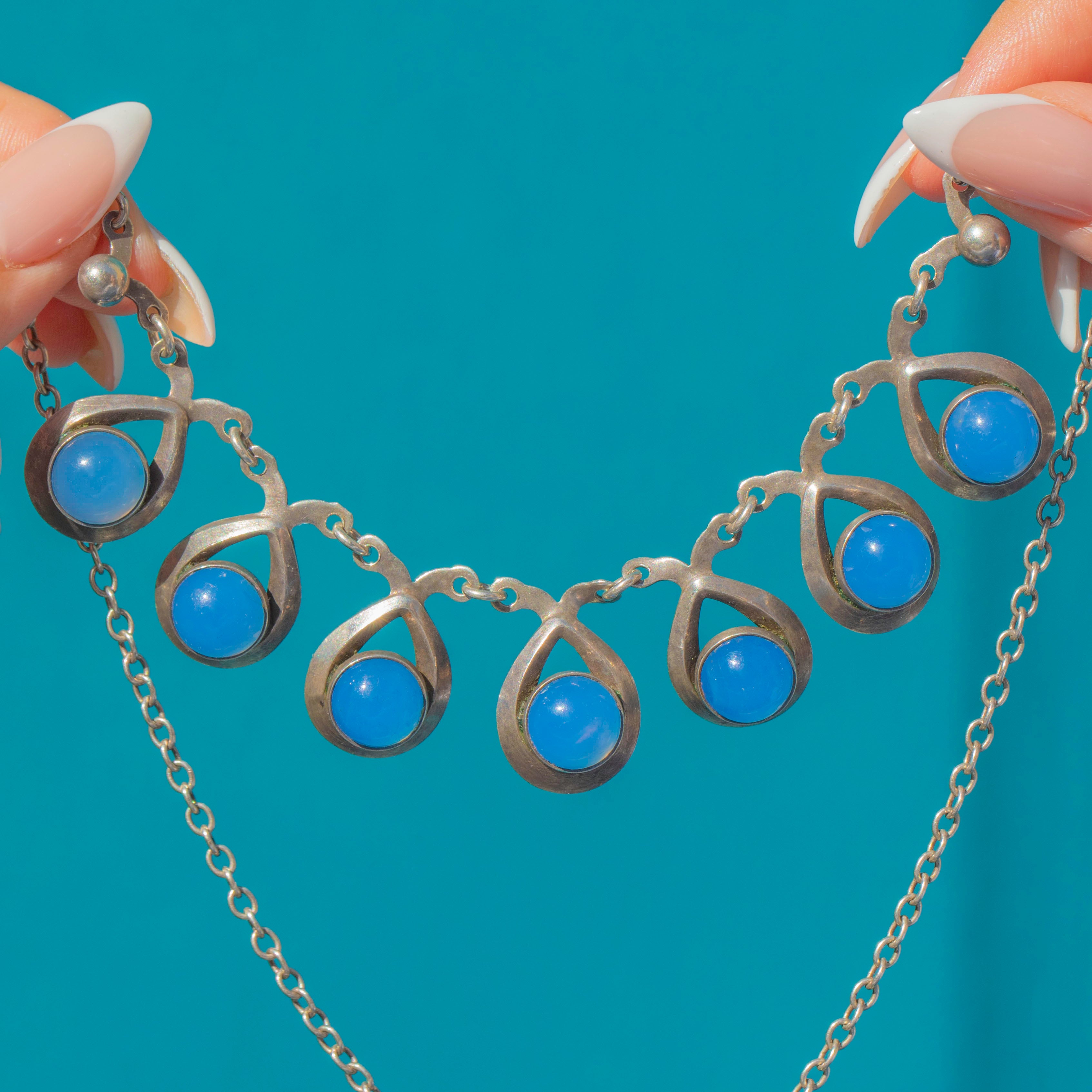 A classic Arts & Crafts necklace in Sterling Silver set with seven luminous Chalcedony cabochons. Each gemstone sits within a flowing open teardrop, linked in a rhythmic garland that sits beautifully at the collarbone. The stones glow with that soft, watery blue that the movement loved, and the silver has a pleasing, even patina.