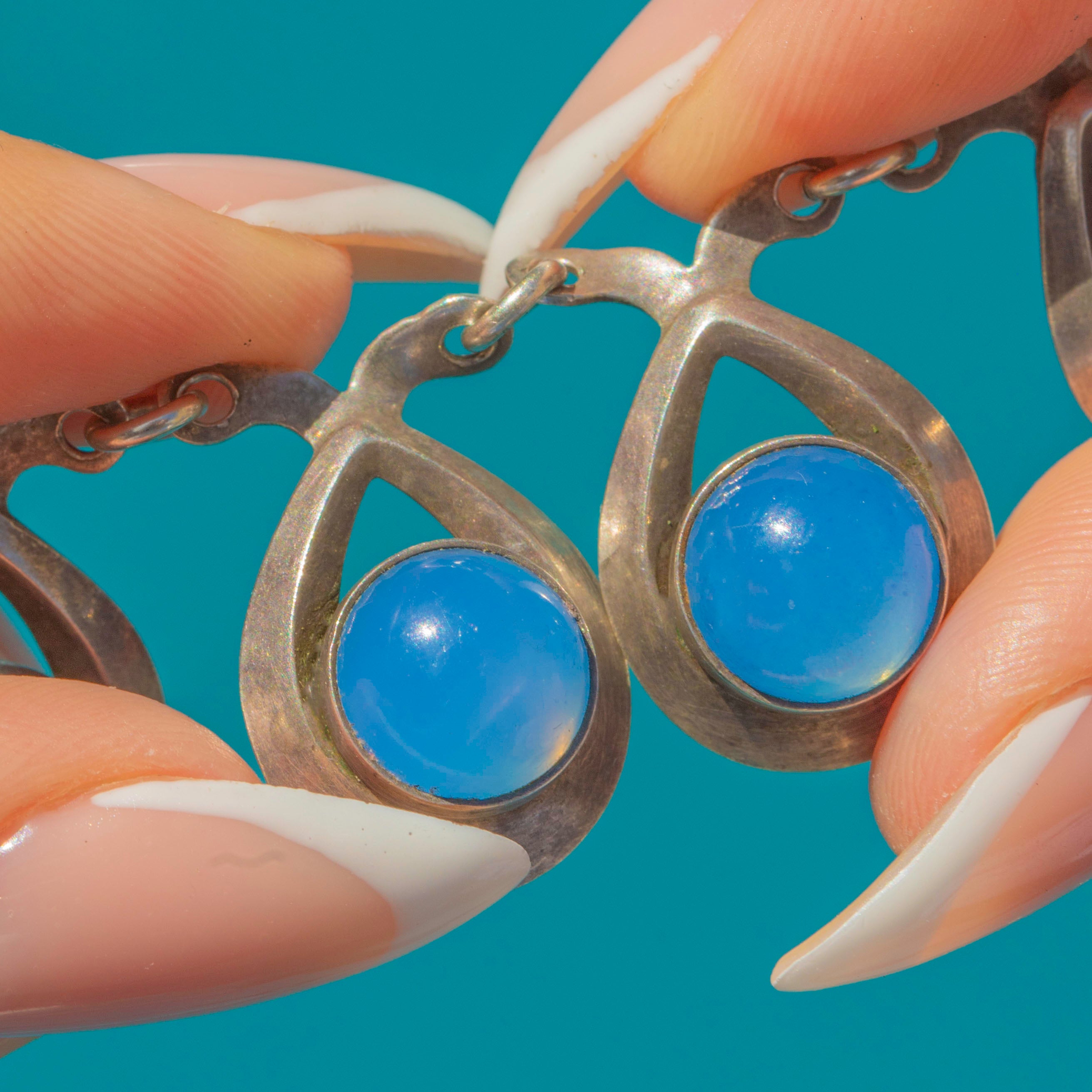 EXCELLENT: Chalcedony cabochons are bright and secure with no chips noted. Silver shows a pleasing, even patina with minimal age-related wear. Links and catches are sound and ready to wear.