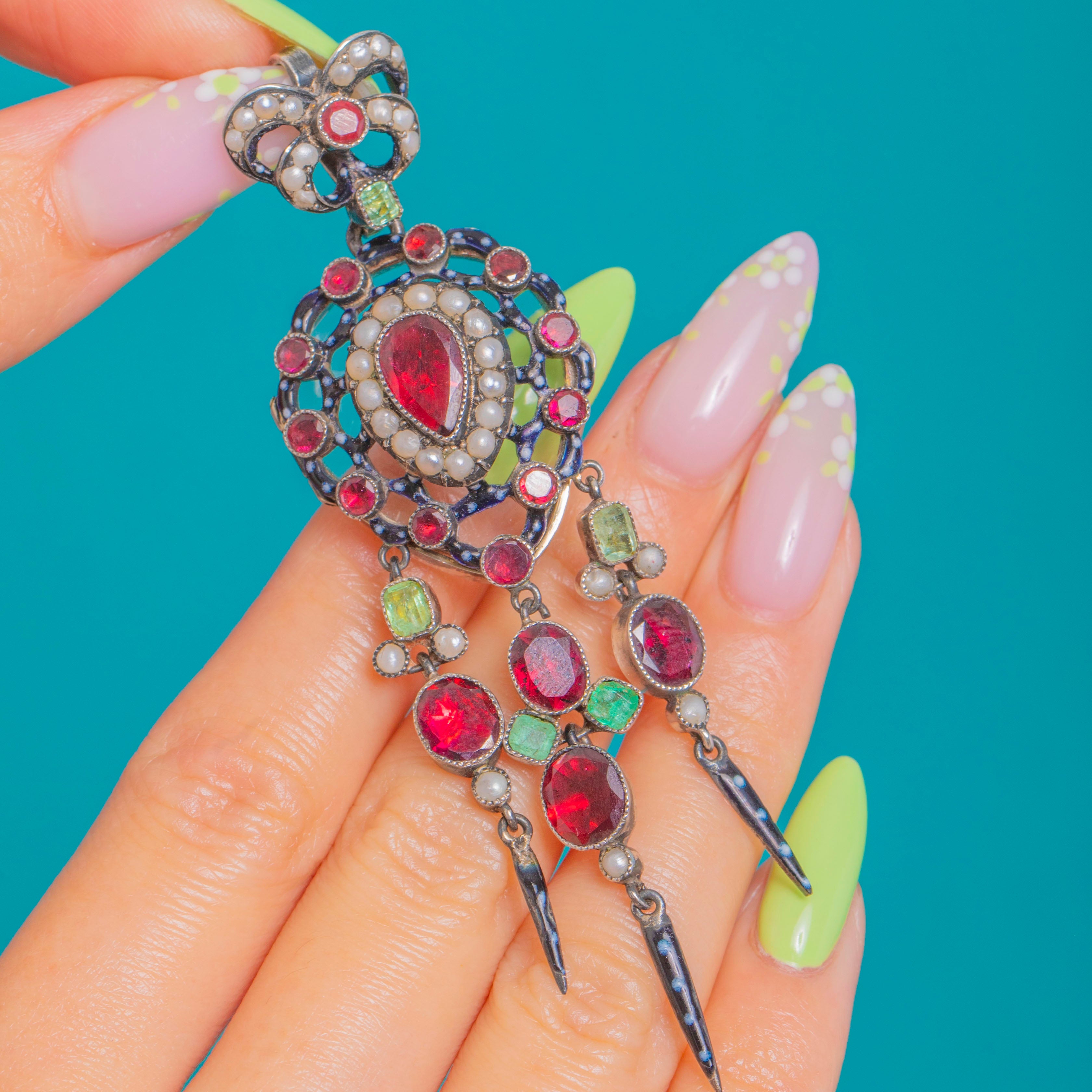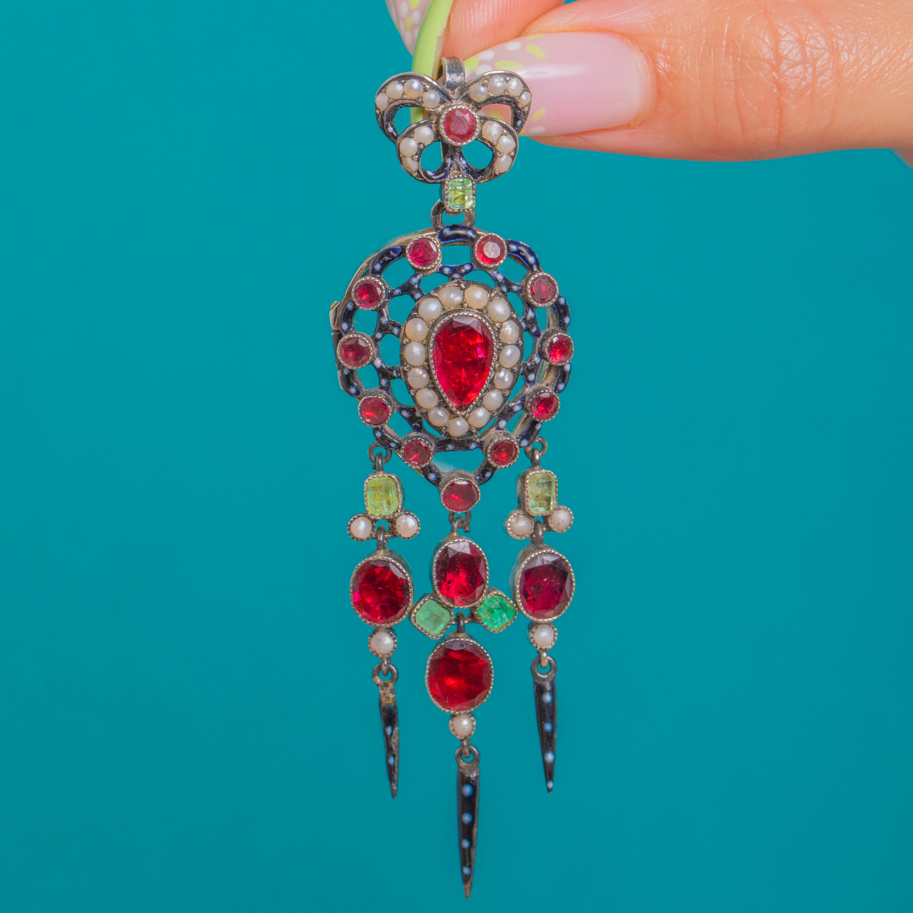 色彩、質感、動きに満ちた贅沢なオーストリア=ハンガリー帝国時代のシルバーペンダント。中央には洋梨型にカットされたガーネットが輝き、その周囲をクリーミーなシードパールとさらに深紅のガーネットが取り囲み、装飾的なリボンの下に美しく配されています。下部には三連の可動式ジランドールドロップが揺れ動き、それぞれが先細りのエナメル装飾スパイクで締めくくられ、ドラマティックかつエレガントな印象を与えます。