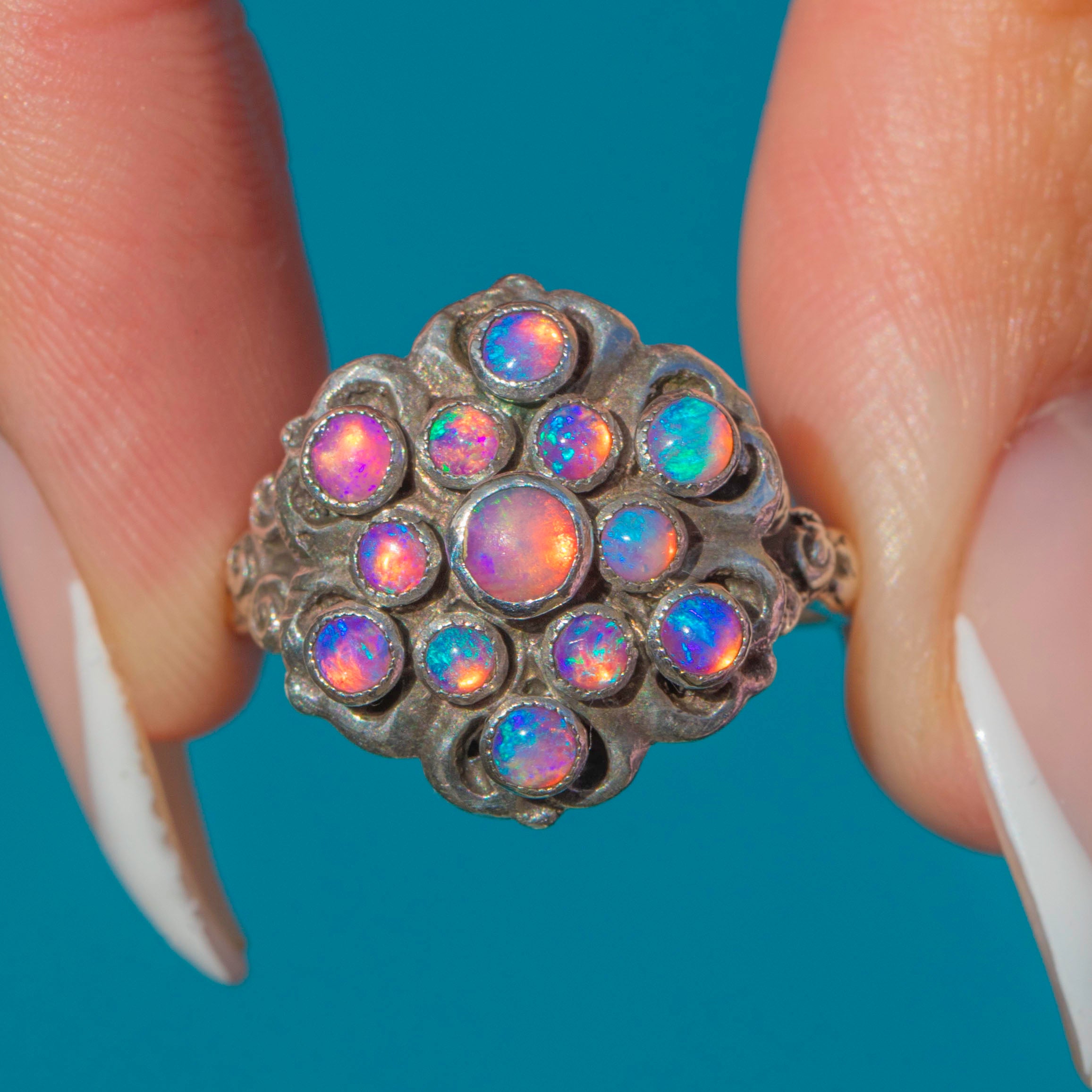EXCELLENT: The Opaline cabochons are all secure and display strong colour play with no noticeable chips or abrasions. The silver setting and band show only light surface wear in keeping with age, with decorative details remaining well-defined. This ring has been well cared for and remains in excellent antique condition.