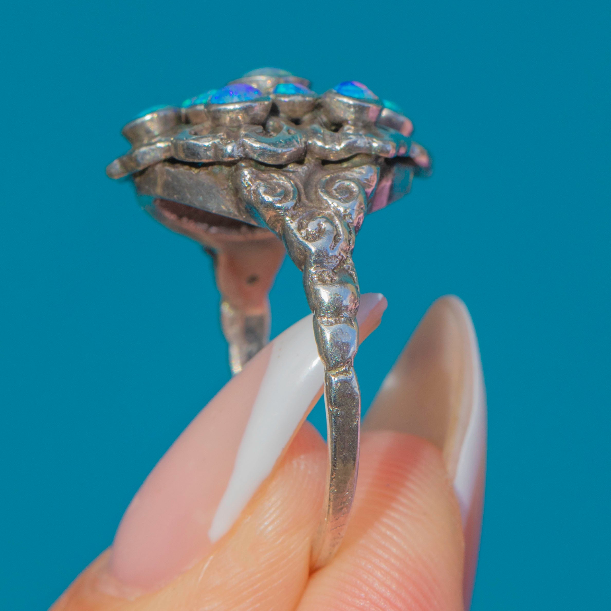 Its distinctive craftsmanship and luminous Opaline cabochons make this ring a wonderful statement piece, and will instantly add a touch of antique charm to your attire.