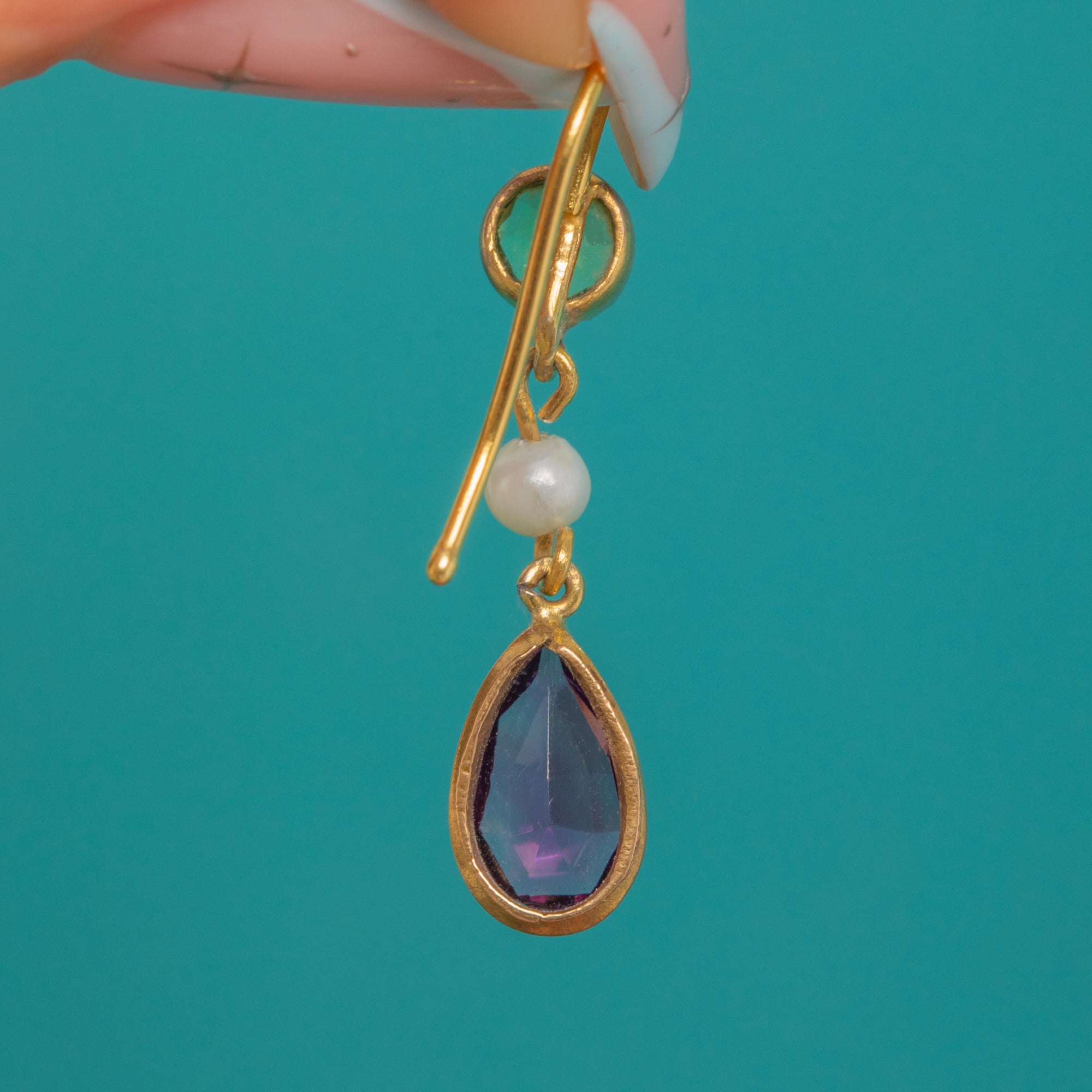 9ct Gold Suffragette Amethyst Peridot Pearl Drop Earrings