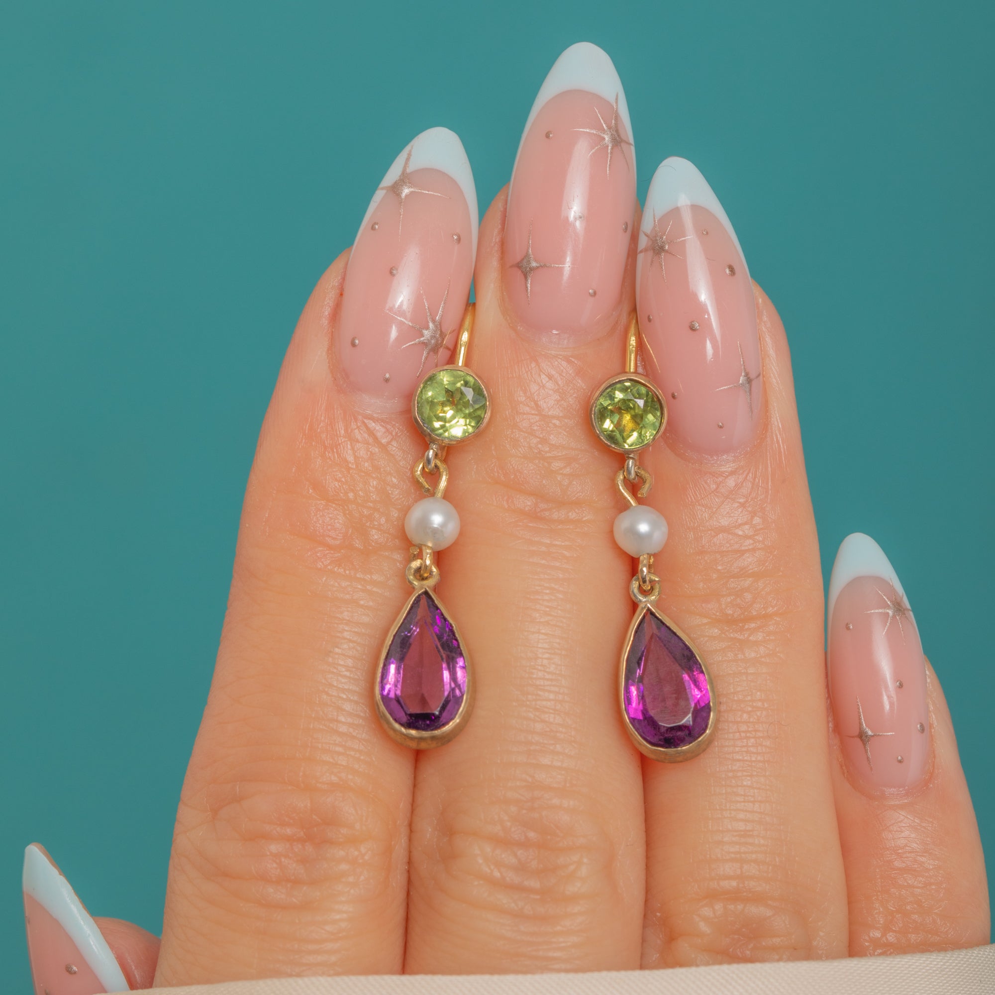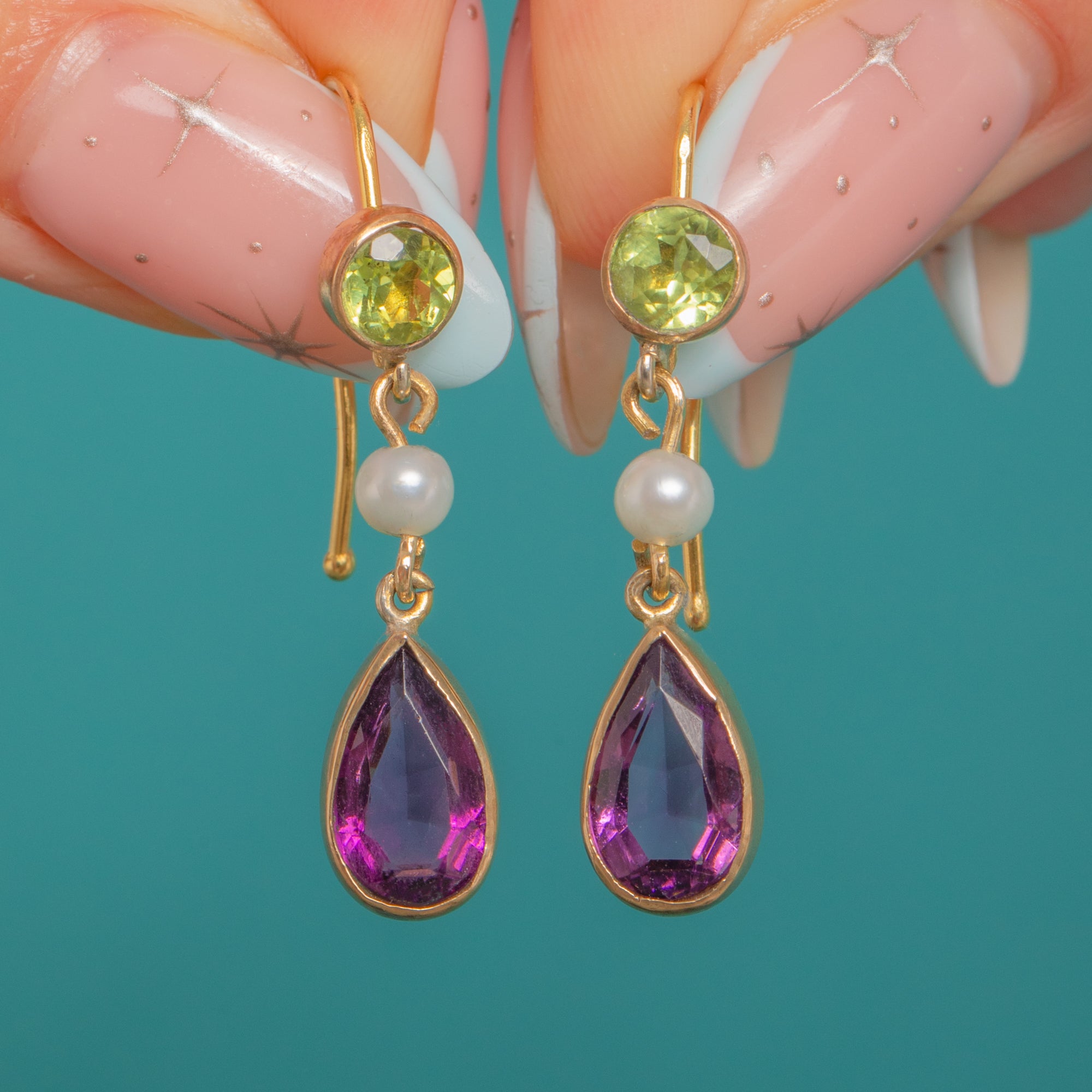 A timeless pair of Edwardian Suffragette drop earrings, finely crafted in warm 9ct Gold. Lively round Peridots crown each drop, offset by a petite white Pearl spacer and finished with vivid pear‑cut Amethysts in sleek, smooth bezel settings. The articulated three‑part design lends elegant movement, with the classic green‑white‑violet palette glowing beautifully against the Gold.