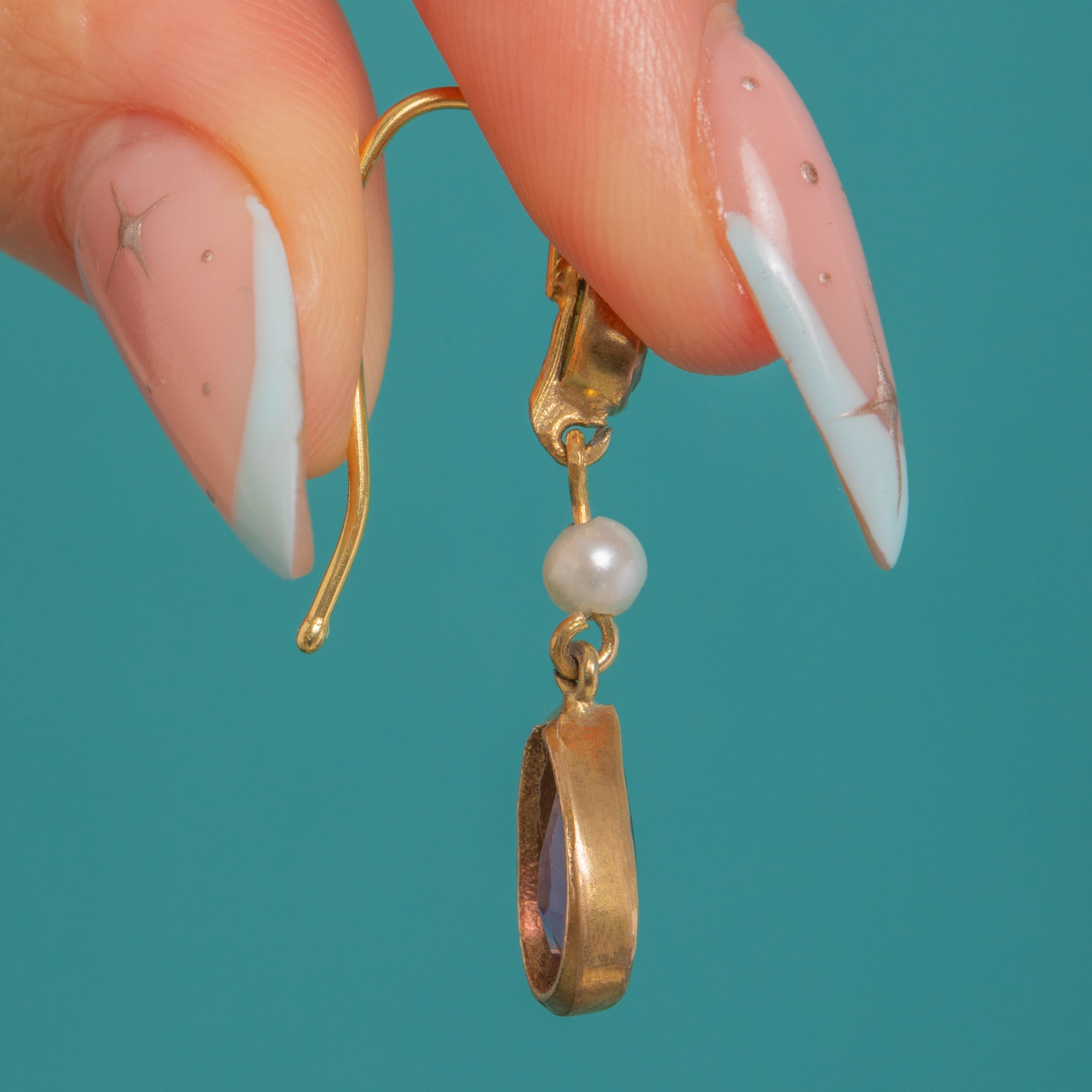 EXCELLENT: The gemstones are bright with crisp facets and no visible chips or abrasions; Pearls are smooth and lustrous. Bezel settings and articulated links are secure with a clean polish. Only minimal, age-consistent surface wear is present, suggesting the earrings have been very well cared for.