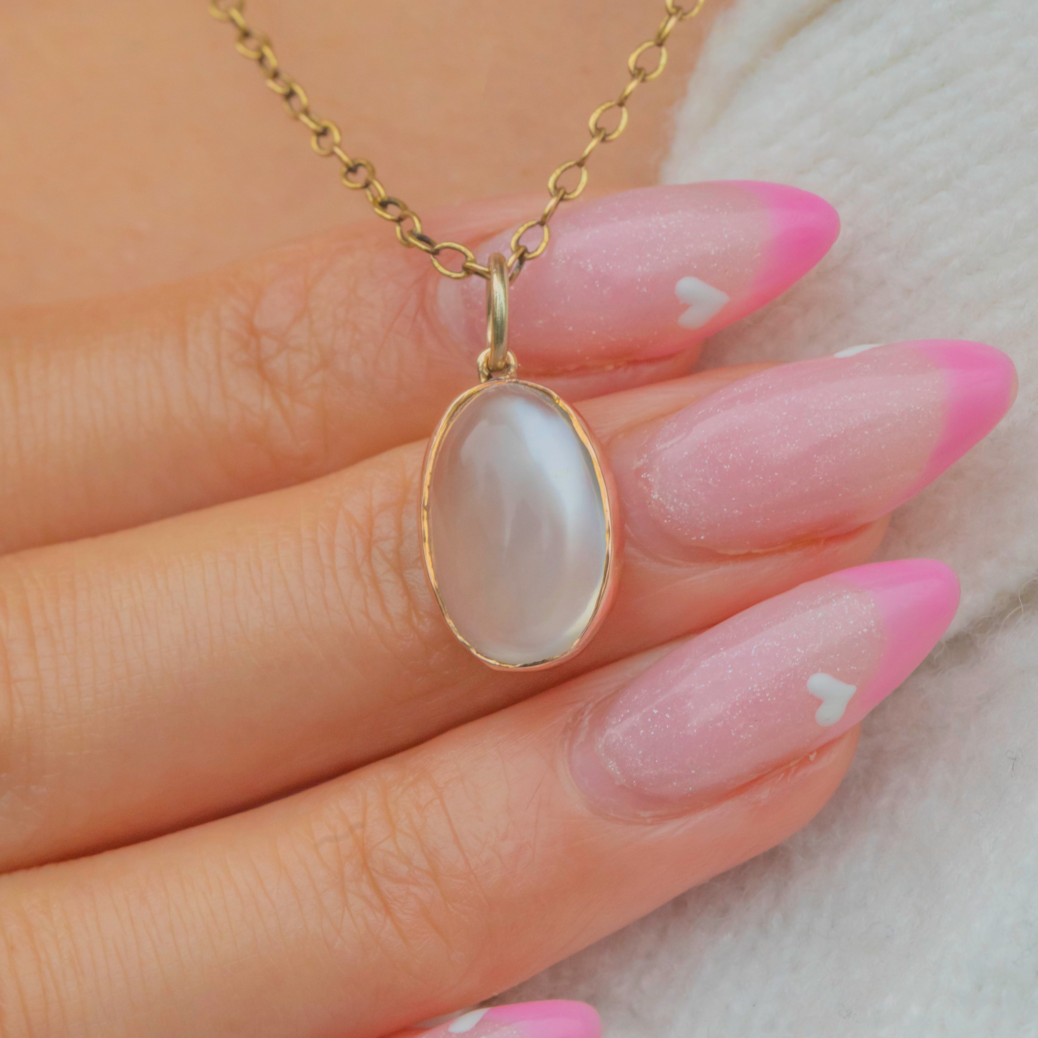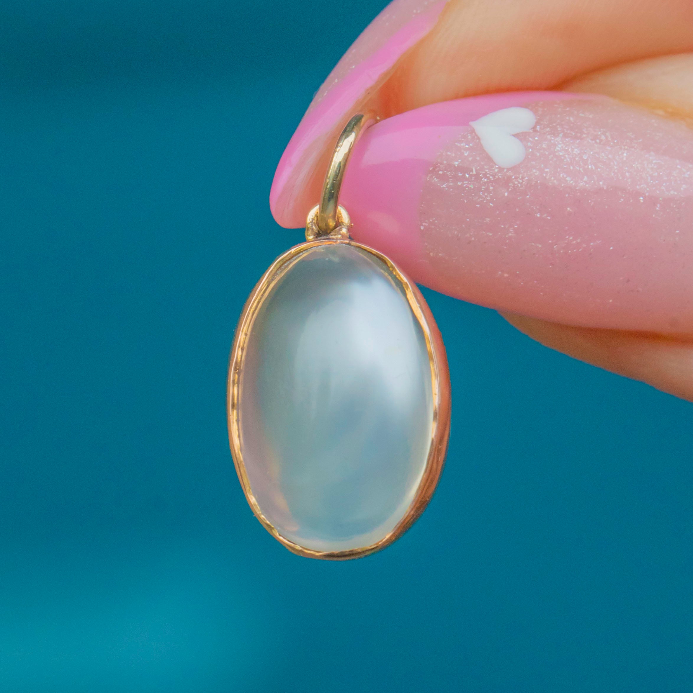 This glowing 1.64ct antique Moonstone charm radiates with ethereal beauty. The oval cabochon shimmers with a soft blue sheen, set simply in 9ct Gold to highlight the gem’s natural adularescence.