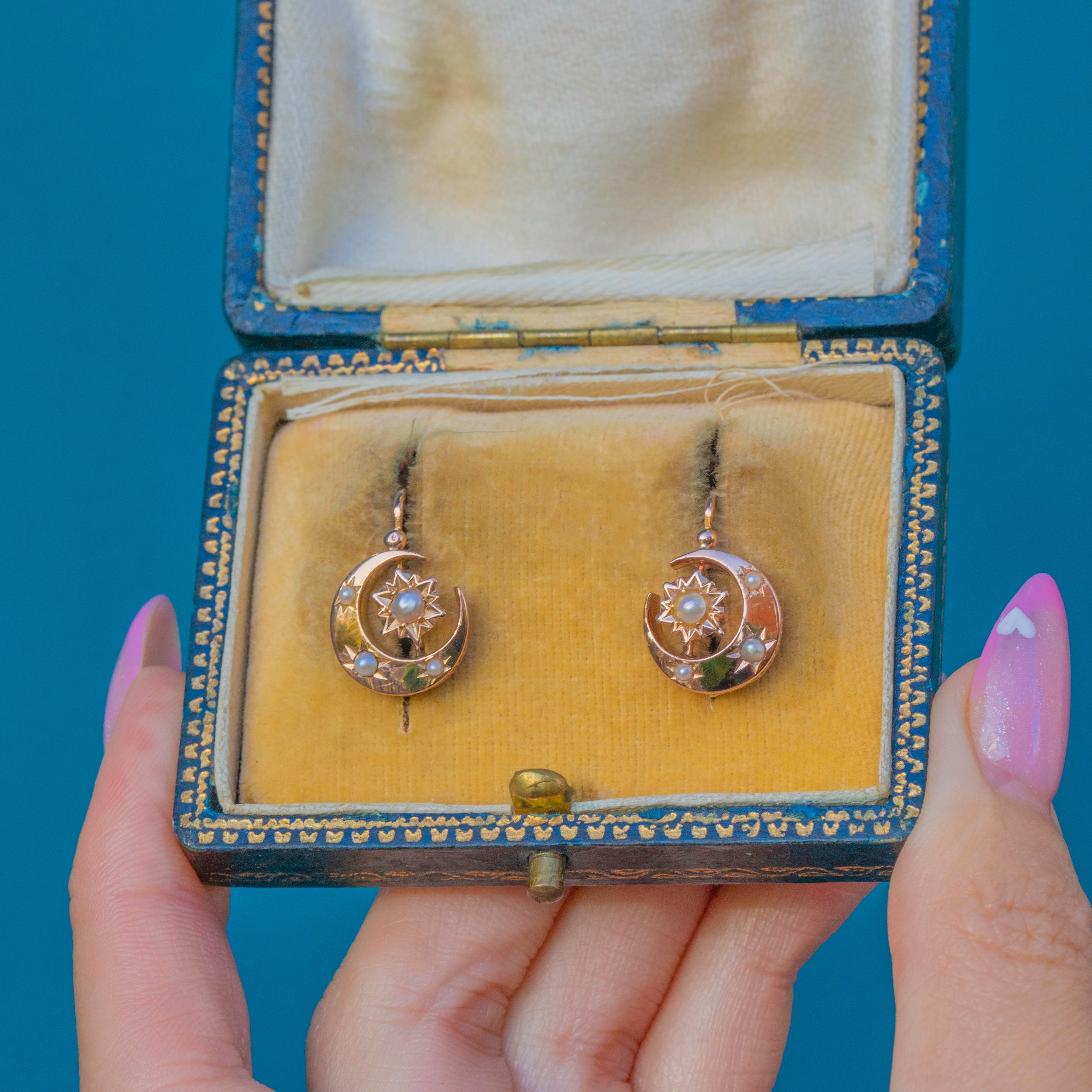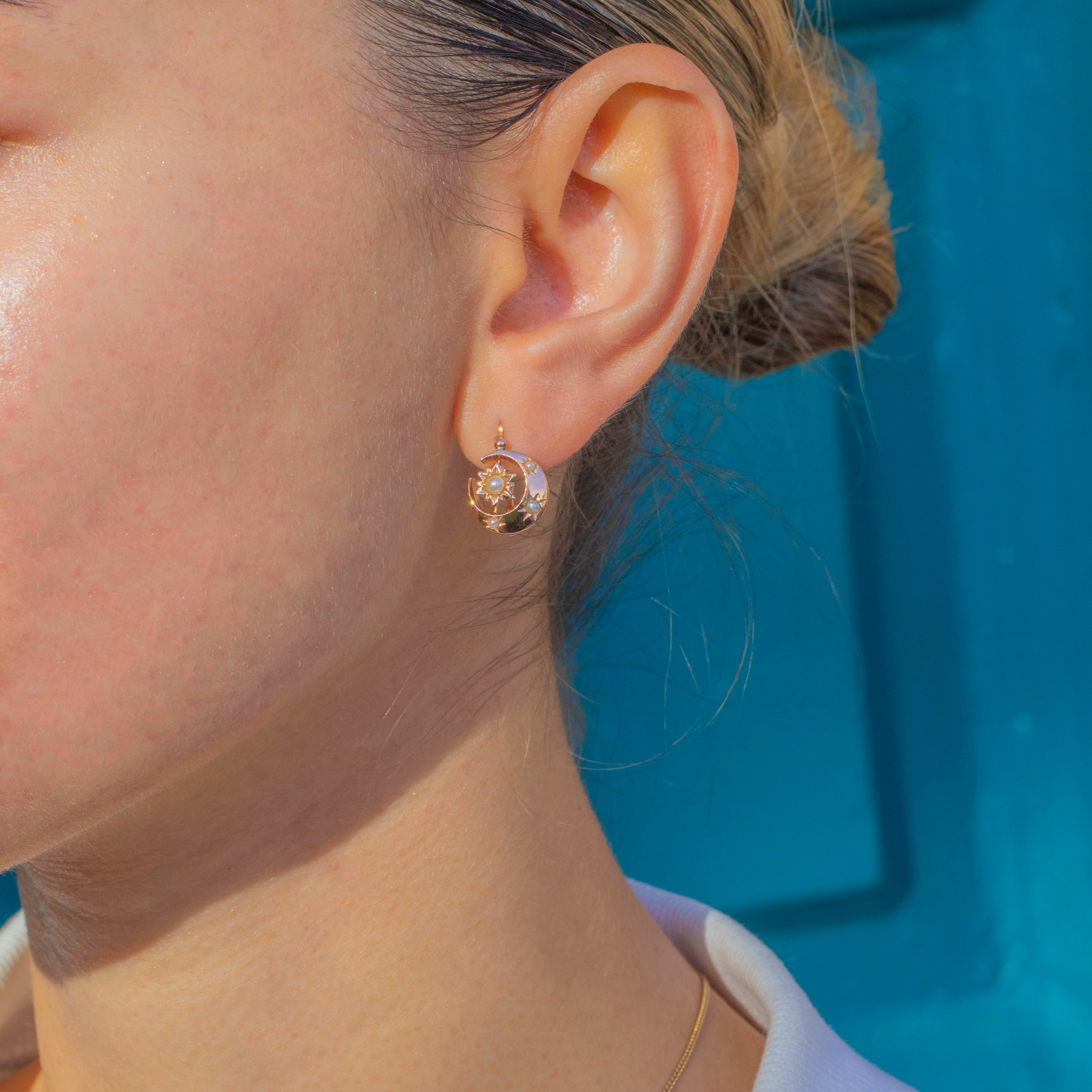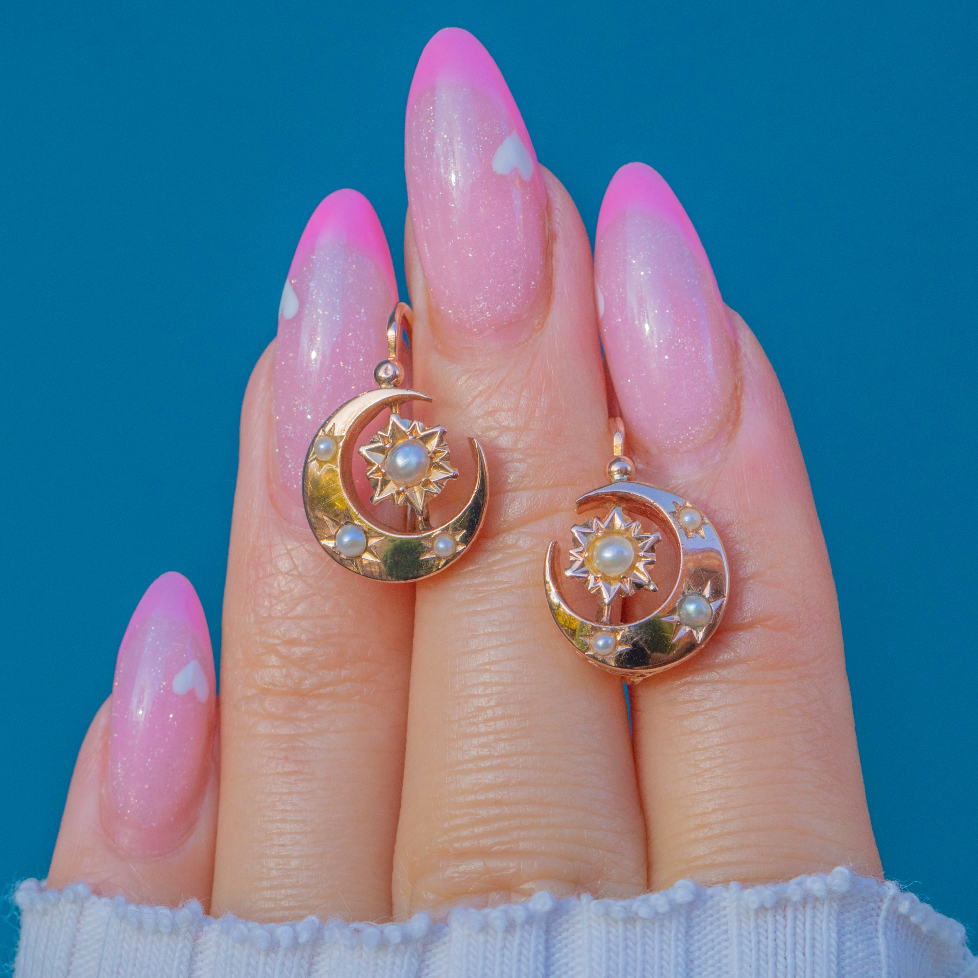 Delicate and celestial, these French earrings are crafted in 18ct Gold and designed as crescent moons adorned with tiny stars, each set with a lustrous natural Pearl. The central stars glimmer with a soft, romantic glow, symbolising light, guidance, and love.