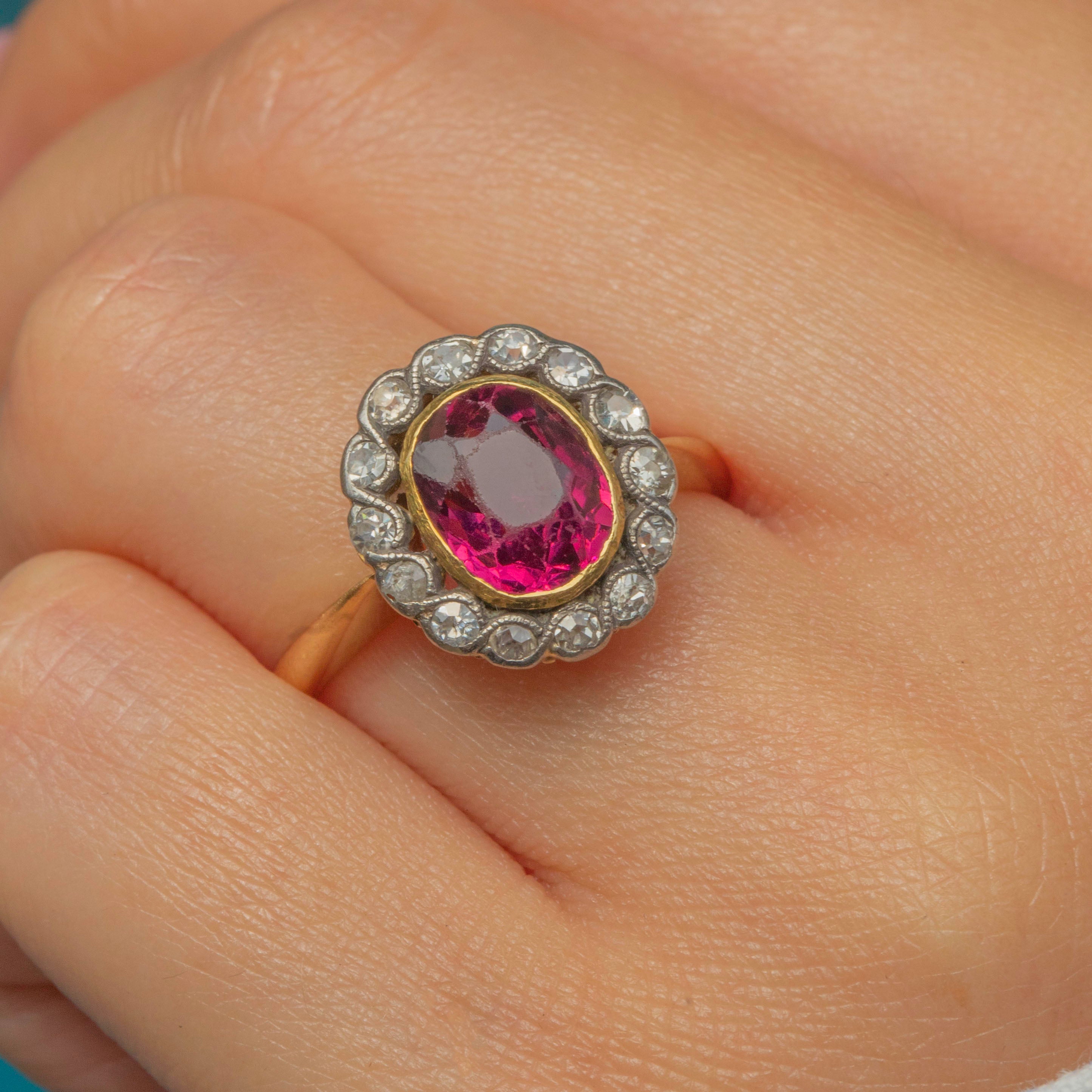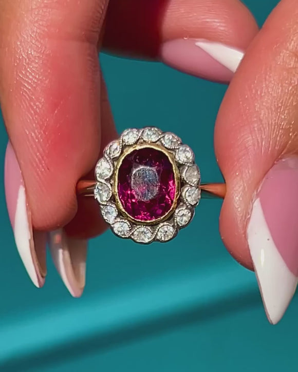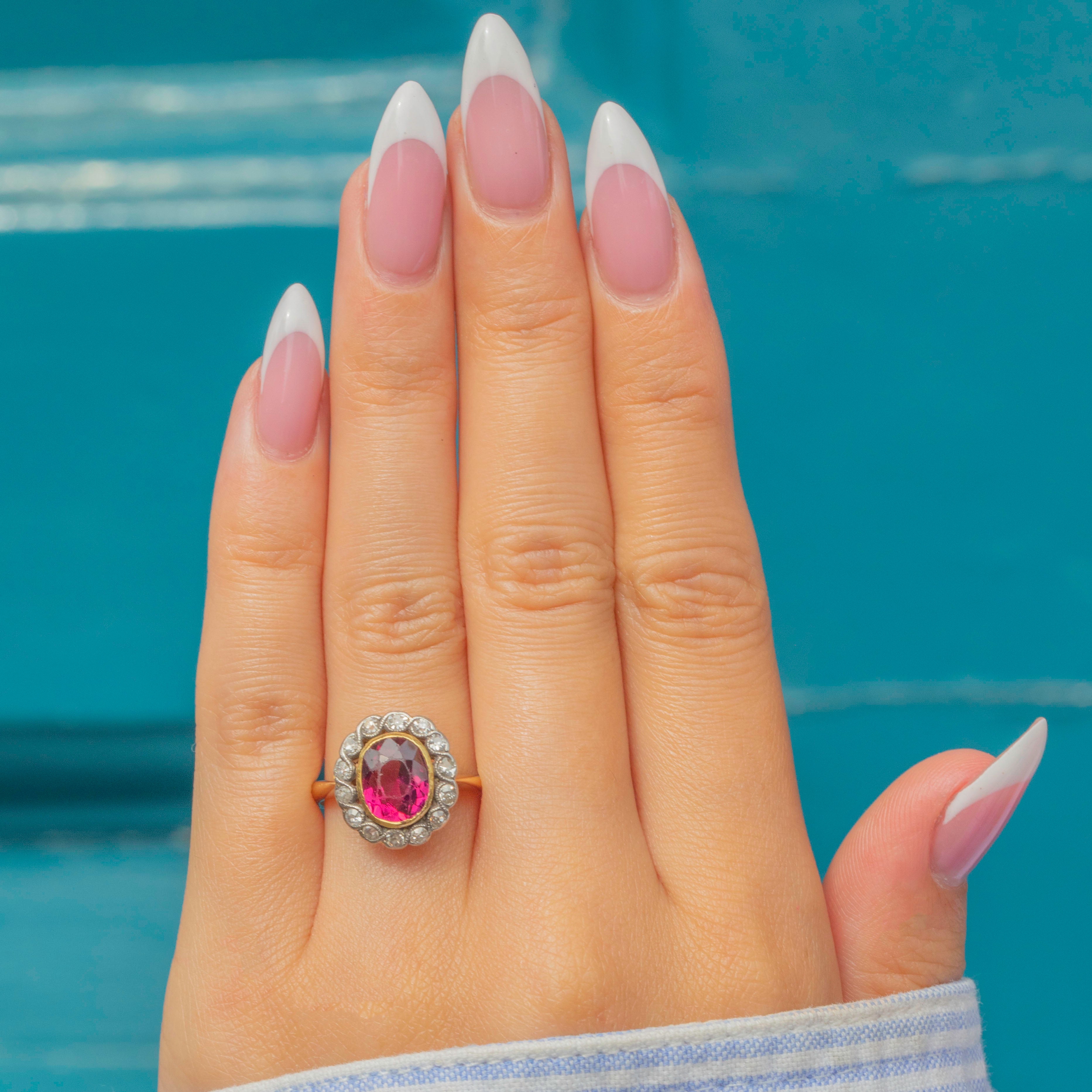 This exquisite Belle Époque cluster ring, crafted circa 1910, showcases a vivid pink Tourmaline framed by a halo of sparkling Diamonds. The oval-cut 1.55ct Tourmaline radiates a rich, saturated hue, beautifully complemented by the crisp brilliance of the surrounding Diamonds.