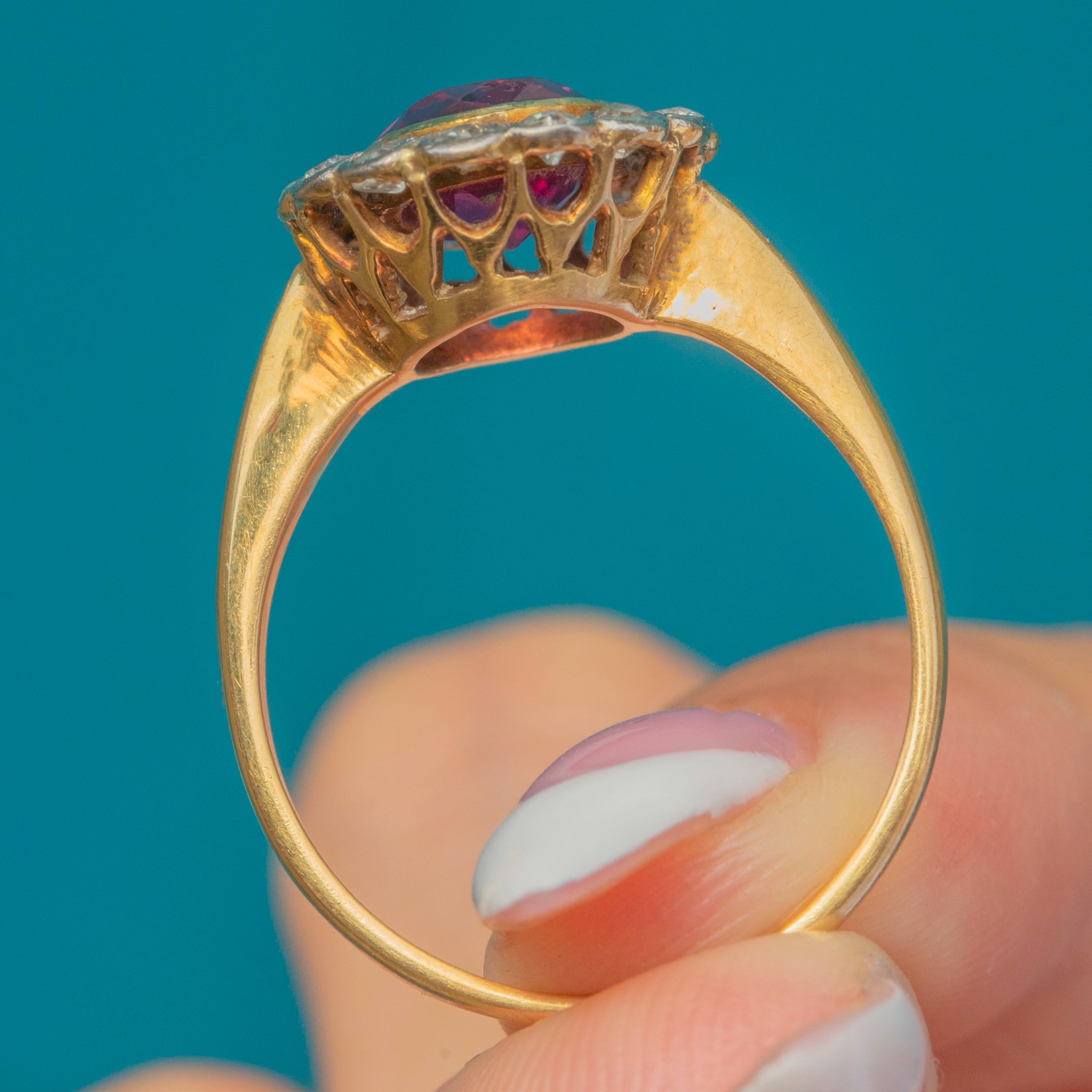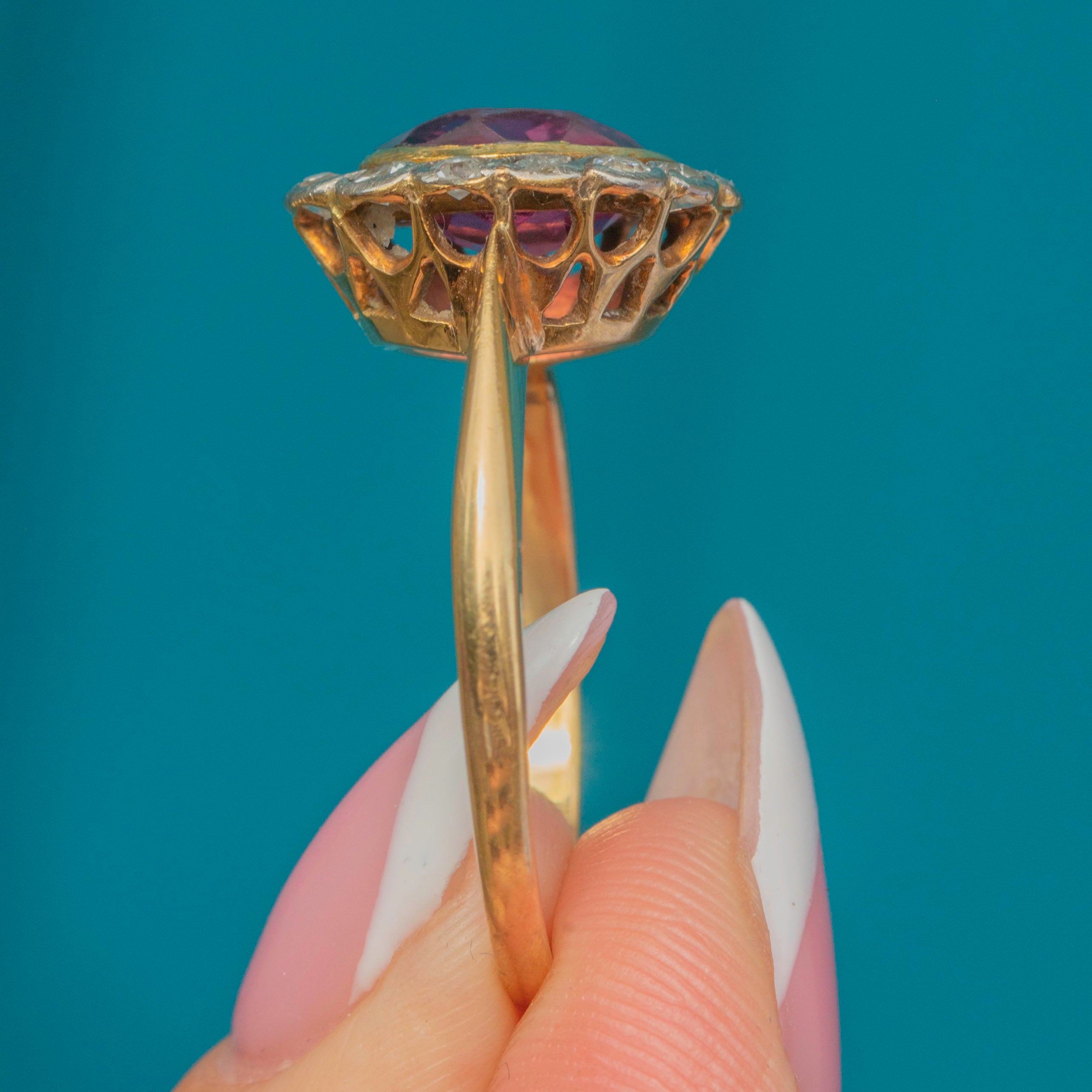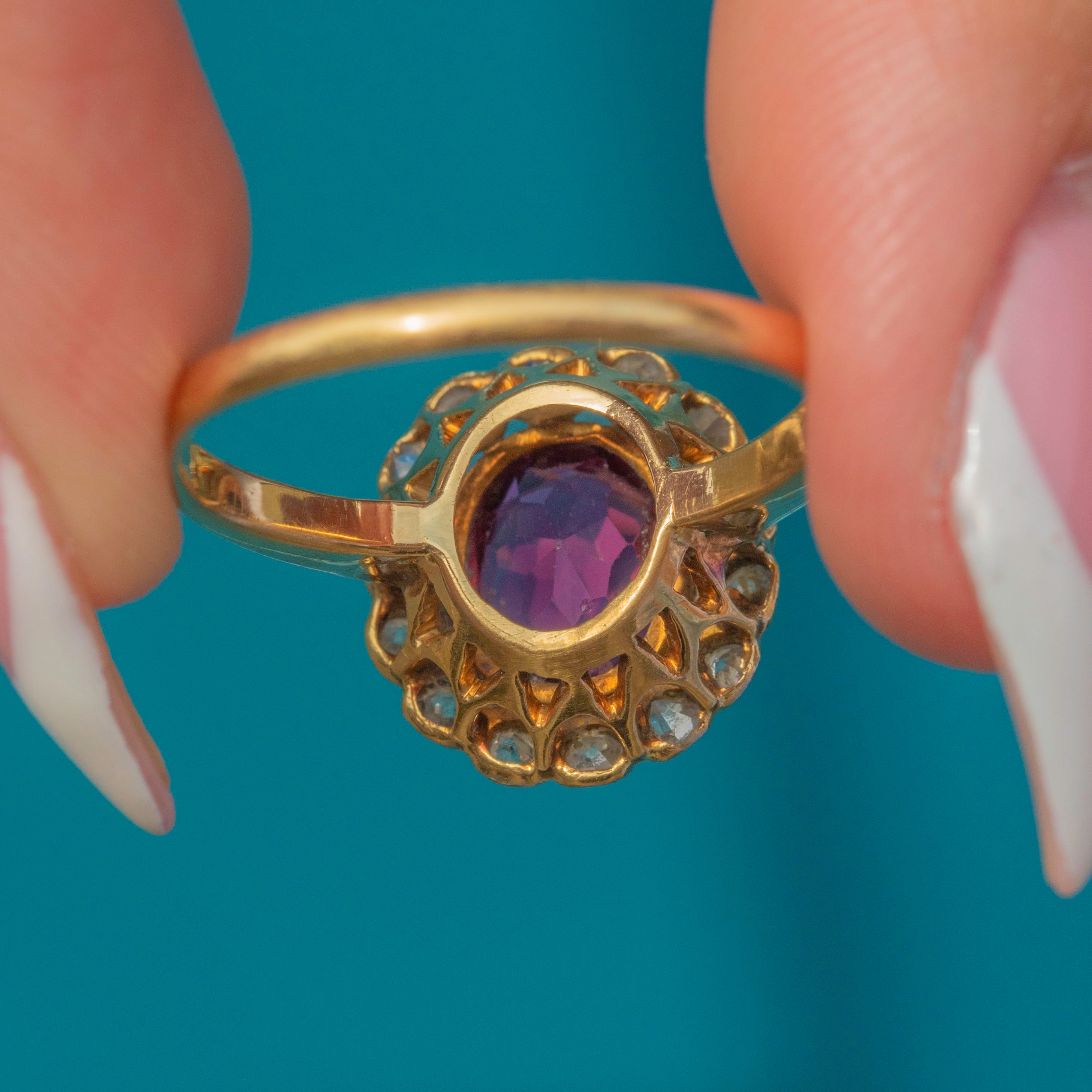 This exquisite Belle Époque cluster ring, crafted circa 1910, showcases a vivid pink Tourmaline framed by a halo of sparkling Diamonds. The oval-cut 1.55ct Tourmaline radiates a rich, saturated hue, beautifully complemented by the crisp brilliance of the surrounding Diamonds.