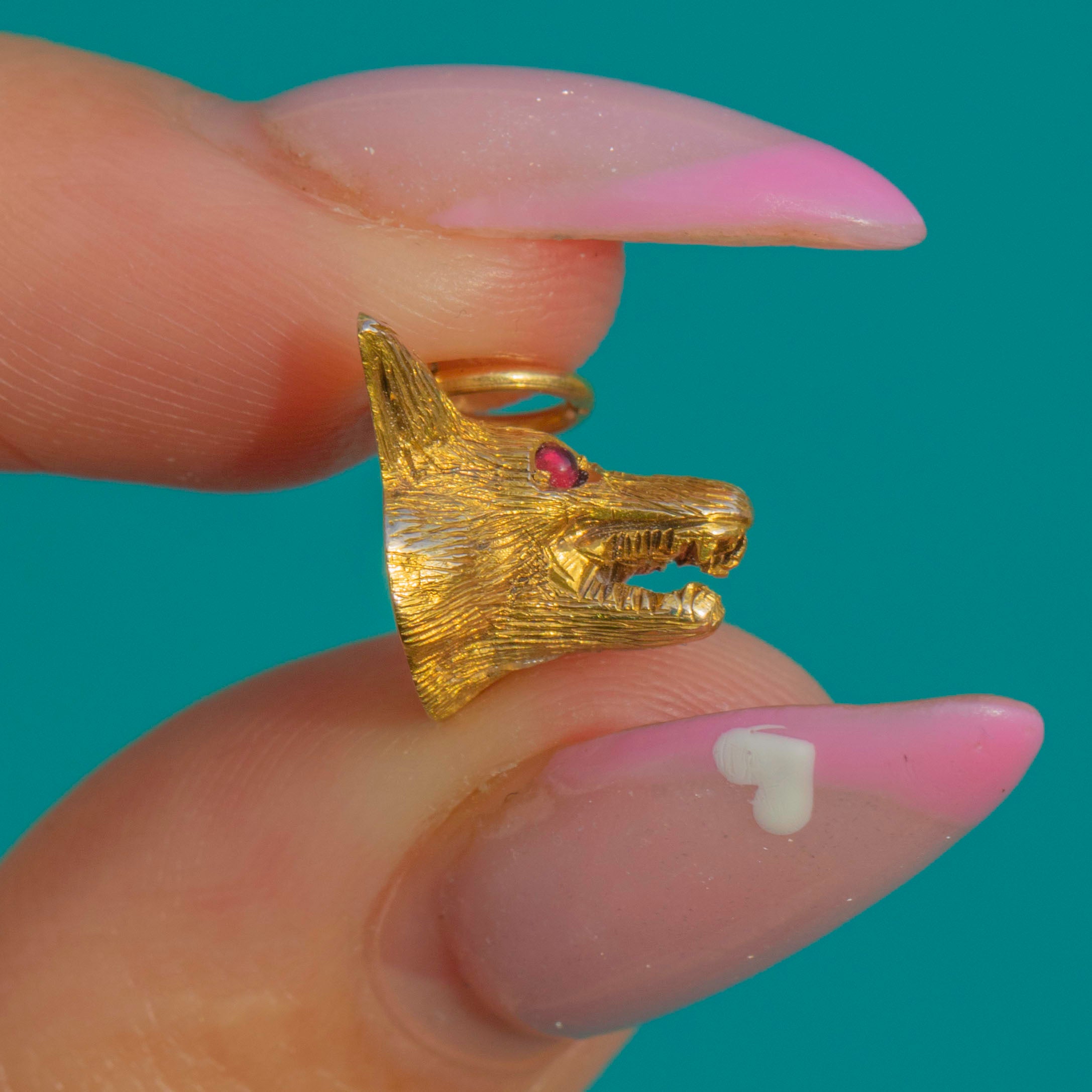 VERY GOOD-EXCELLENT: The fox’s head retains beautifully crisp detail and rich Gold colour, with only light surface wear. The red Paste eyes are securely set and gleam brightly, enhancing the lifelike character of this lovely antique charm.