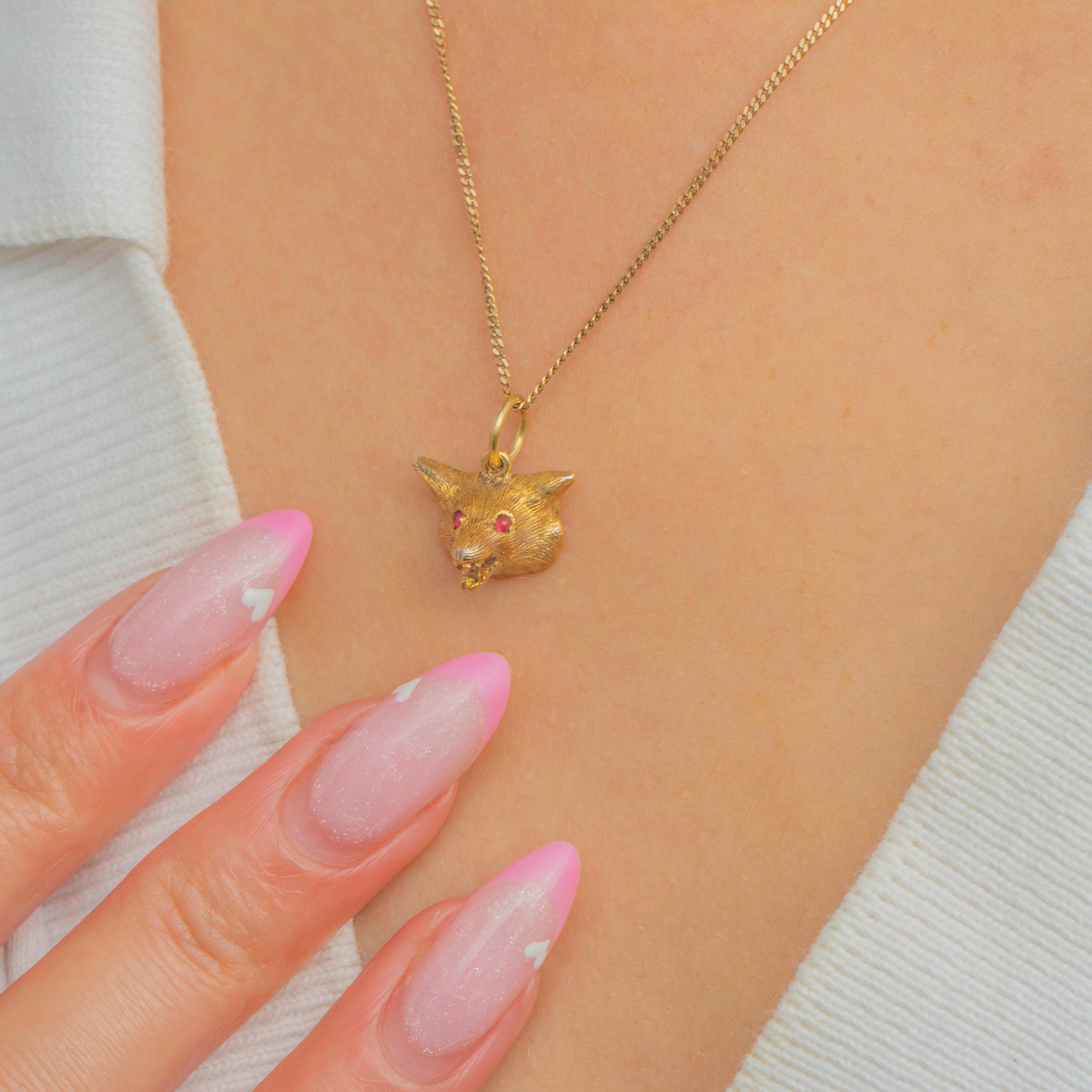 The fox’s eyes are set with dainty red Paste cabochons, glinting with a subtle, alert sparkle. A wonderful symbol of wit and cunning, this detailed little antique fox charm would make a perfect addition to any antique bracelet or chain.