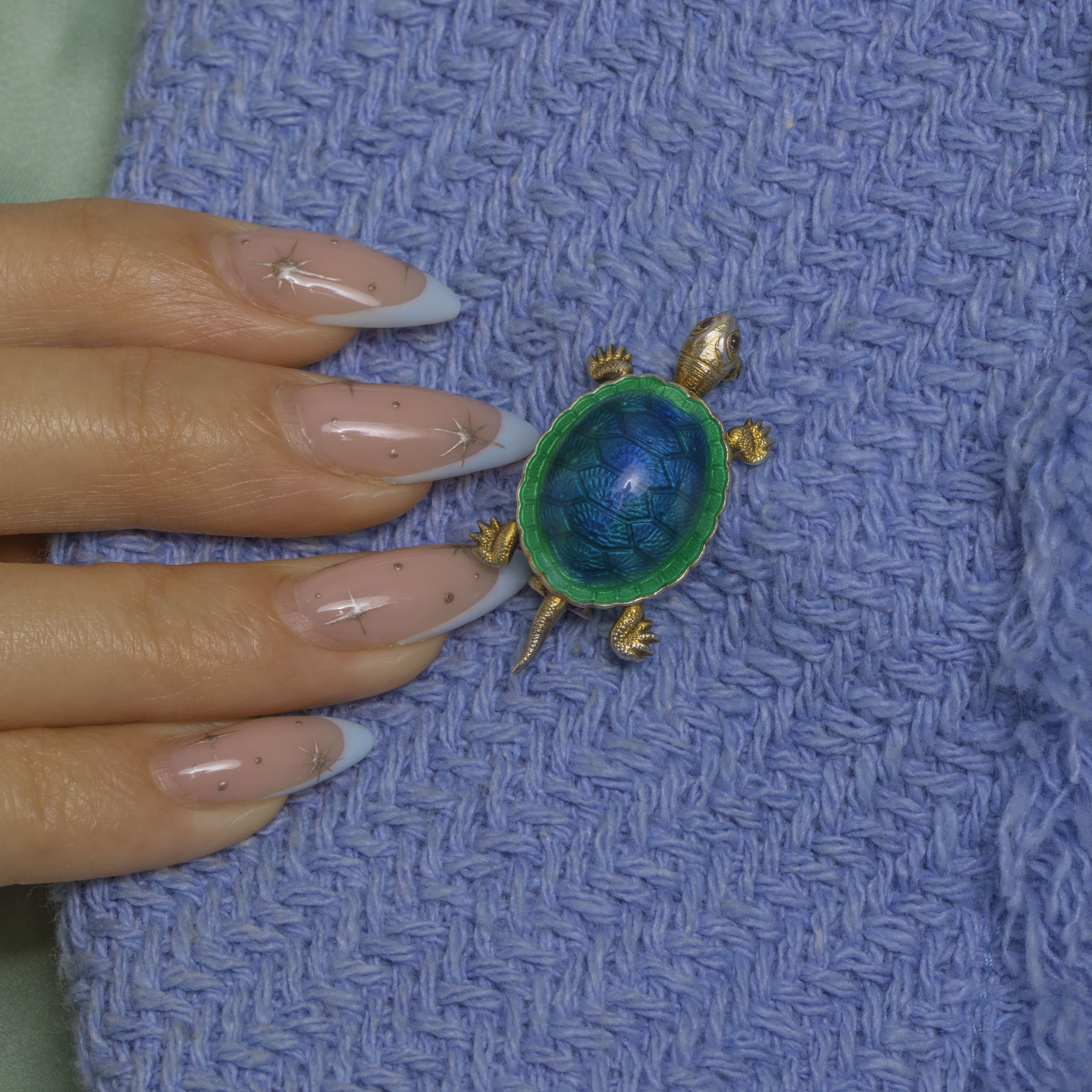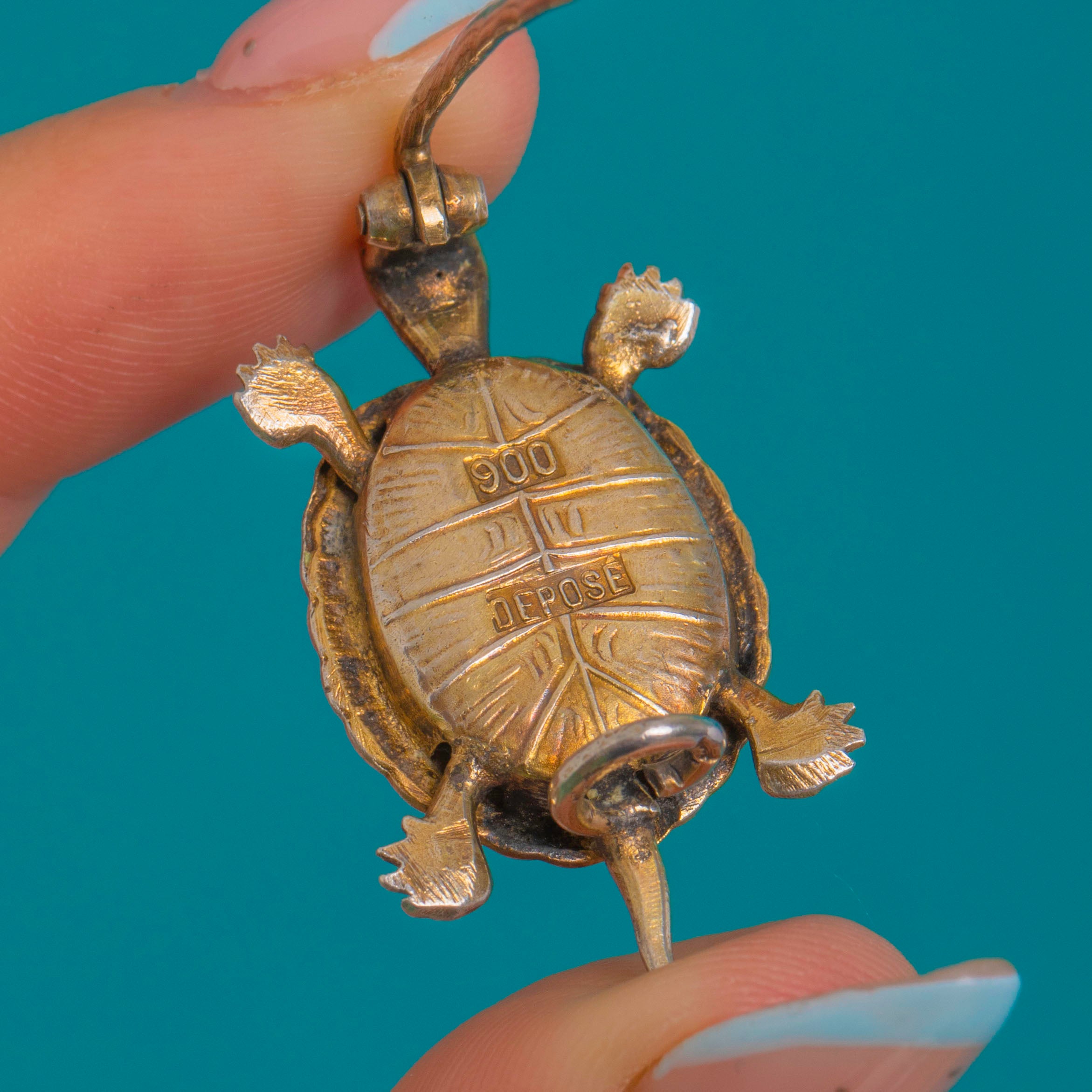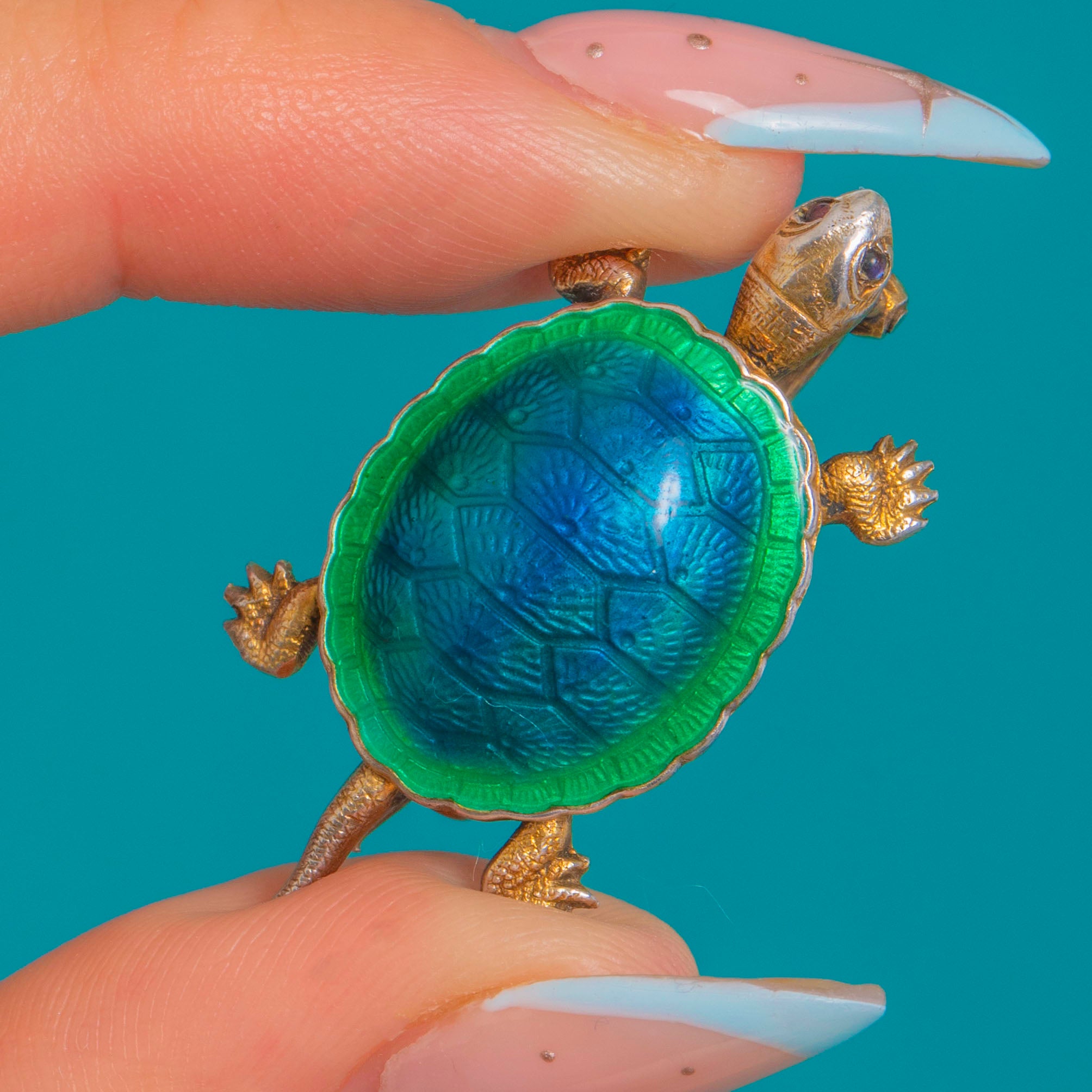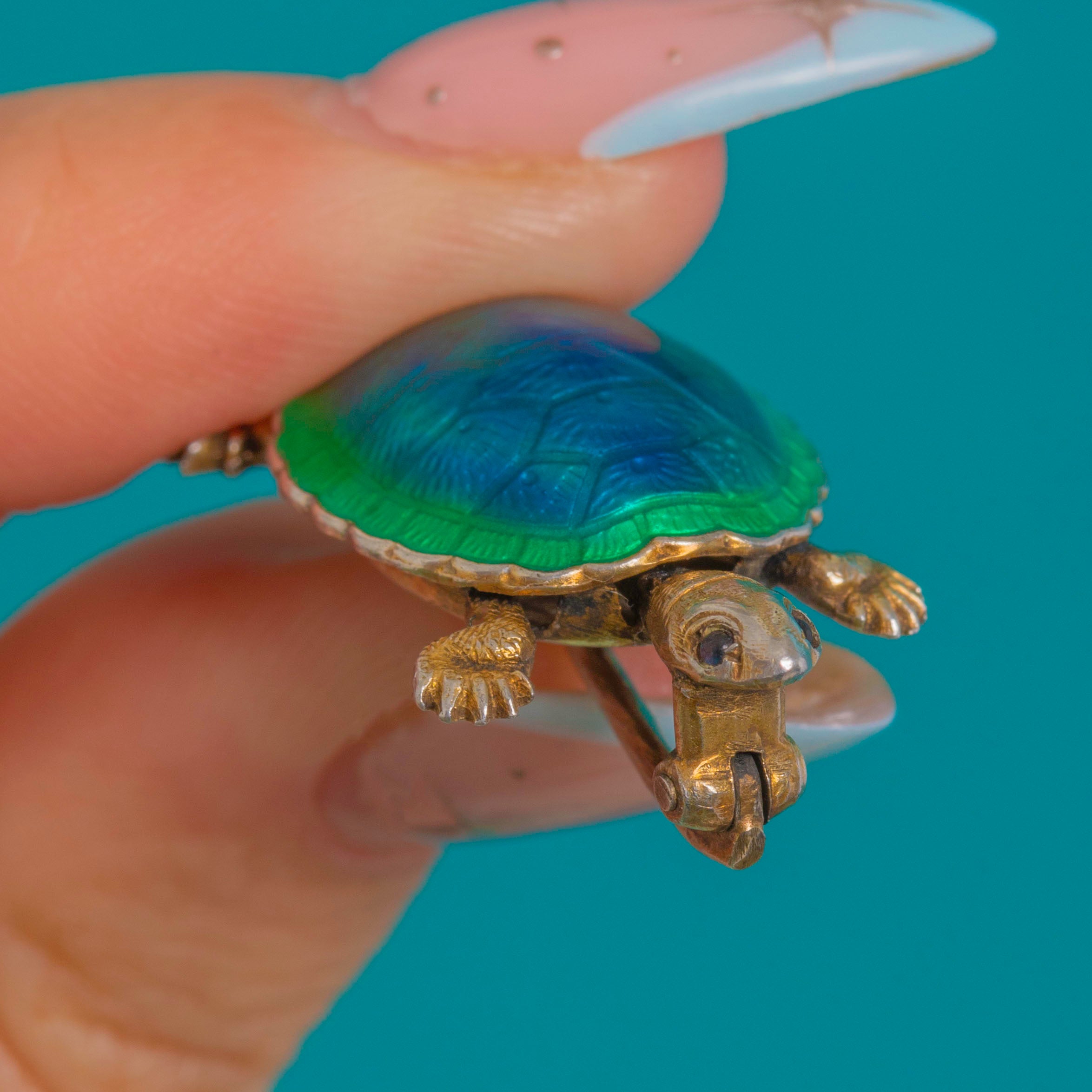 Charming and characterful, this French Art Deco tortoise brooch is crafted in gilded Silver and finished with luminous Guilloché Enamel. The domed shell shimmers with an engine-turned pattern beneath translucent Enamel that graduates from bright green through teal into deep blue, framed by a scalloped rim. Finely textured head, legs and tail, together with tiny blue Glass eyes, bring this miniature treasure to life.