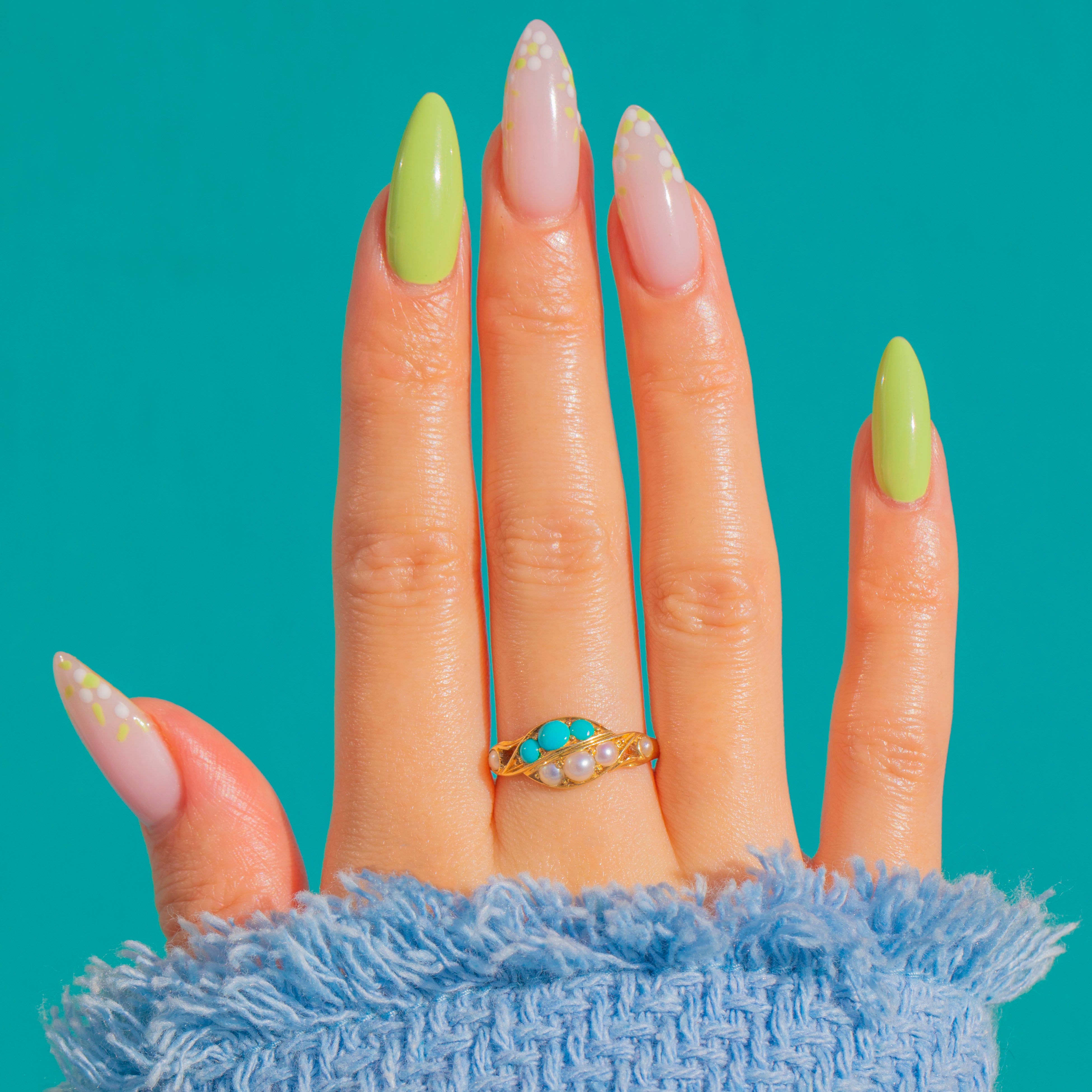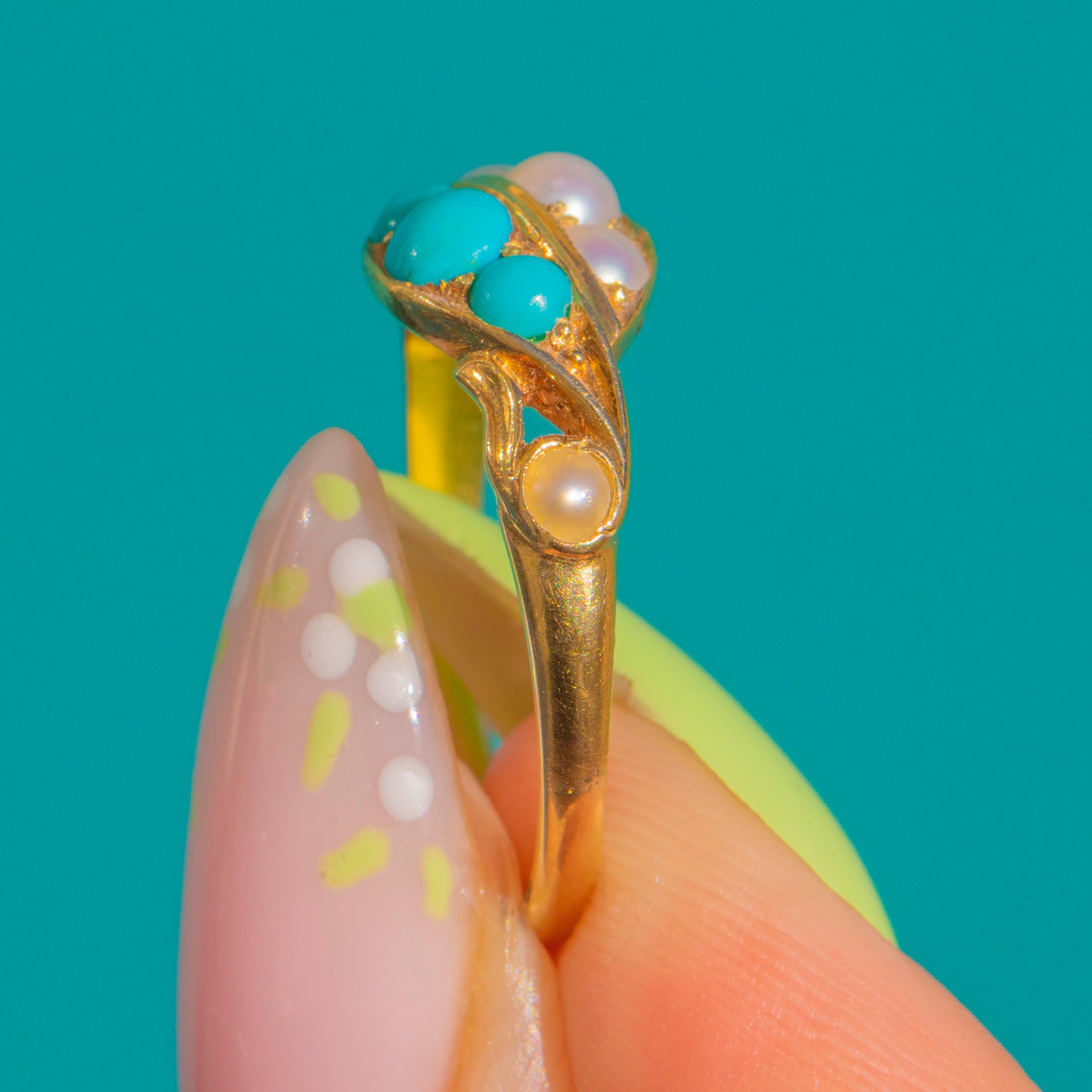 豊かな18金ゴールドに、鮮やかな青緑色のターコイズ・カボションとロマンティックなシードパールが交互に並ぶ、魅力的なLate Victorianナヴェットリングです。細長いマーキス型のヘッドは指に沿うように低く配され、繊細な透かし細工の植物モチーフのショルダーやロープ状のディテールが、華やかでフェミニンな趣を添えています。