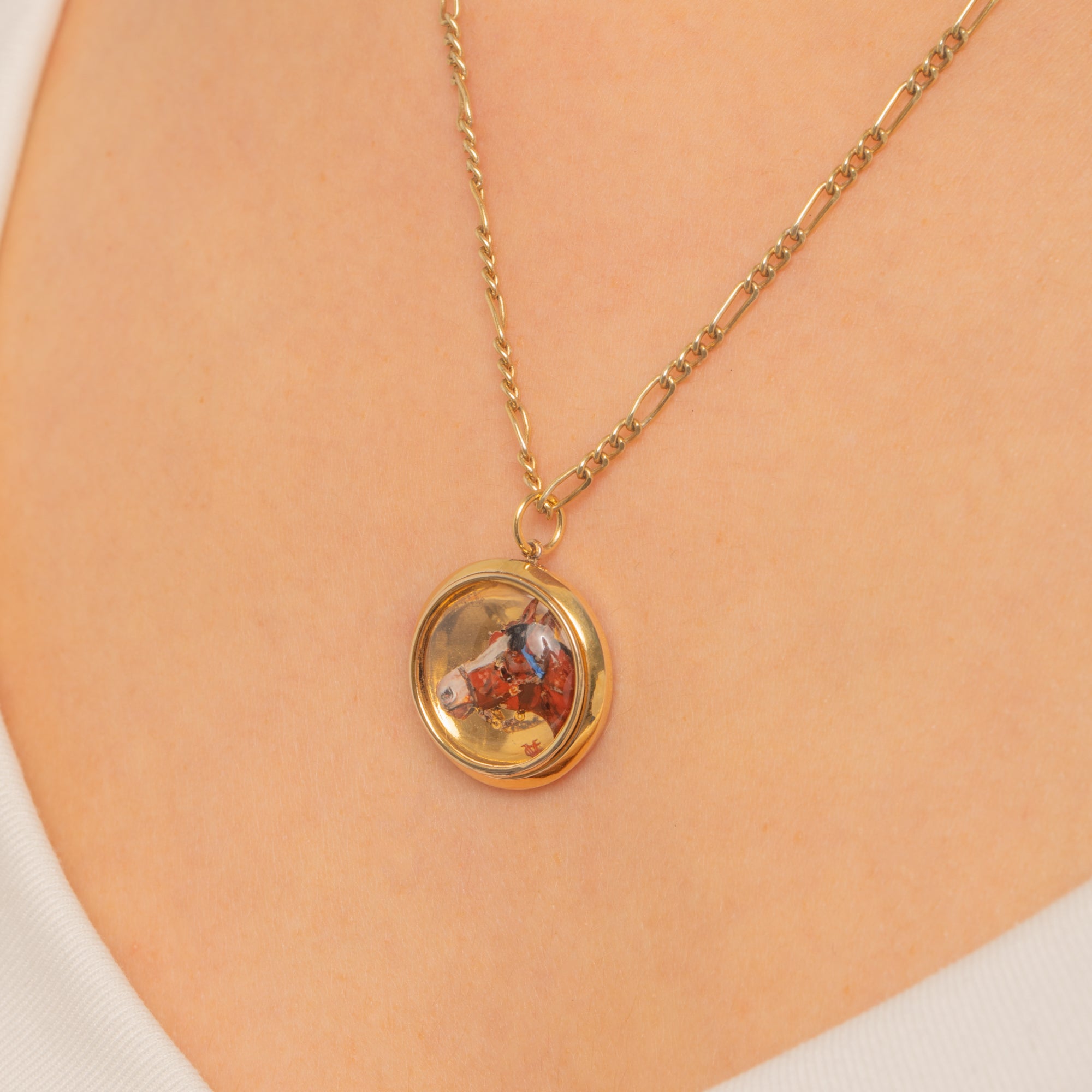 Charming and beautifully evocative, this Victorian 15ct Gold Essex Crystal pendant, c.1880, celebrates the timeless allure of the equestrian motif. Beneath the domed crystal, a finely rendered chestnut horse with a striking white blaze and a delicate blue browband rests against a warm golden ground, all framed by a sleek polished bezel.