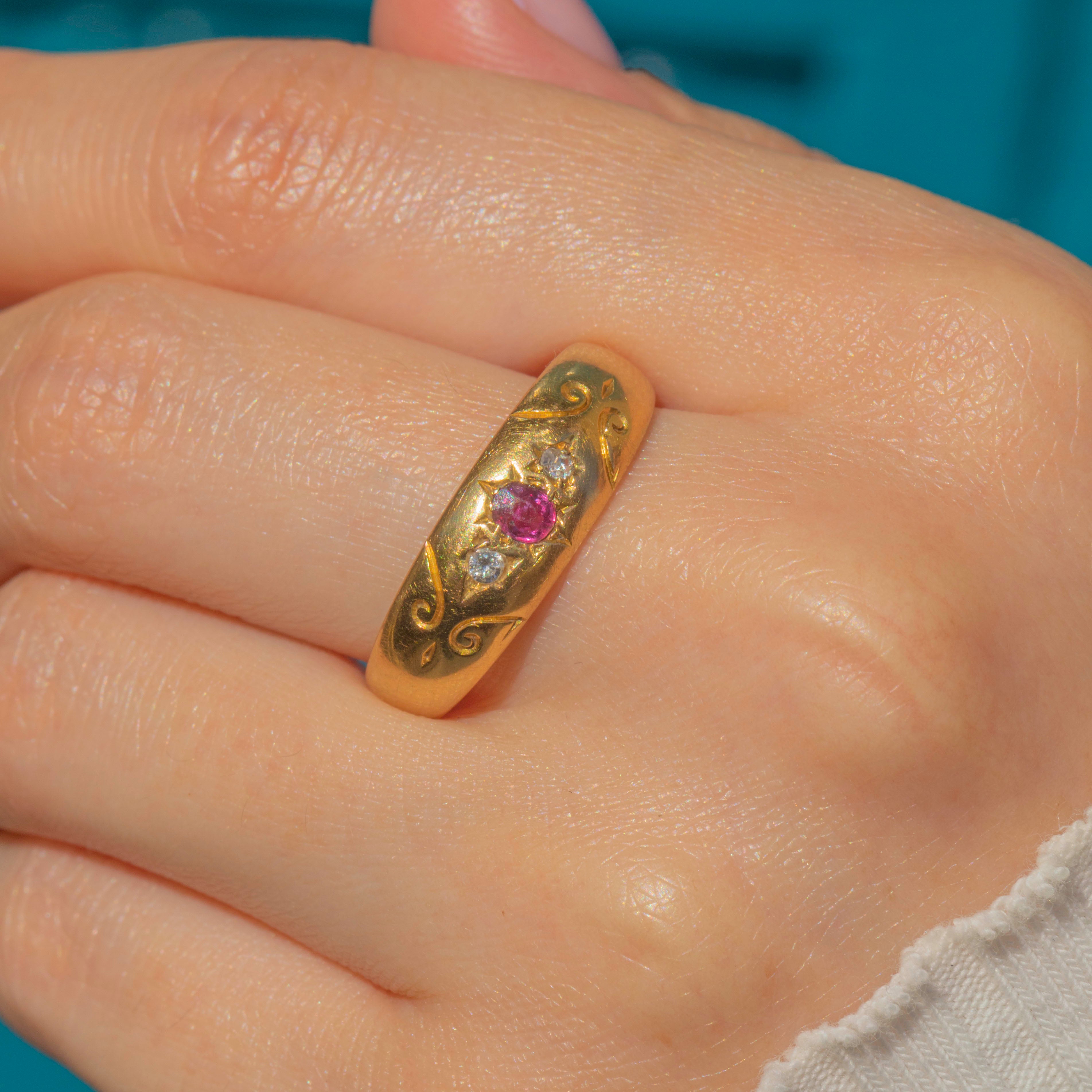 The fuchsia Ruby and subtly sparkling Diamonds are presented within stylistic star settings, framed by swirling engraved details. The low profile of this sumptuous Edwardian gypsy ring makes it perfect for everyday wear, whether worn alone or stacked amongst your other favourite jewels!