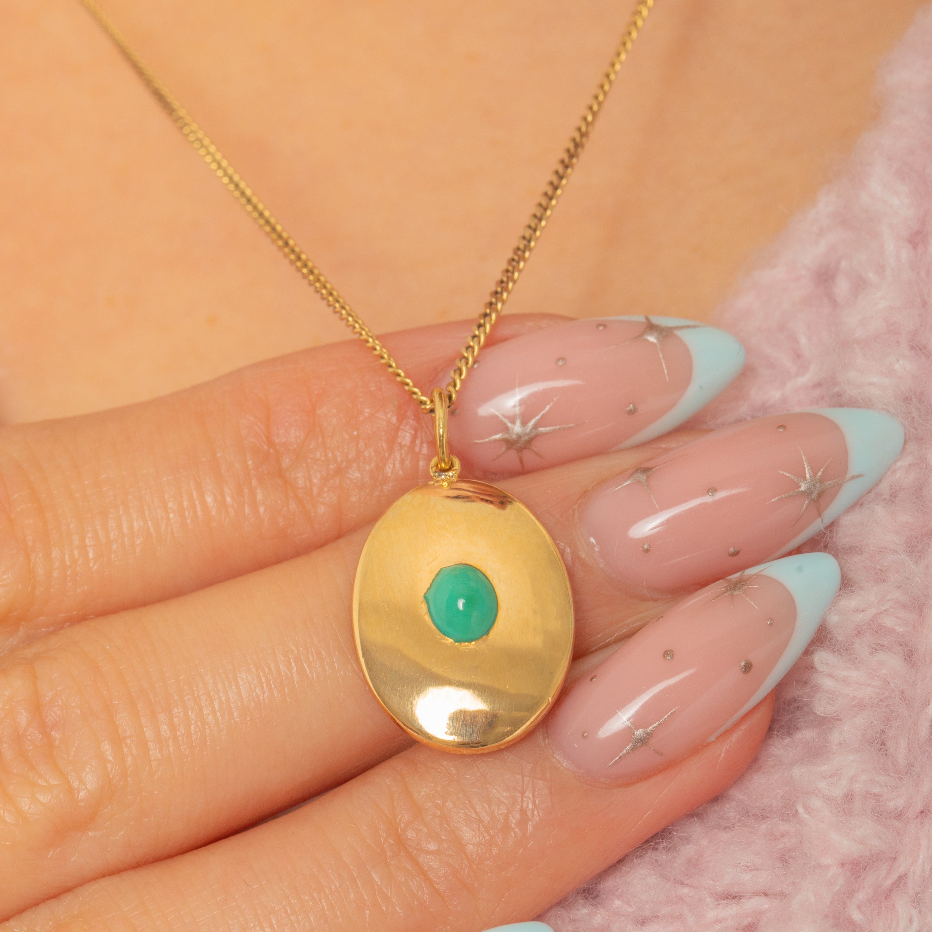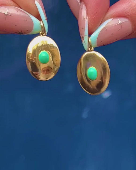 控えめながらも贅沢なこのVictorianディスクペンダントは、上質な18金で丁寧に作られ、中央には一粒のトルコ石カボションがあしらわれています。楕円形のプレートは緩やかに膨らみ、鏡面仕上げが施され、宝石は表面と一体化するように留められており、洗練された印象を与えます。