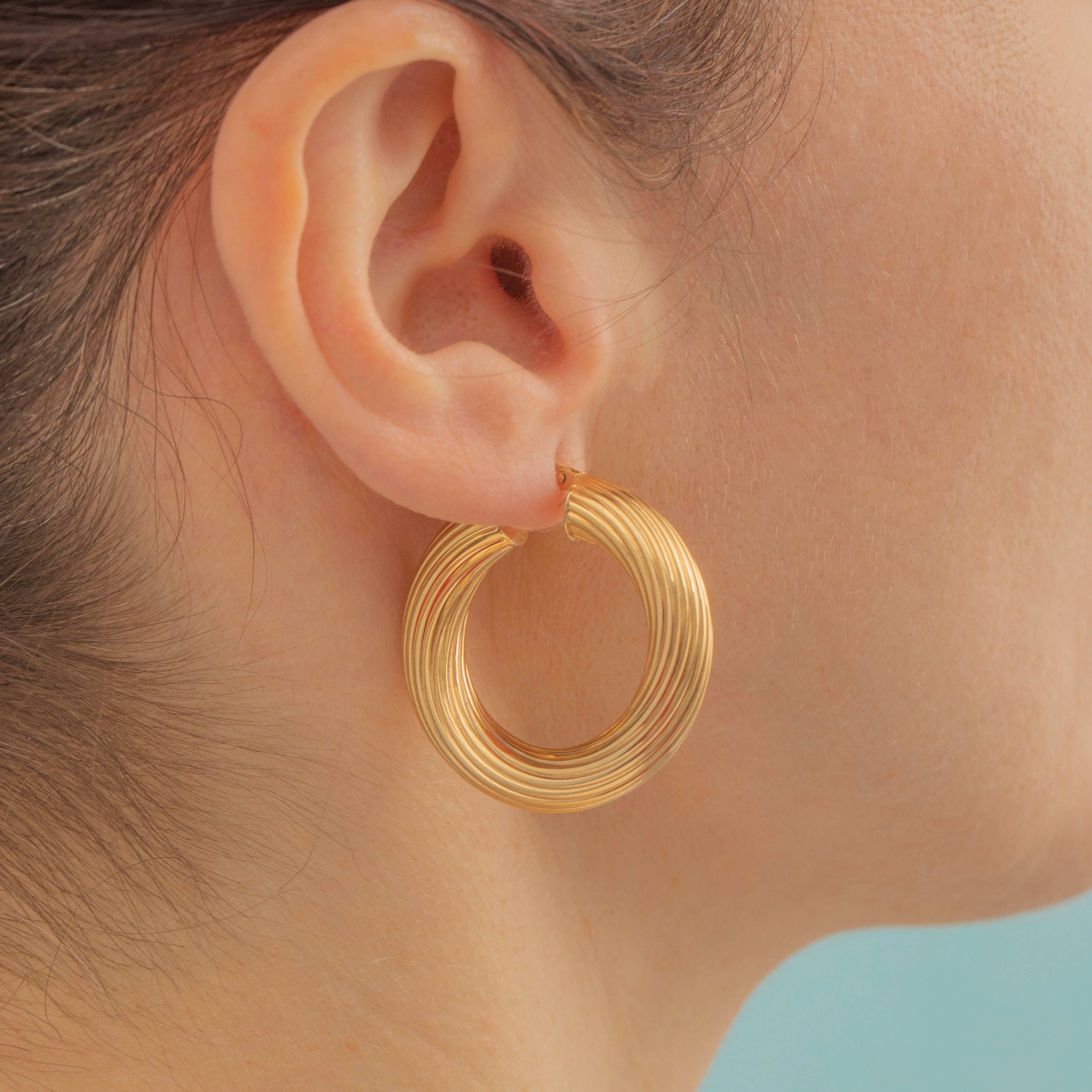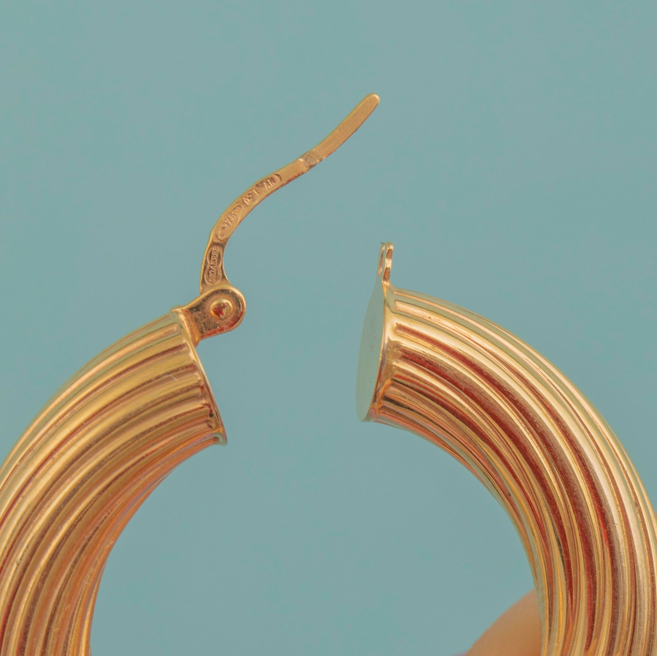 VERY GOOD-EXCELLENT. These chunky 9ct Gold engraved hoop earrings are in wonderful condition and have maintained their lustrous shine! The Gold is sleek with some very minor wear which is only visible upon close inspection. With secure levers, you can wear these fantastic chunky Gold hoops with absolute confidence!