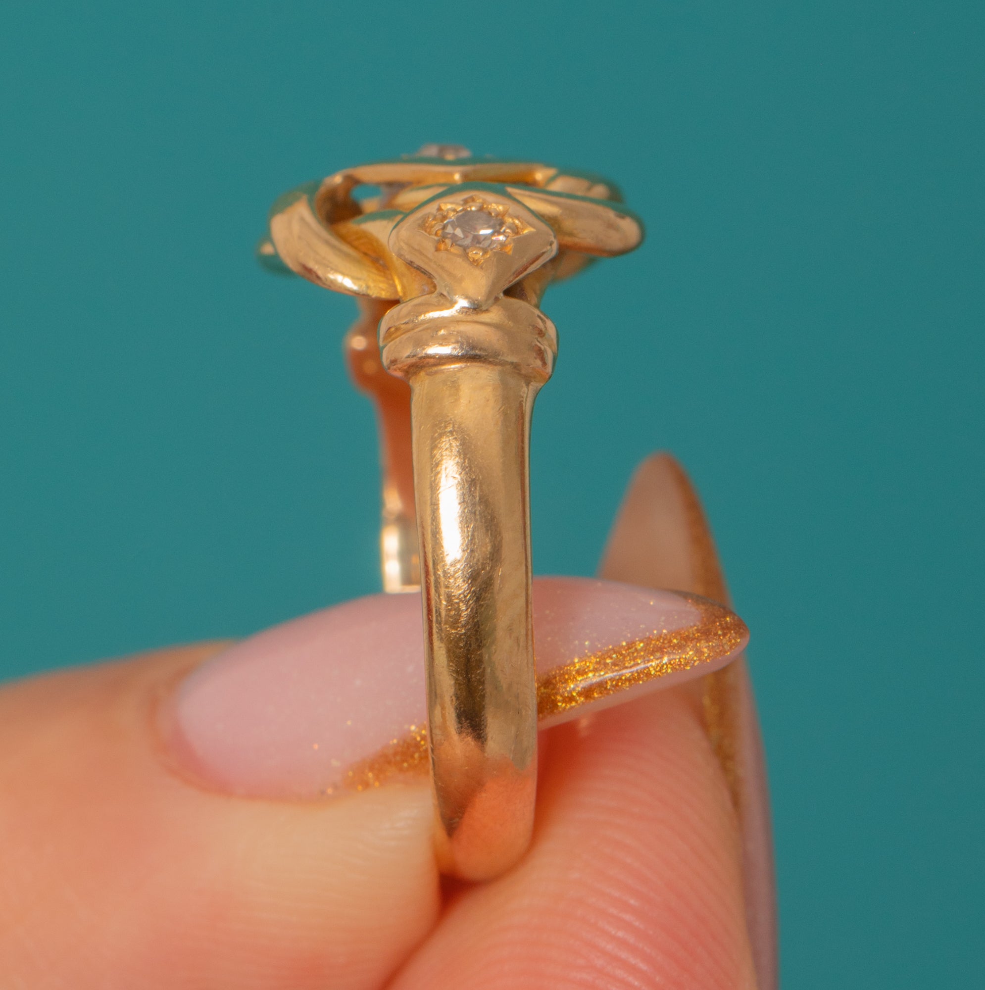 This bold and romantic antique knot ring is crafted in solid 18ct Gold and set with sparkling antique Diamonds. The intricate knot motif, a symbol of eternal love and unity, wraps elegantly around the finger, showcasing a central Old Mine Cut Diamond framed by two twinkling single-cut accents.