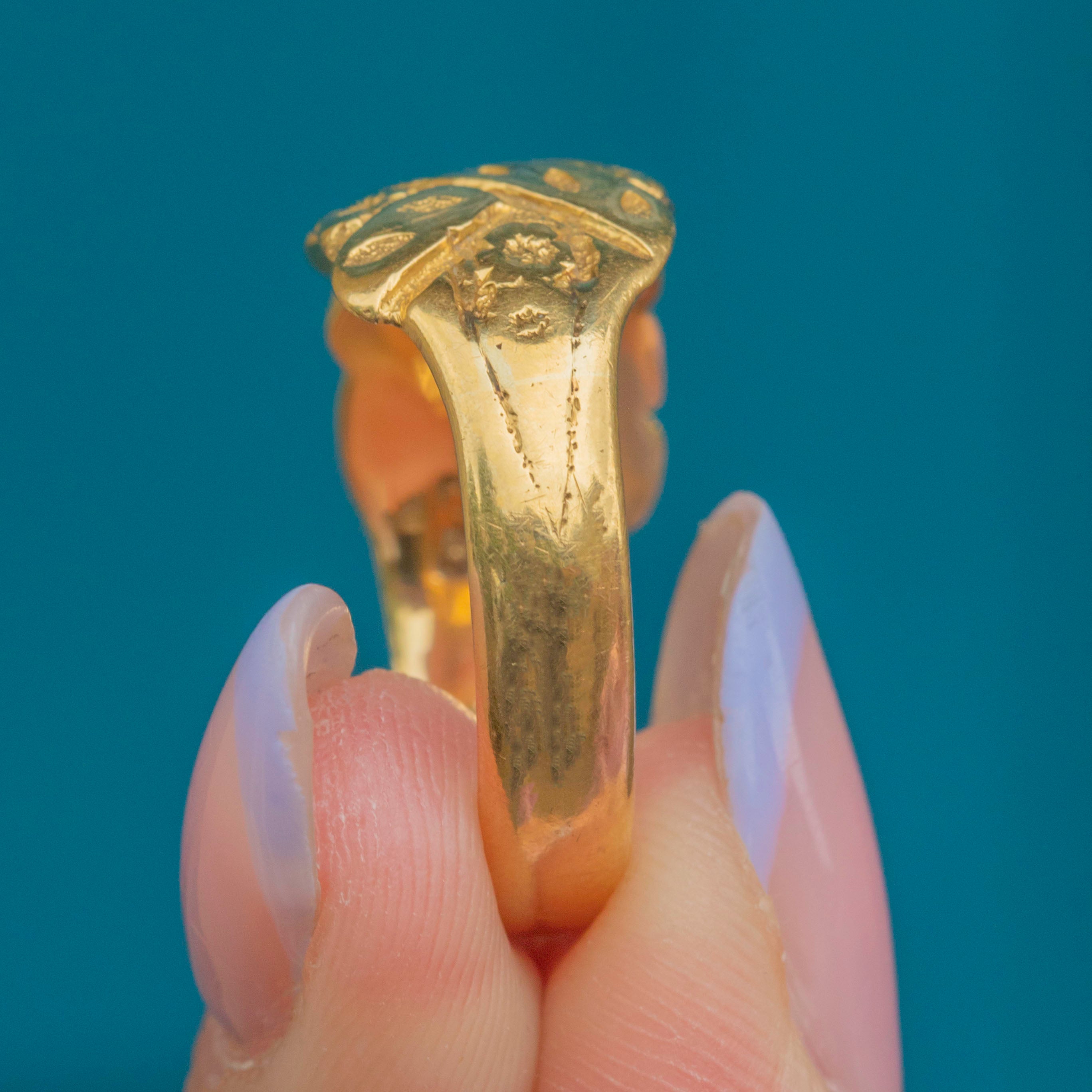 EXCELLENT: This chunky antique 18ct Gold engraved flower ring is in excellent condition. Her Gold is glossy and bright, with only minor dings to the band commensurate with age. The hallmarks are clear and fully legible, allowing us to accurately date this antique 18ct Gold ring to 1918!