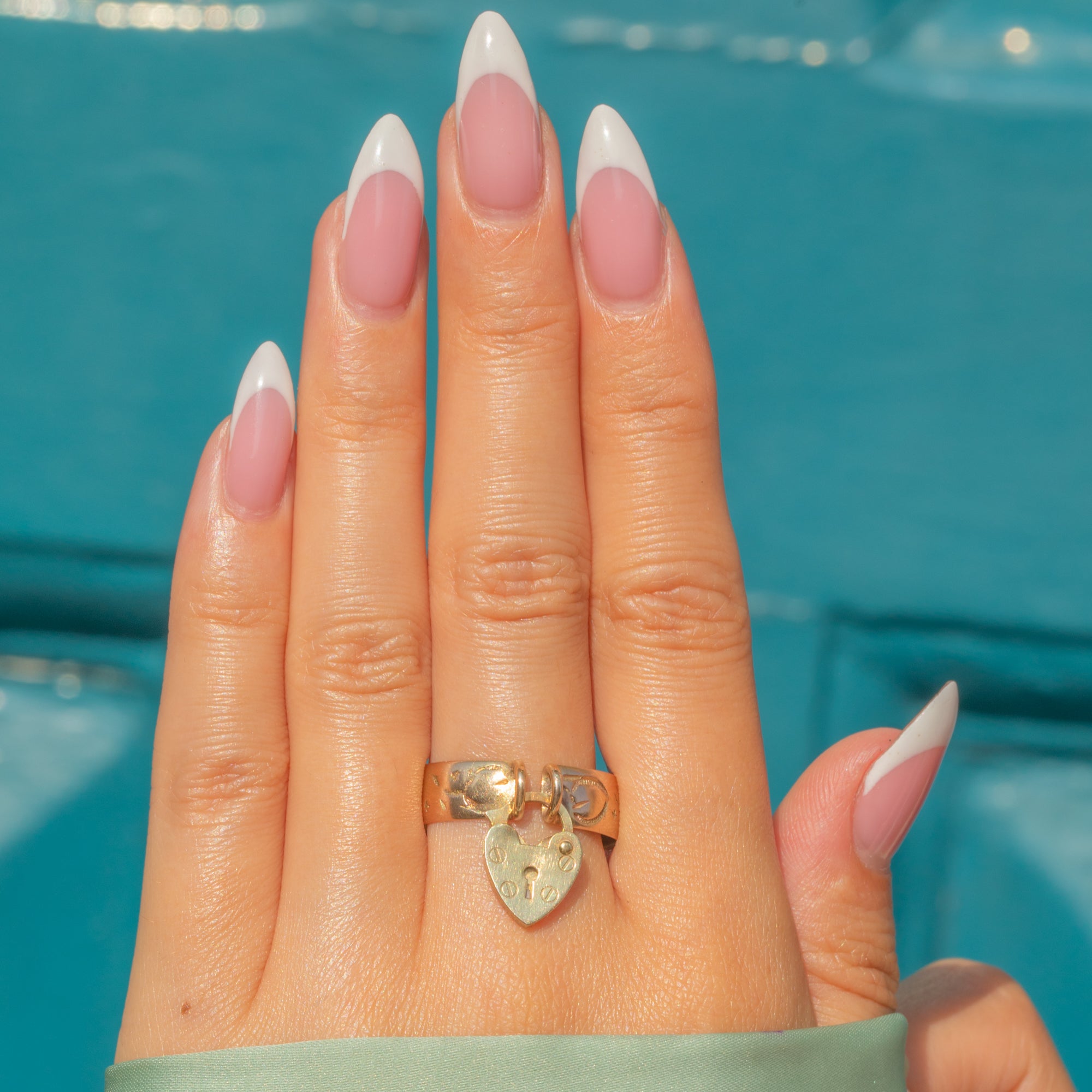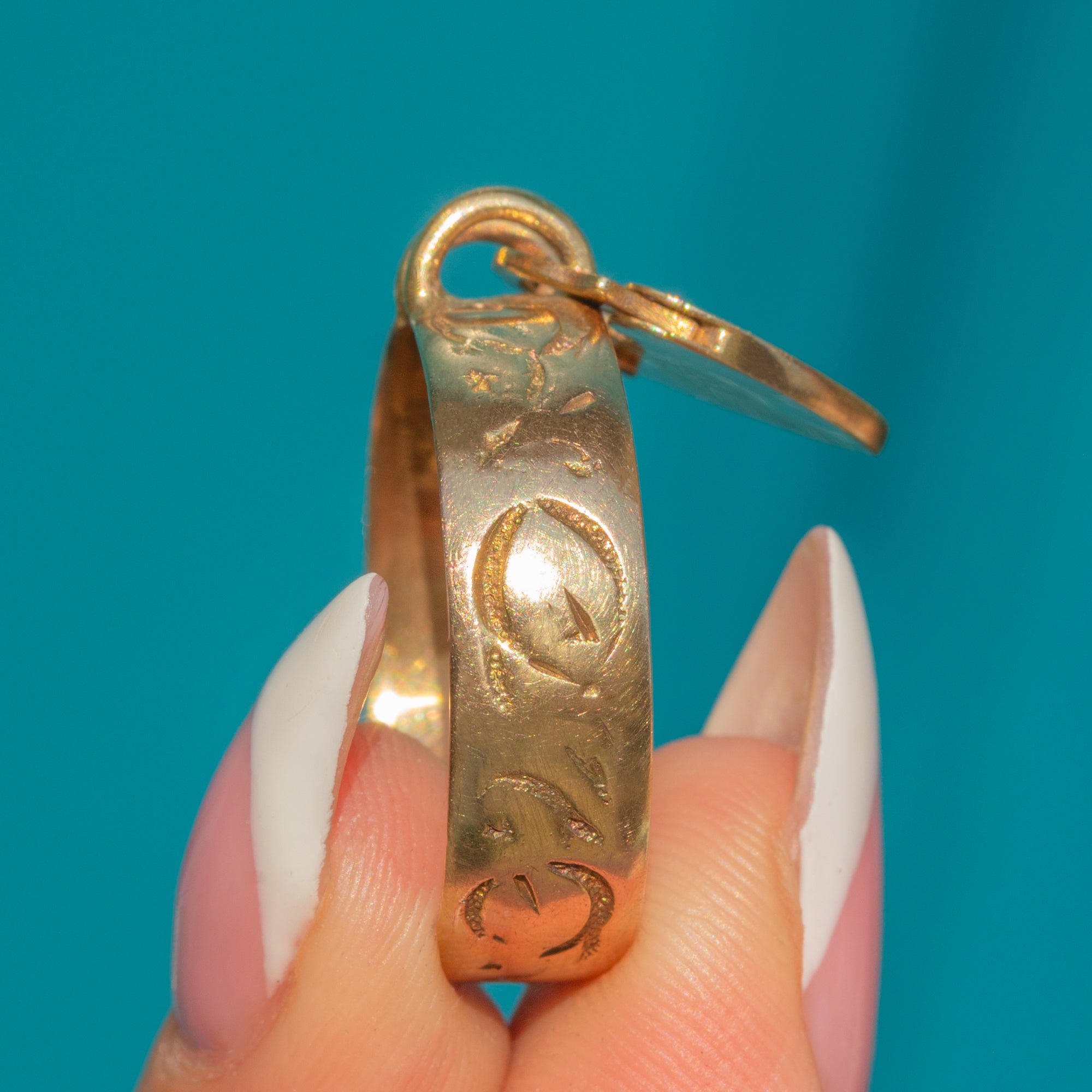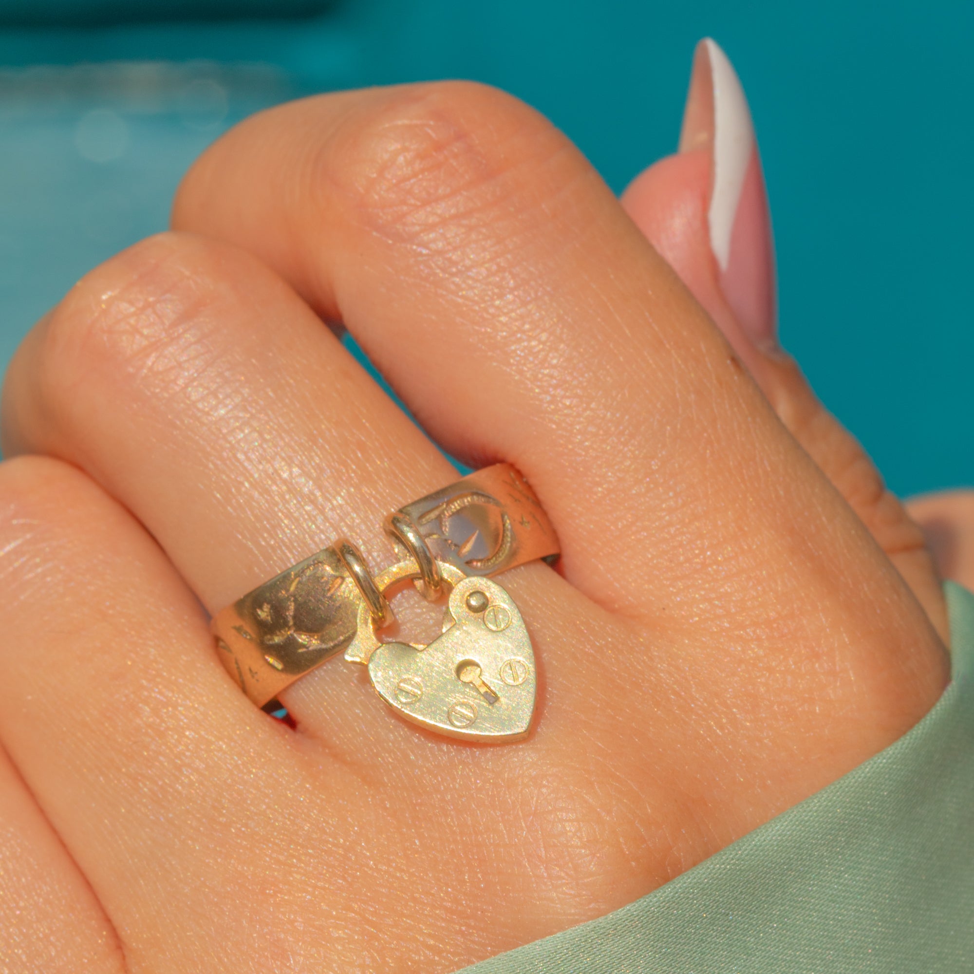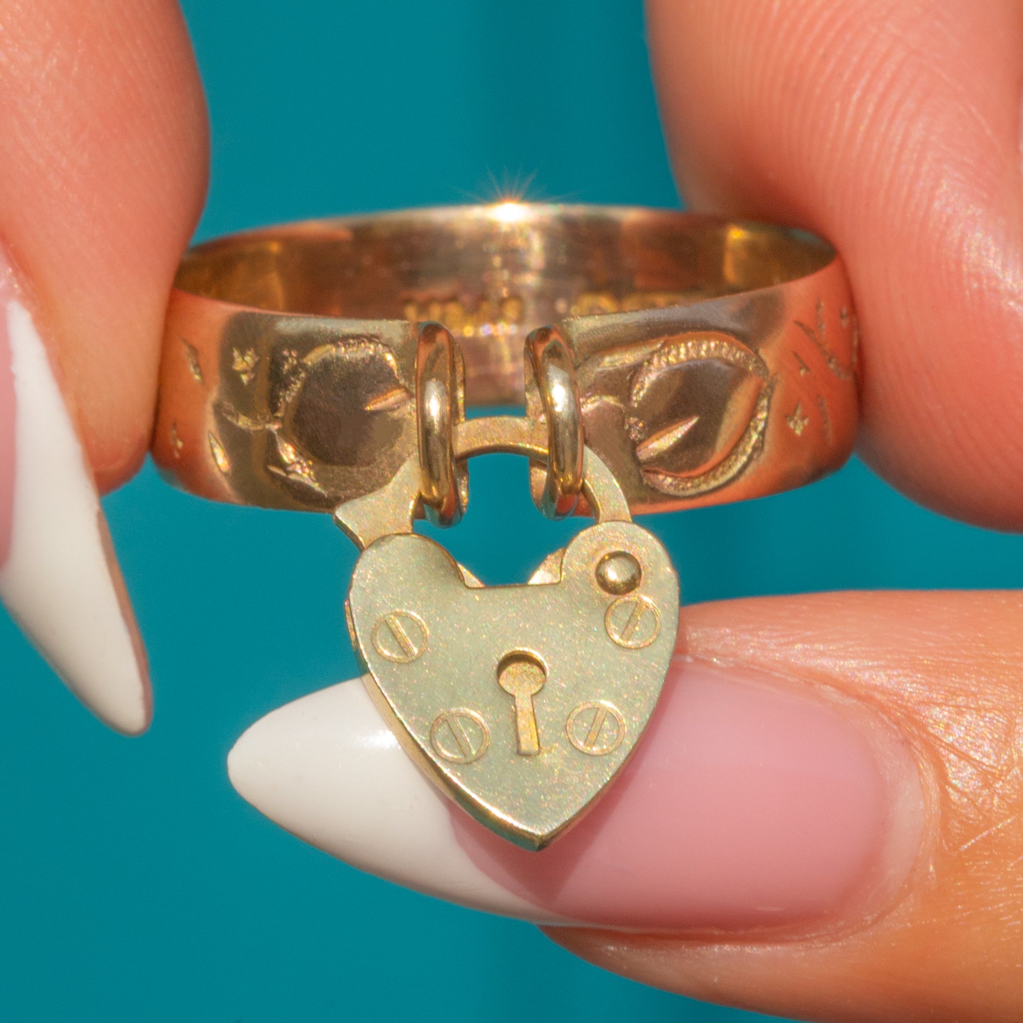 This distinctive Antique ring is full of bold, romantic character. Crafted from 9ct Gold, it features a chunky 6mm wide band engraved with stylised motifs and paired with a sweet heart-shaped padlock charm.
