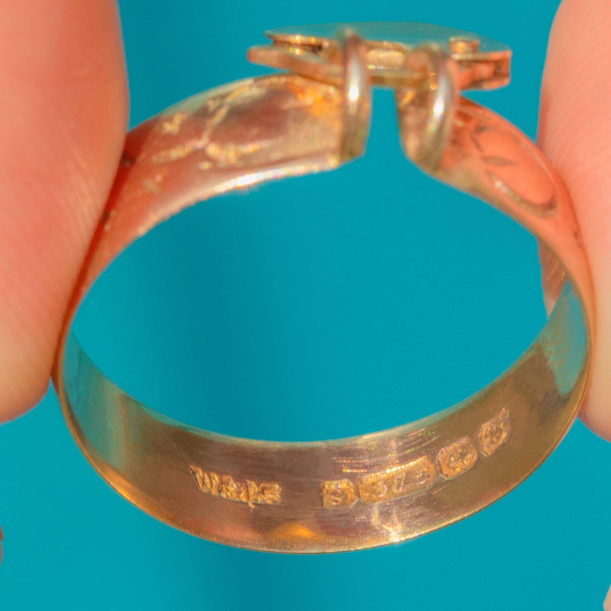 The padlock swings freely from two Gold loops, giving the ring a tactile, playful quality. Fully hallmarked for Birmingham, 1917, this unique piece offers a rustic finish with soft wear to the engraving that adds charm and history.
