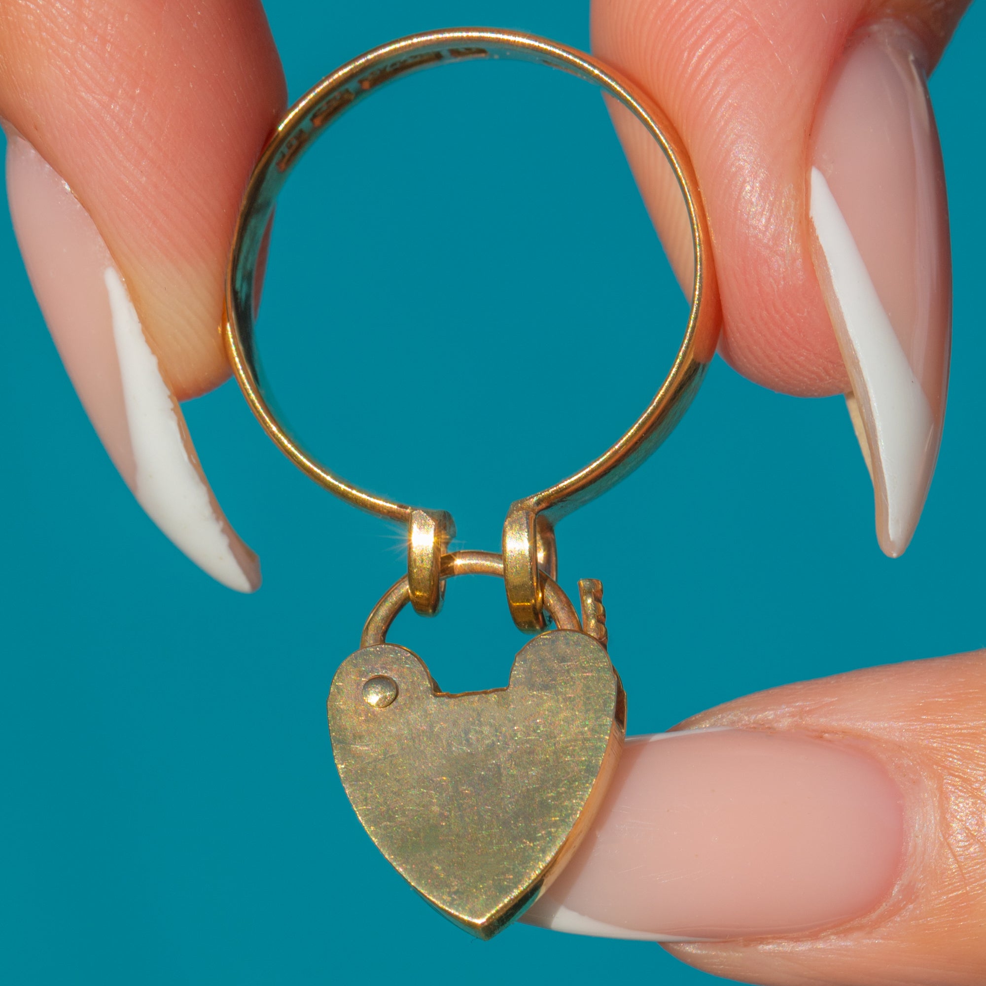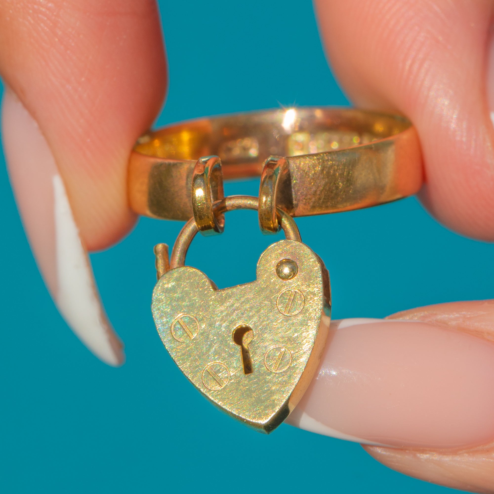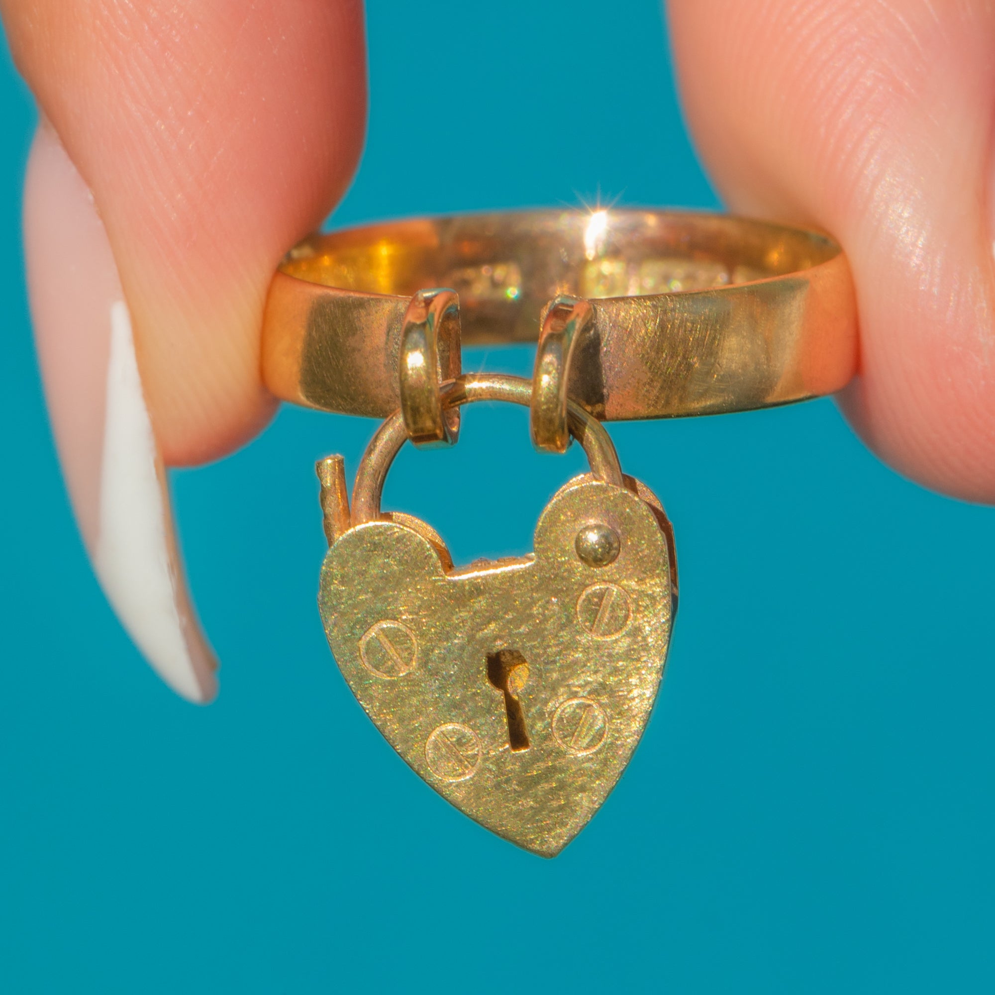 The ring has a bold and weighty feel, with the fully hallmarked padlock hanging securely from the Gold band. A rare and collectible piece of antique jewellery, it combines sentiment, symbolism, and everyday wearability.