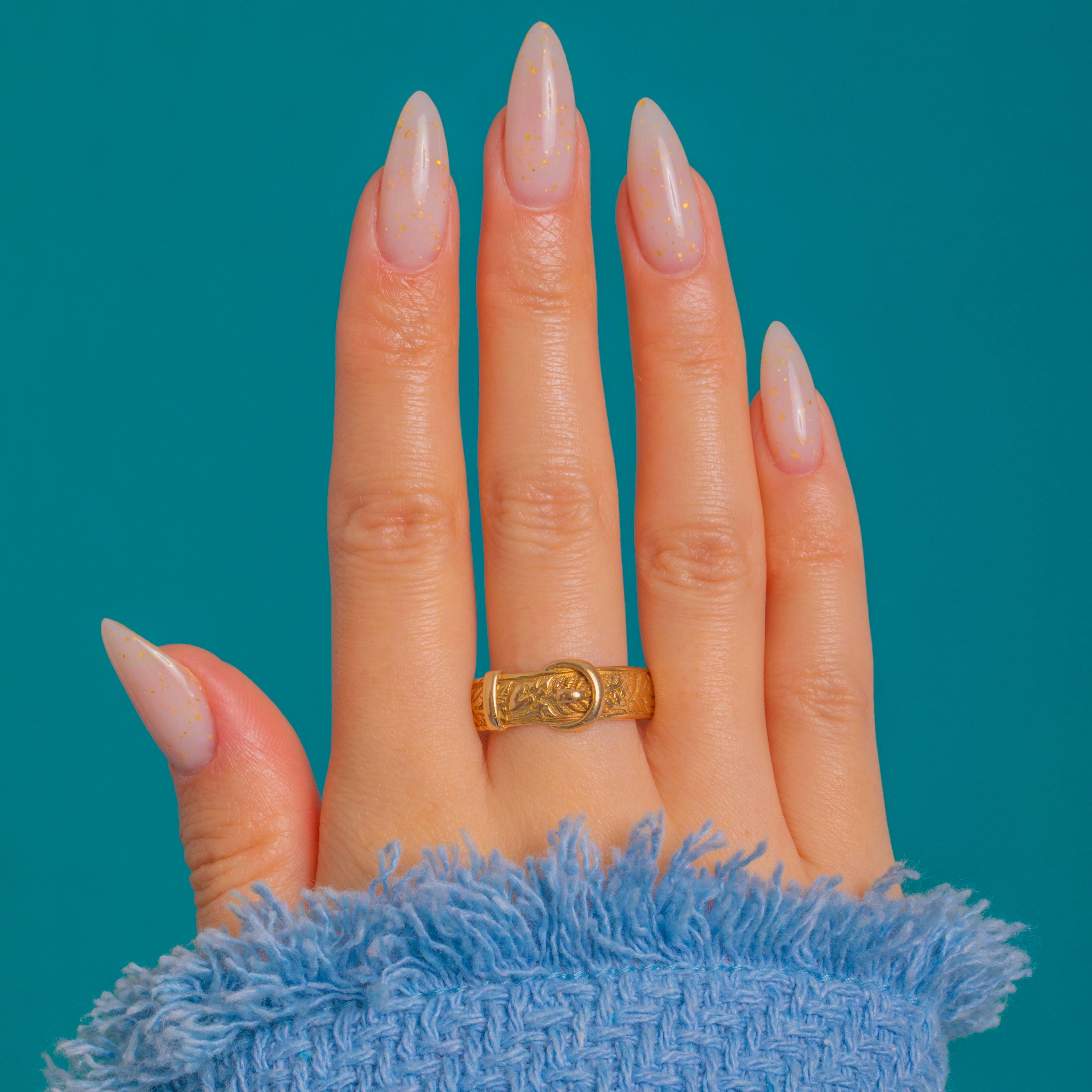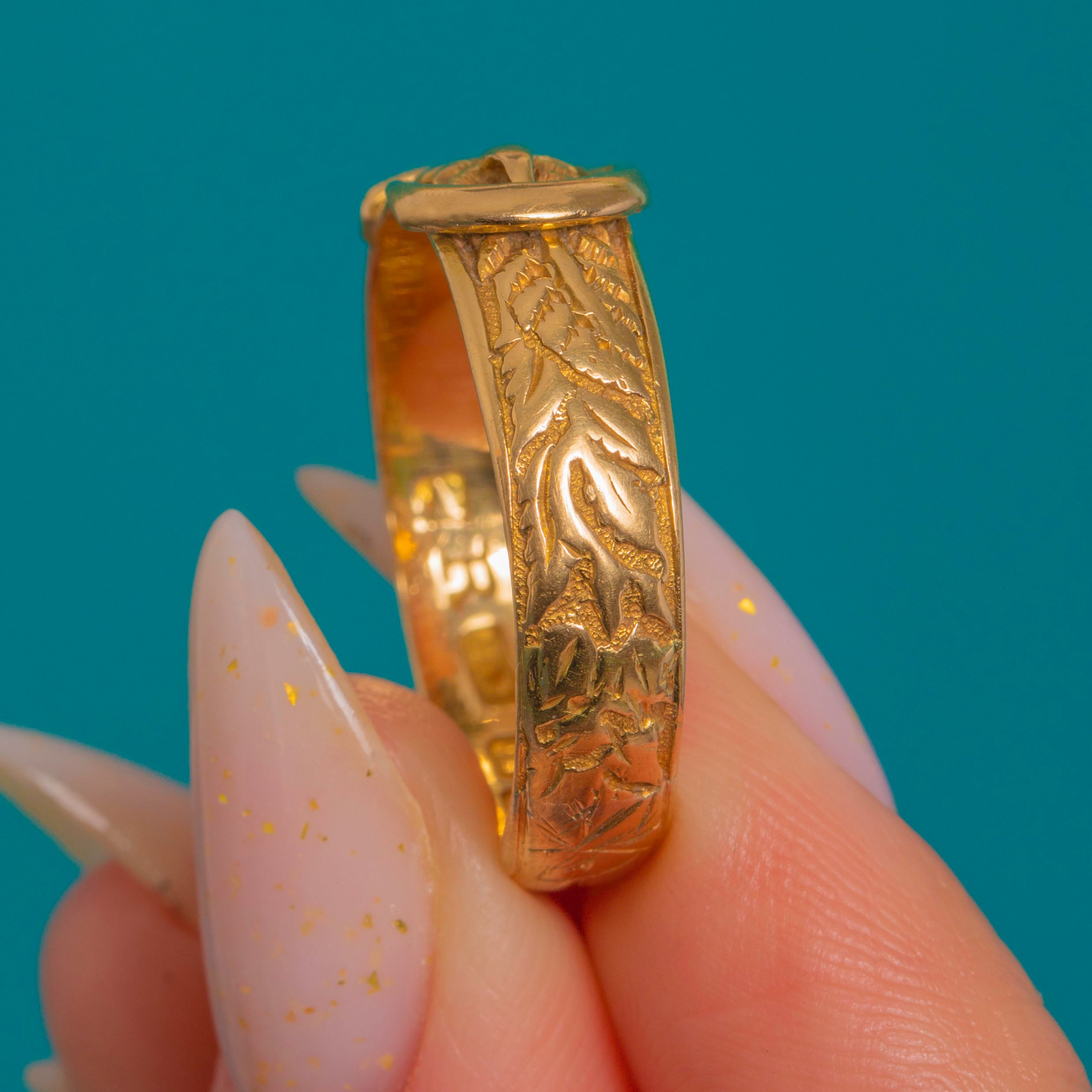 A classic buckle ring in rich 18ct Gold, this antique beauty marries sculpted form with intricate foliate engravings. The raised loop, tongue and keeper sit proudly over a chased leafy ground, giving a low-profile yet substantial presence that feels wonderfully reassuring on the hand.