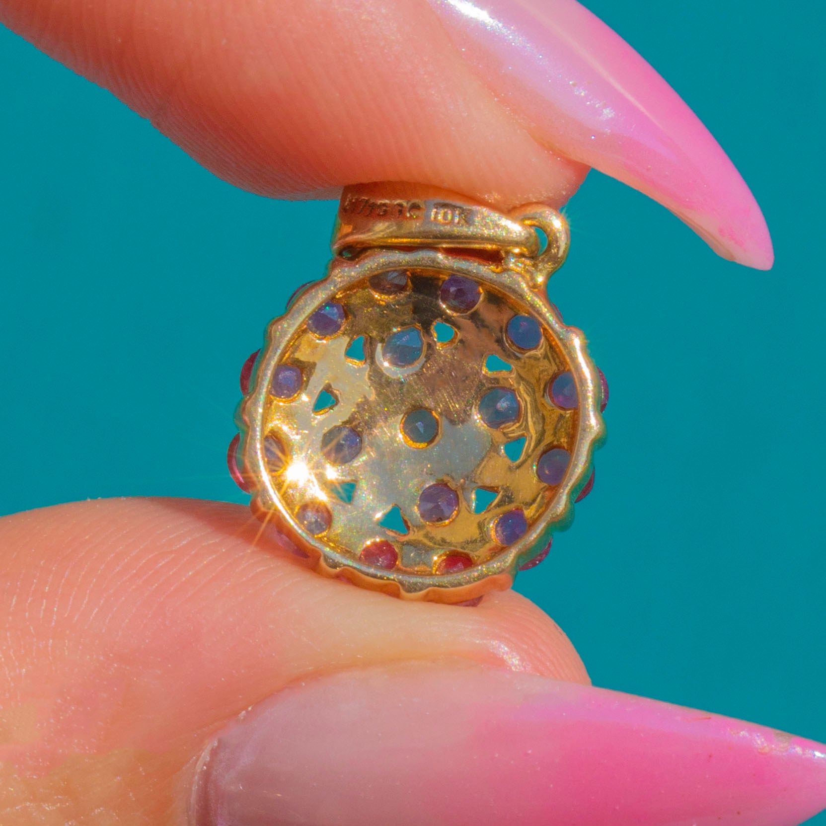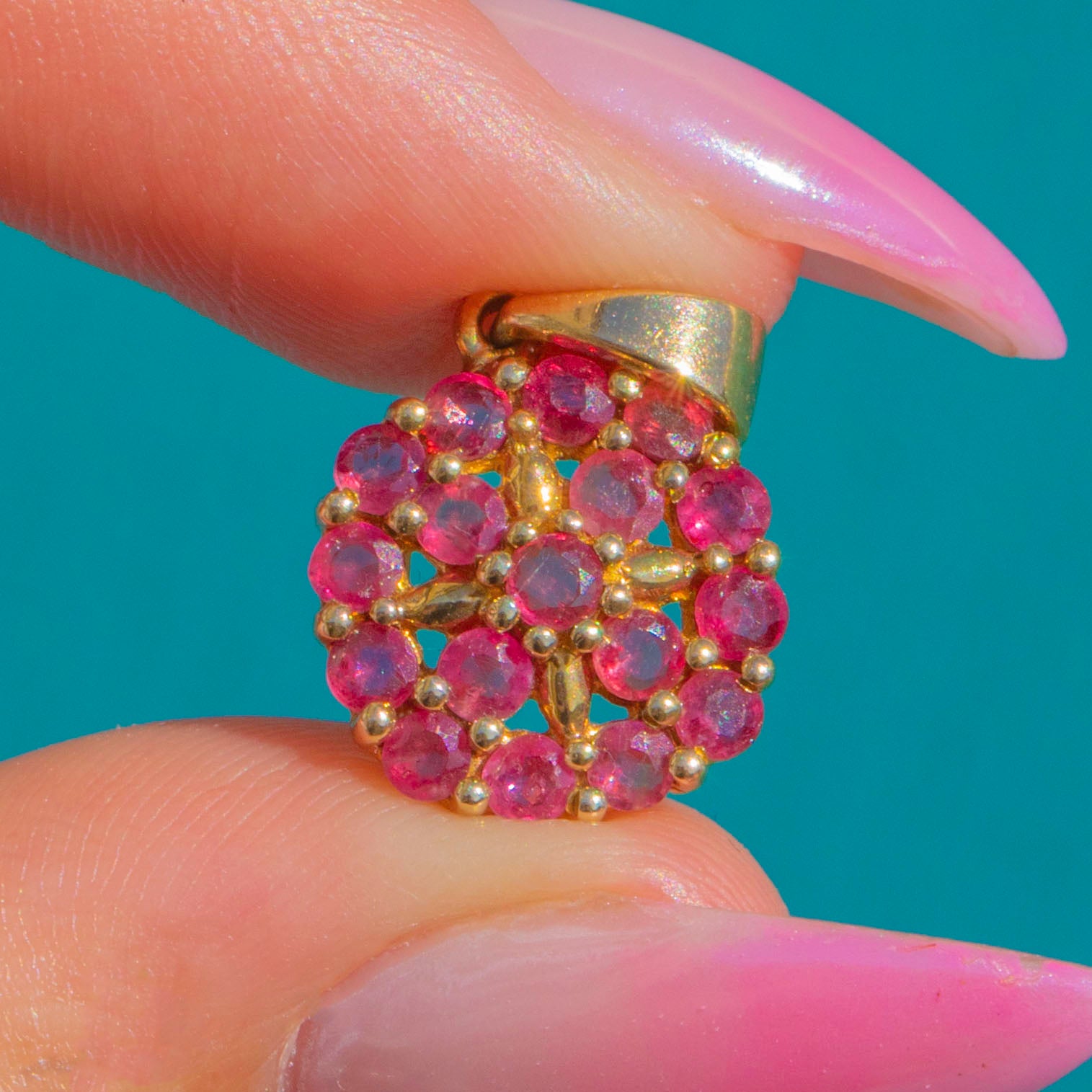 小ぶりながらも華やかに輝くヴィンテージのフラワークラスター・ペンダント。10ctゴールドに、鮮やかなピンクからラズベリー色のシンセティック・ルビーが密に配され、パヴェ風の花模様を形作っています。やわらかなスカラップ状の縁取りが、上品でフェミニンな印象を添えます。