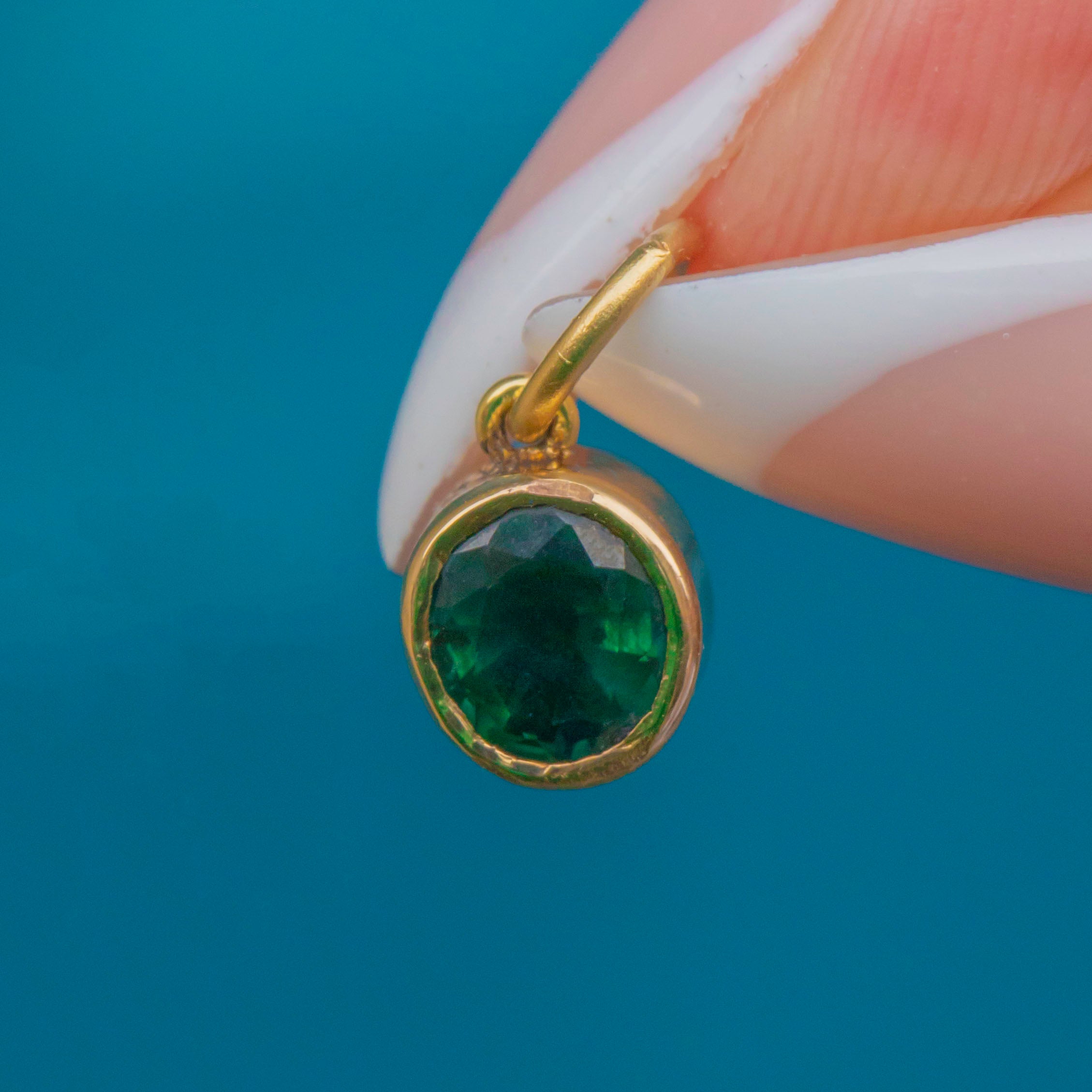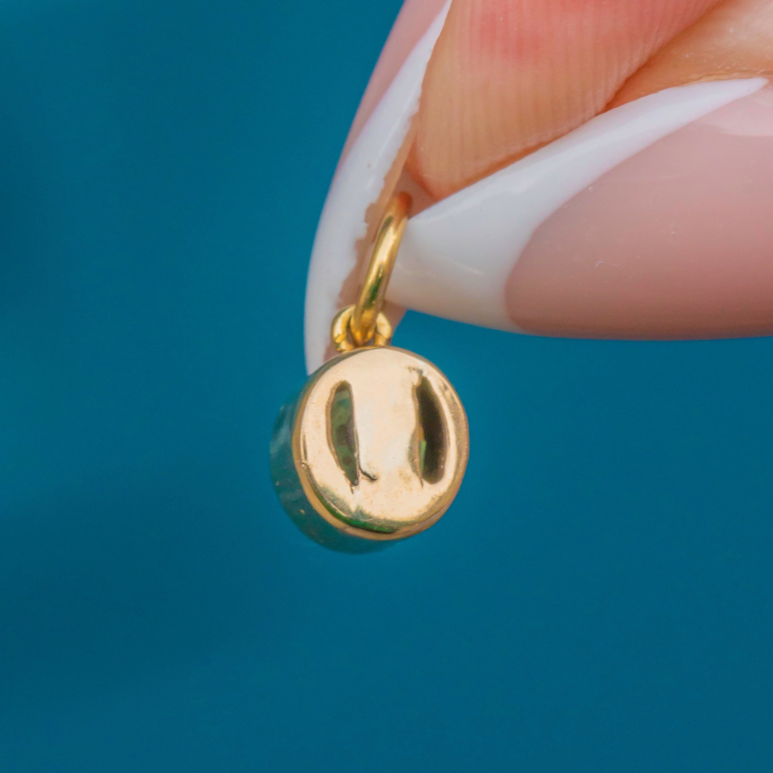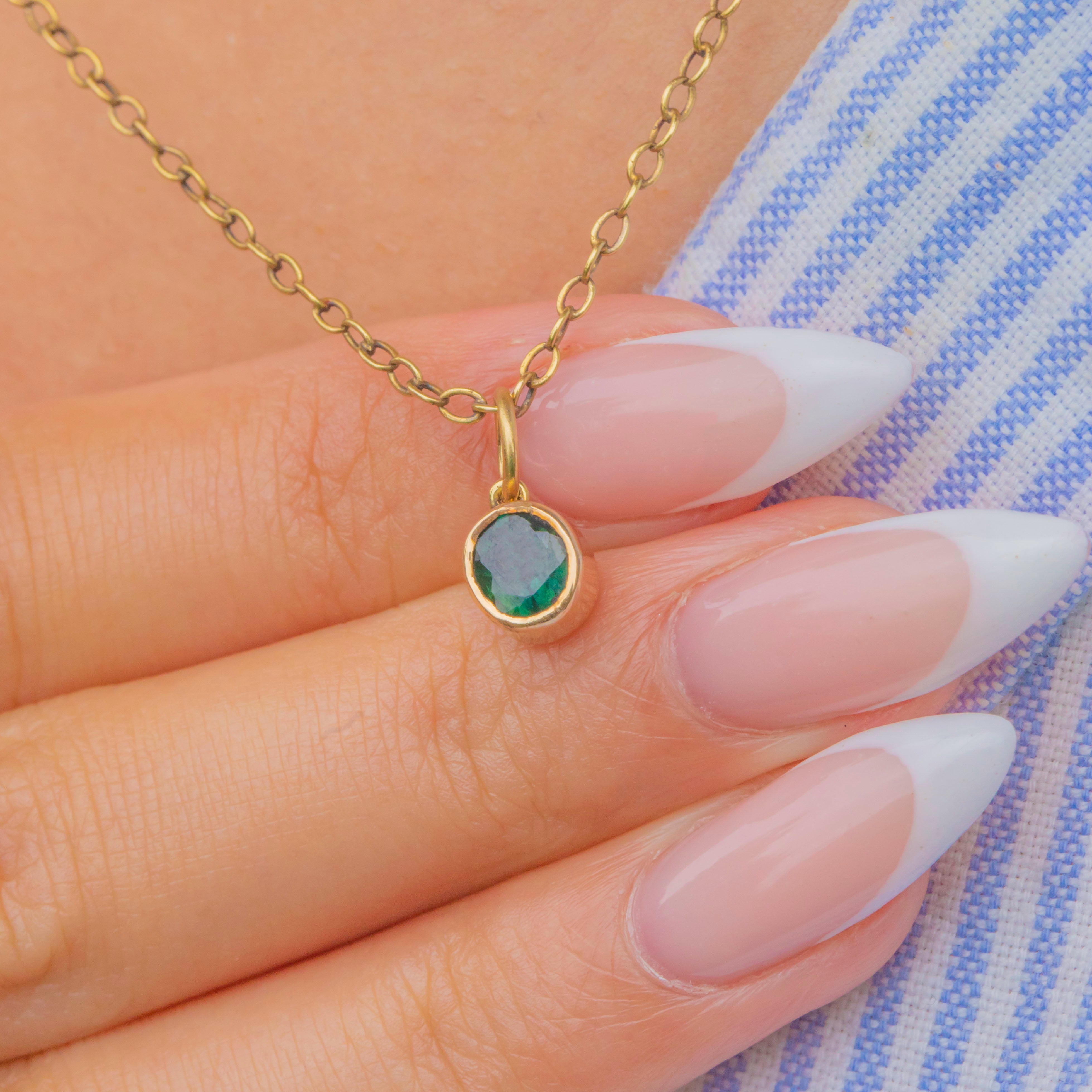 A dainty teal Sapphire charm in warm 14ct Gold. The chubby oval faceted Sapphire sits in a smooth bezel with a neat jump ring—perfect to add a pop of saturated green-blue to your everyday chain or charm stack.