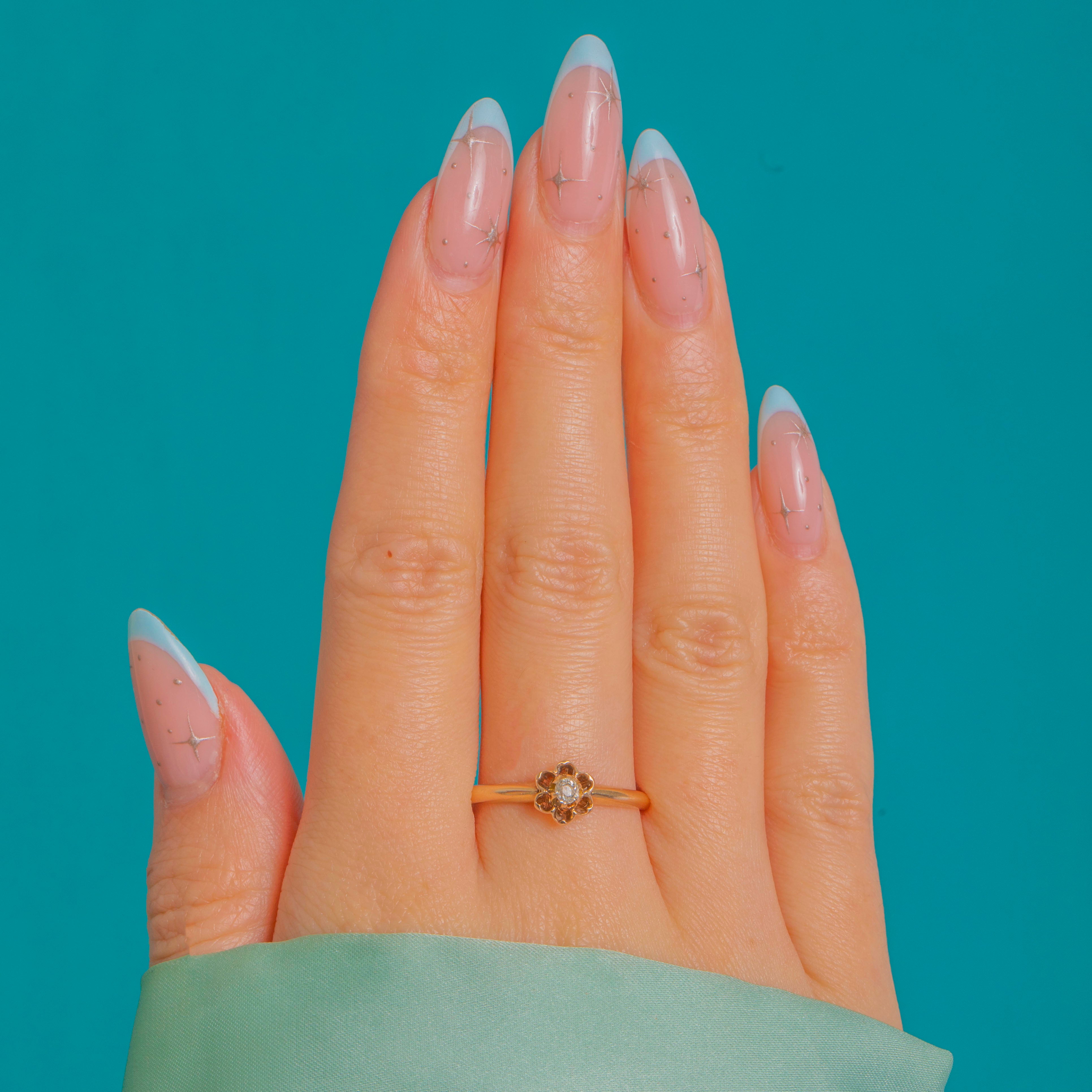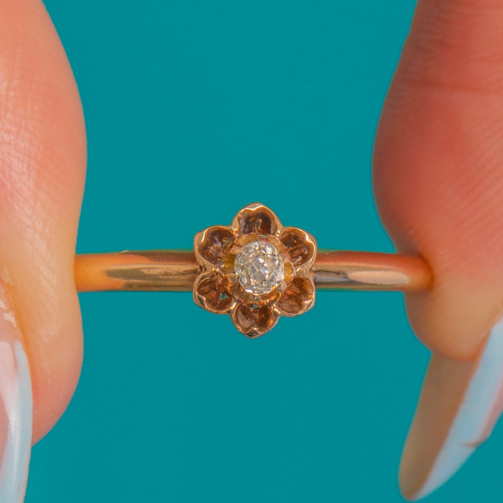 A dainty delight with timeless charm, this Art Deco flower ring blooms in 14ct Gold with a sparkling Old Mine Cut Diamond at its heart. The scalloped buttercup setting cradles the stone beautifully, its cupped “petals” creating a softly romantic silhouette with a low, easy-to-wear profile.