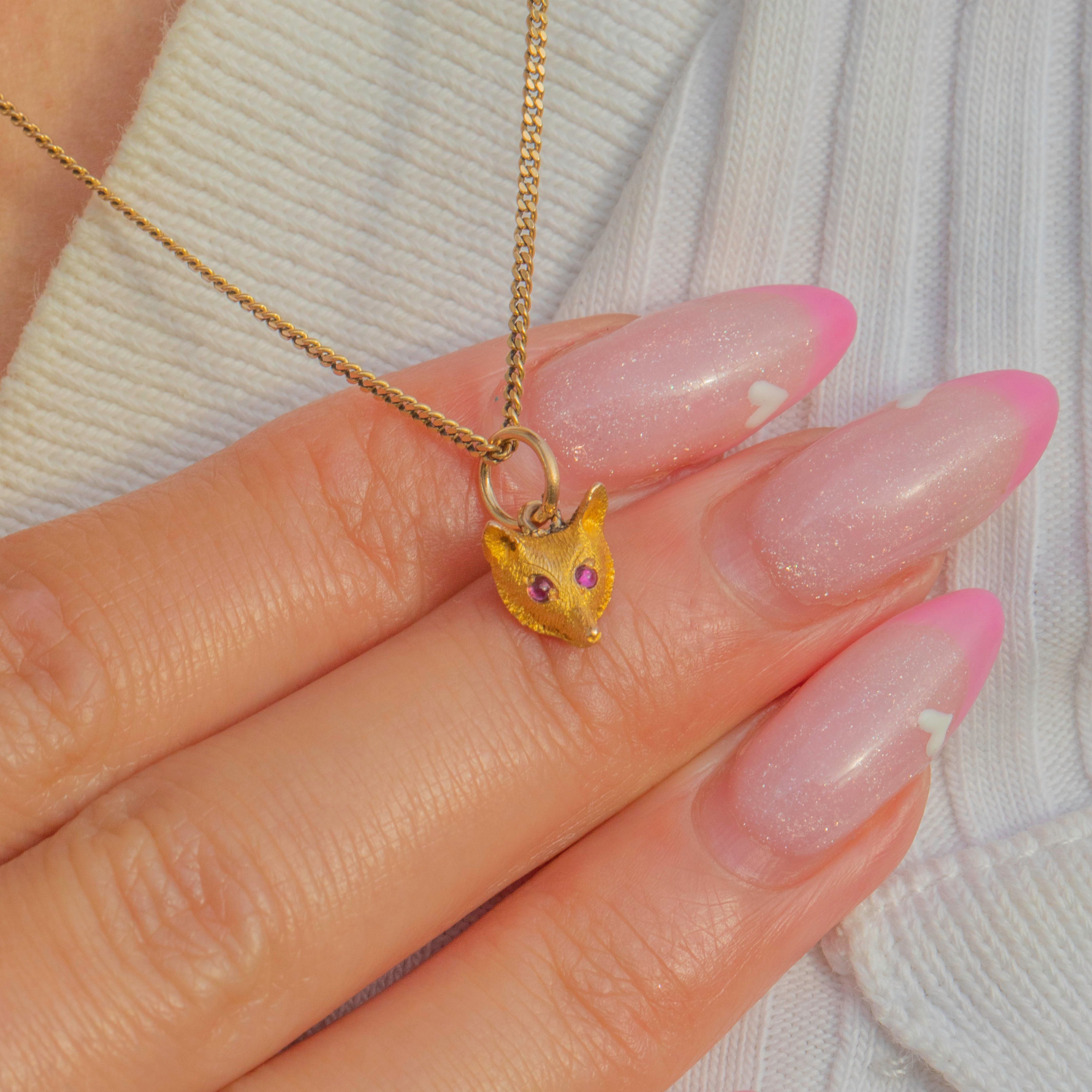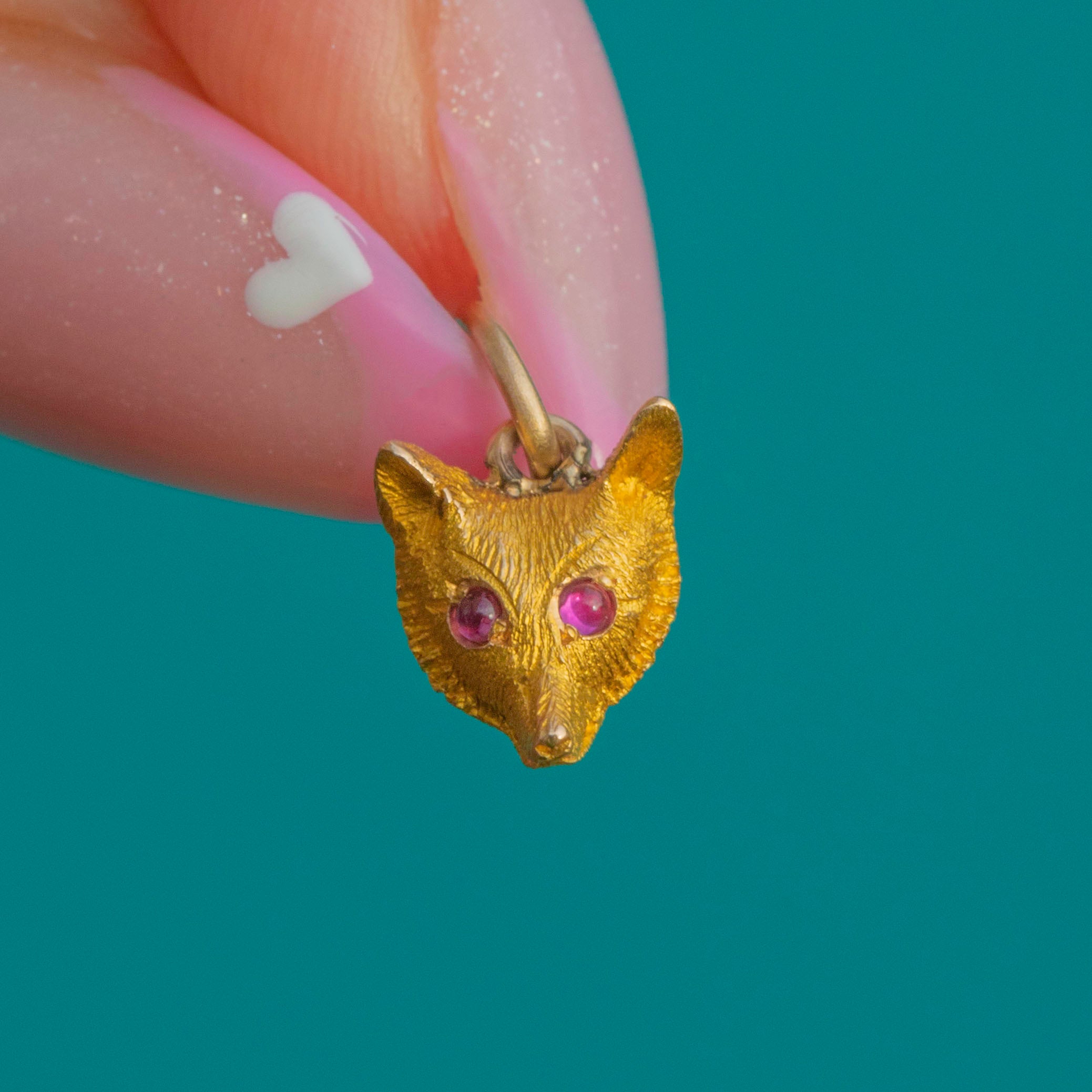 This exquisite Victorian fox head charm is crafted in rich 18ct Gold and set with tiny Ruby eyes that gleam with vivid red sparkle.