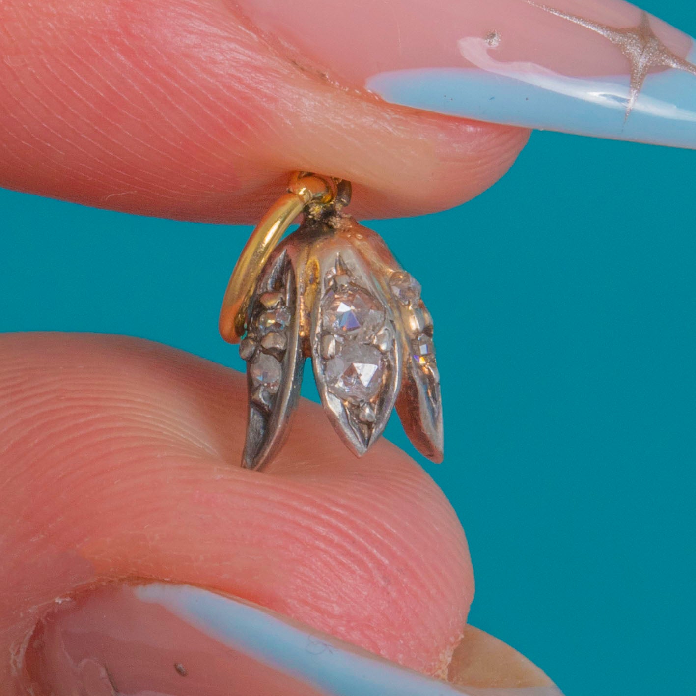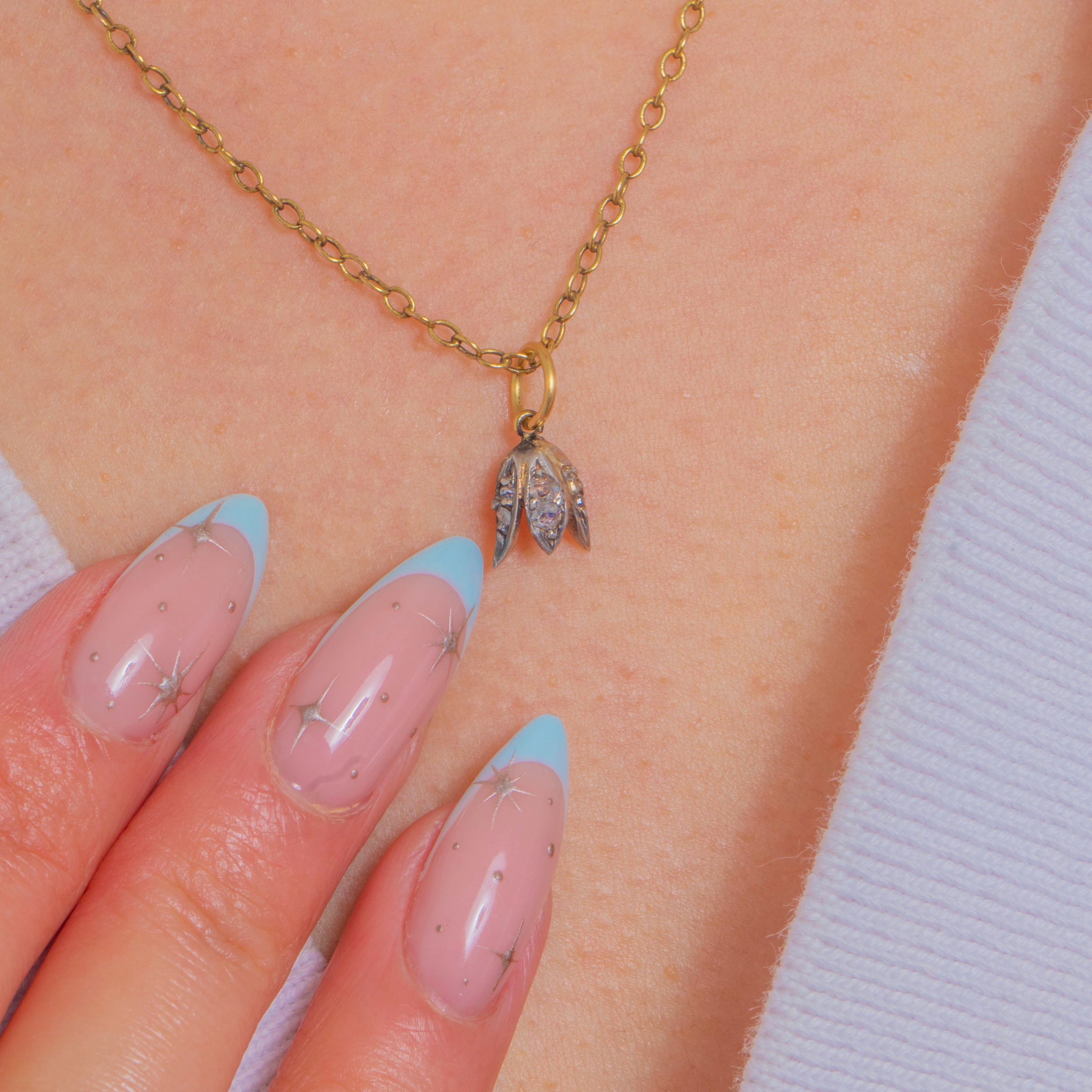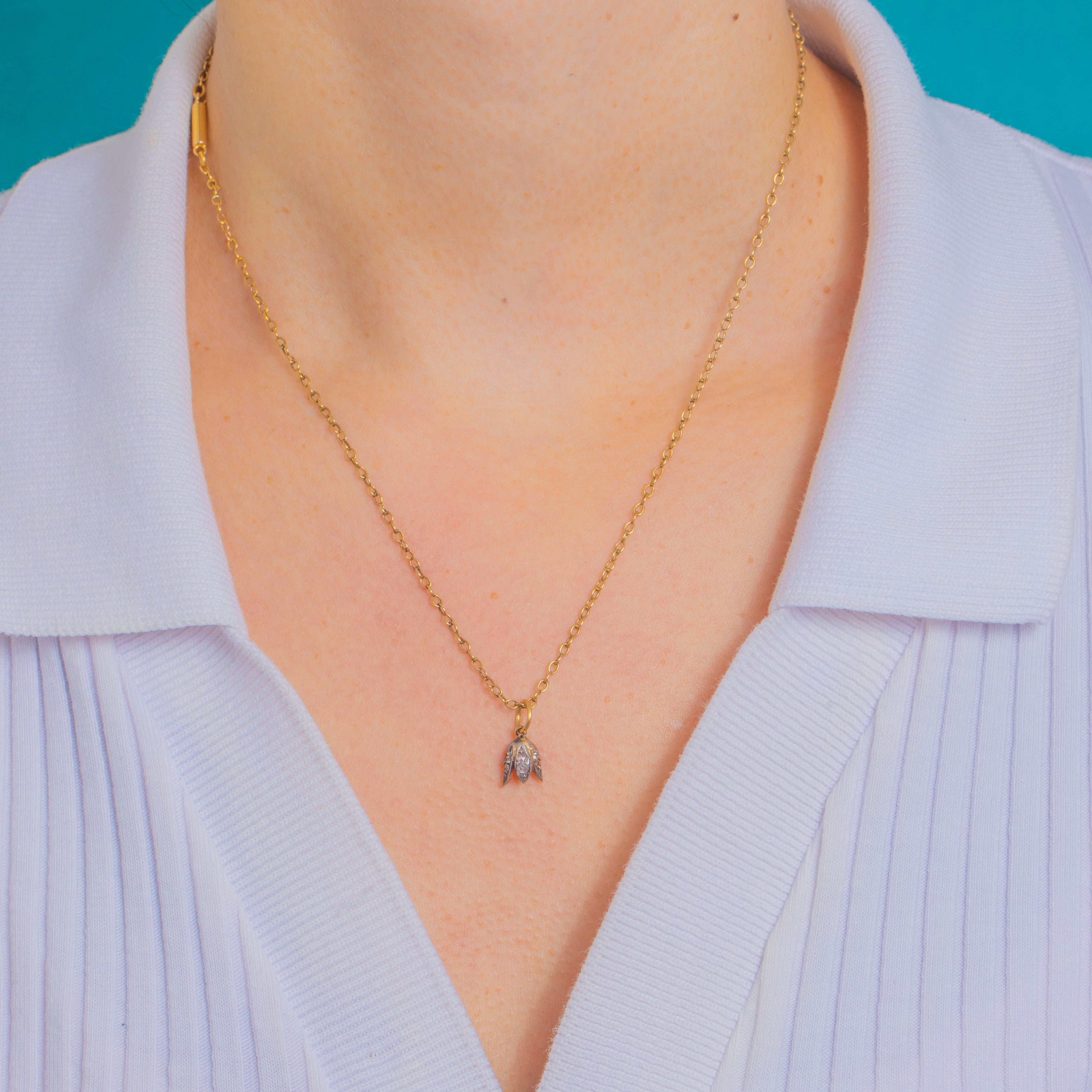 A dainty Victorian treasure, this tiny flower charm is fashioned as a three‑petalled bud, its softly domed petals Silver‑topped and set with twinkling rose-cut Diamonds. The two‑tone palette—cool Silver over warm 18ct Gold—creates that coveted antique shimmer, delicate yet distinctive.
