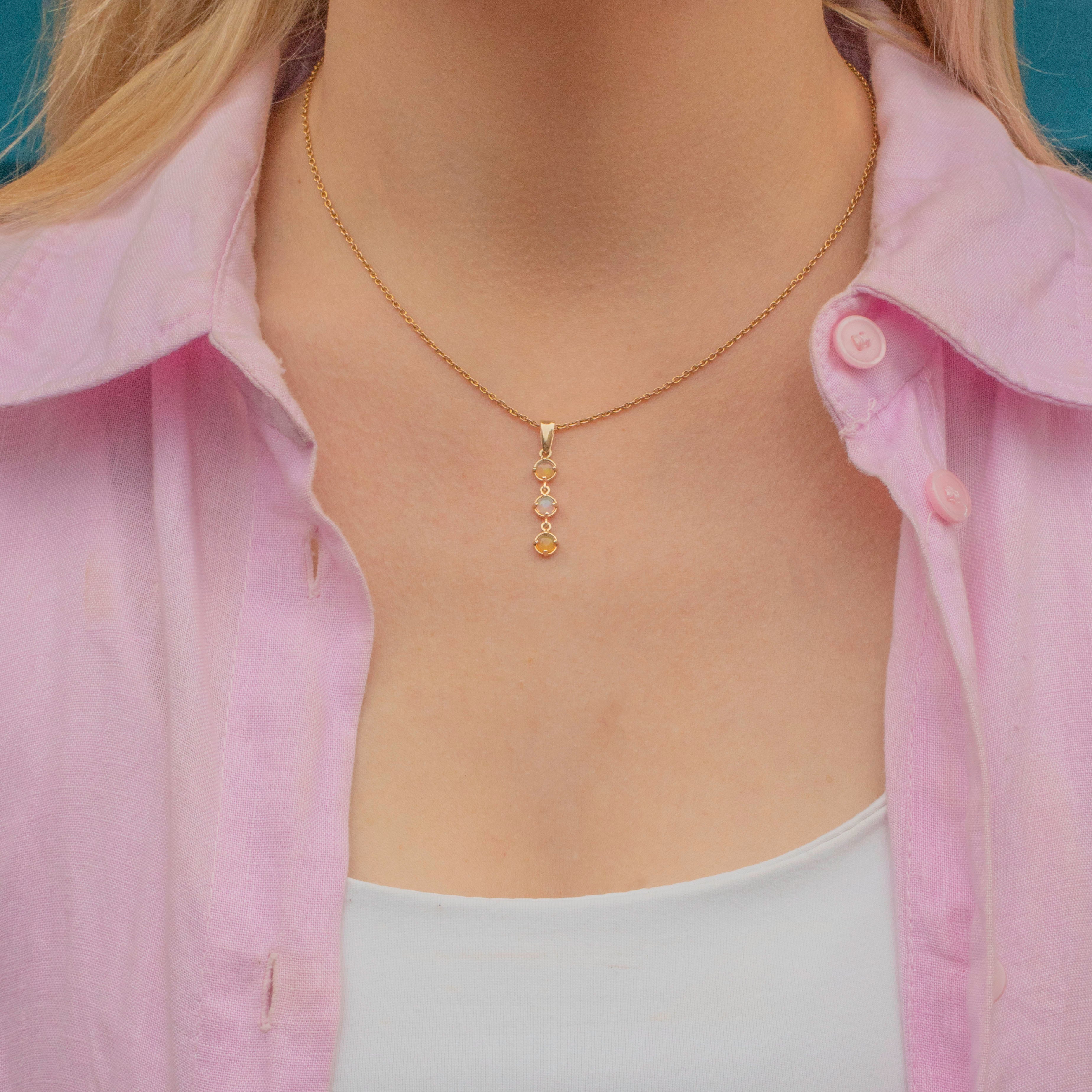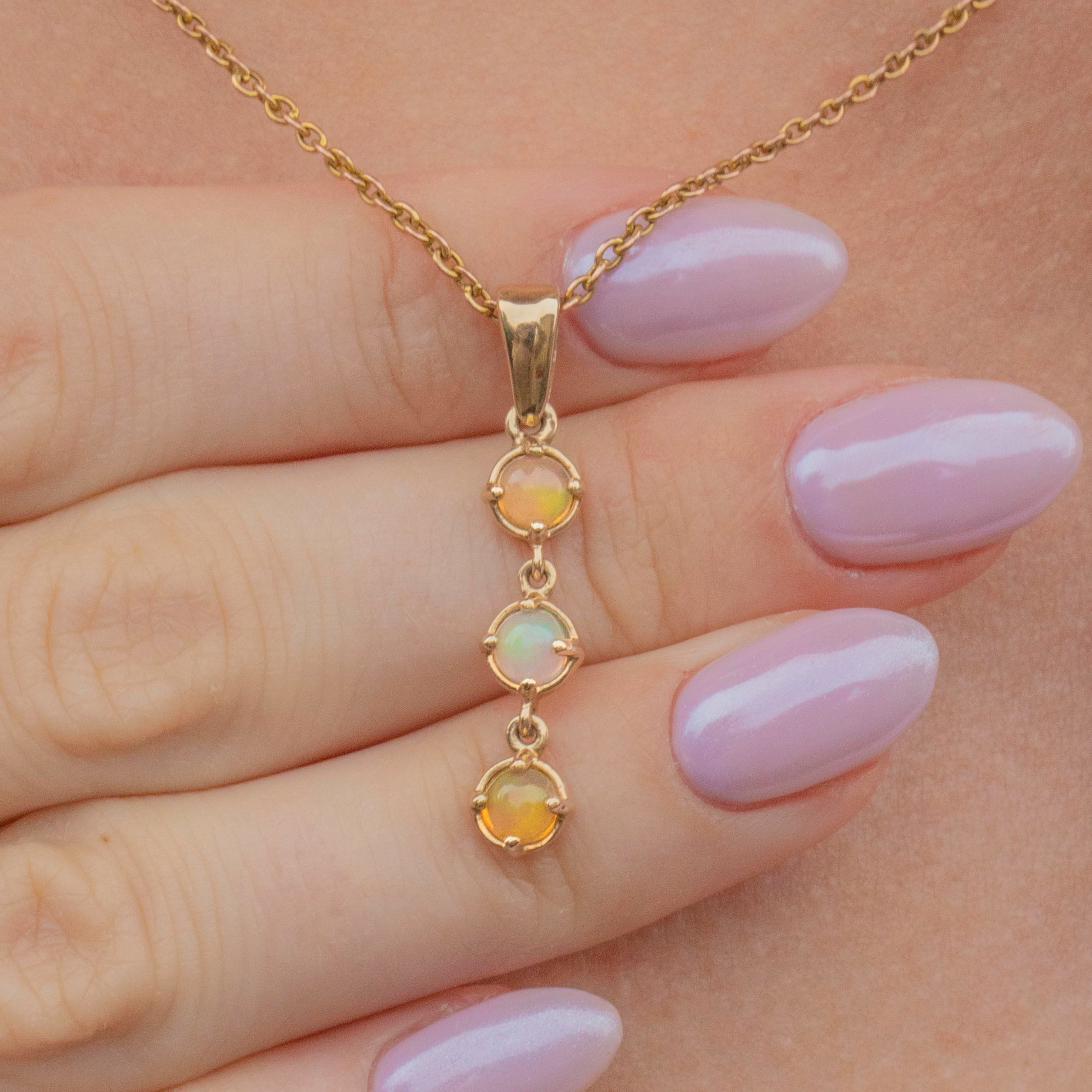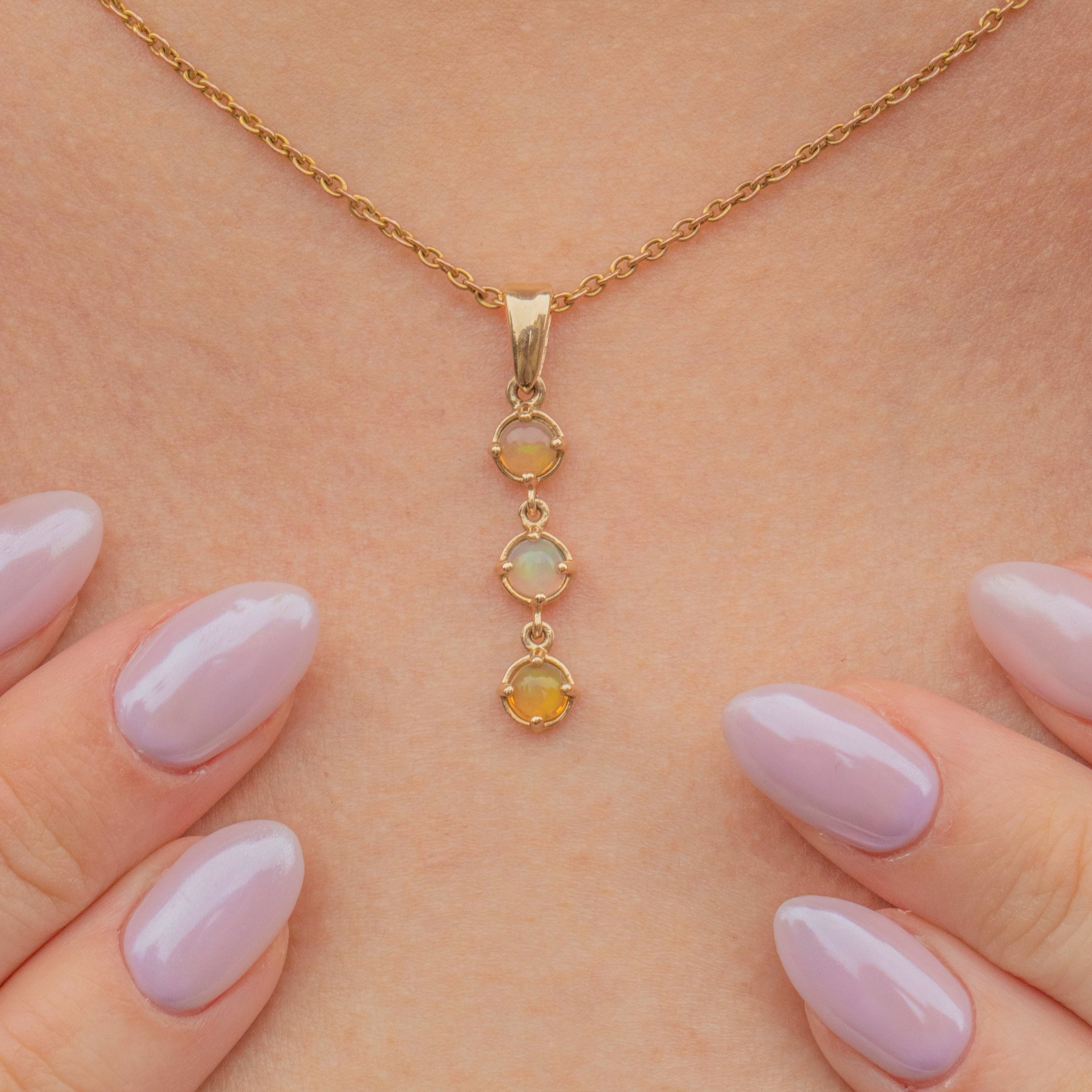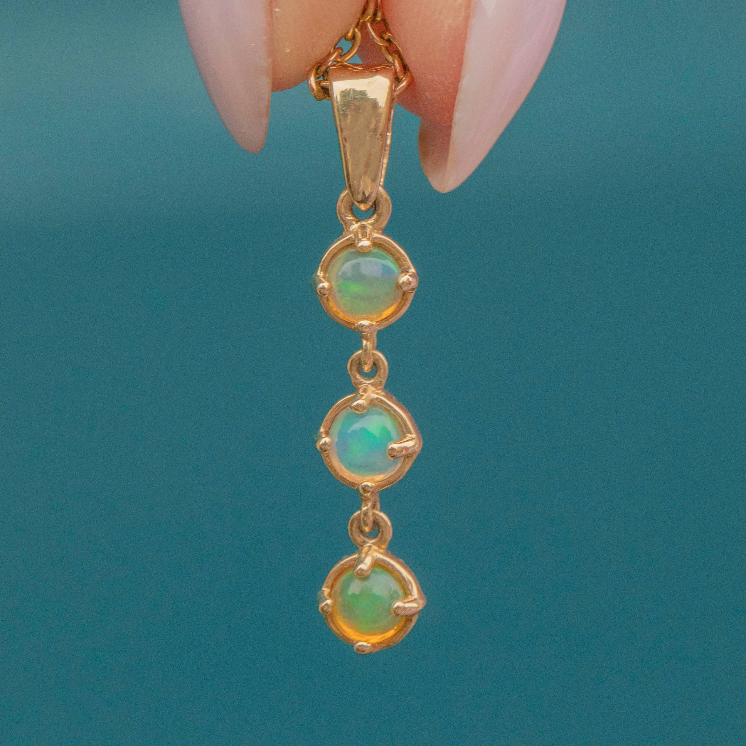 Her three dreamy Opals dance with movement, catching light in the most gorgeous way. Set in a 9ct Yellow Gold drop pendant, this piece is perfect for adding some ethereal shimmers to your collection.