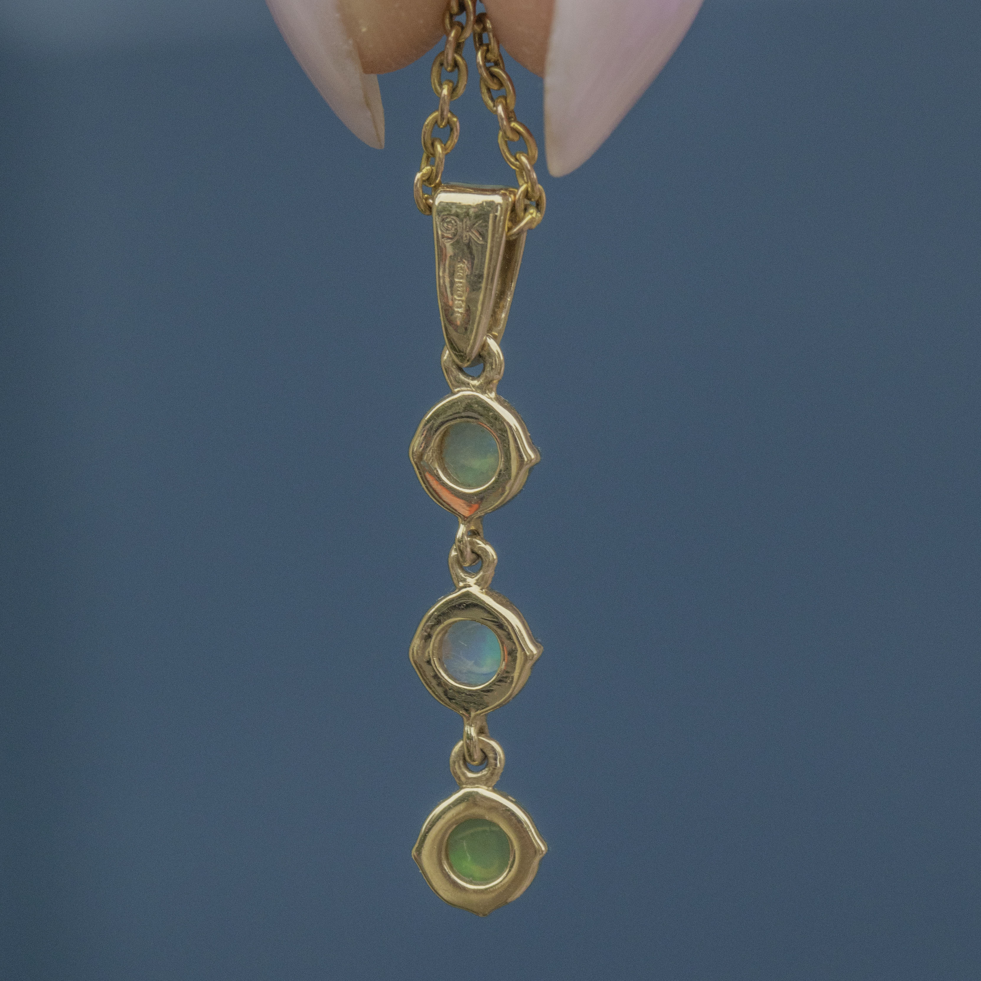 EXCELLENT. This 9ct Gold Jelly Opal drop pendant is in wonderful condition. Each Opal is securely set within the pendant, free from chips or scuffs. The Gold is buttery throughout and with little wear to note, she is a real treasure.