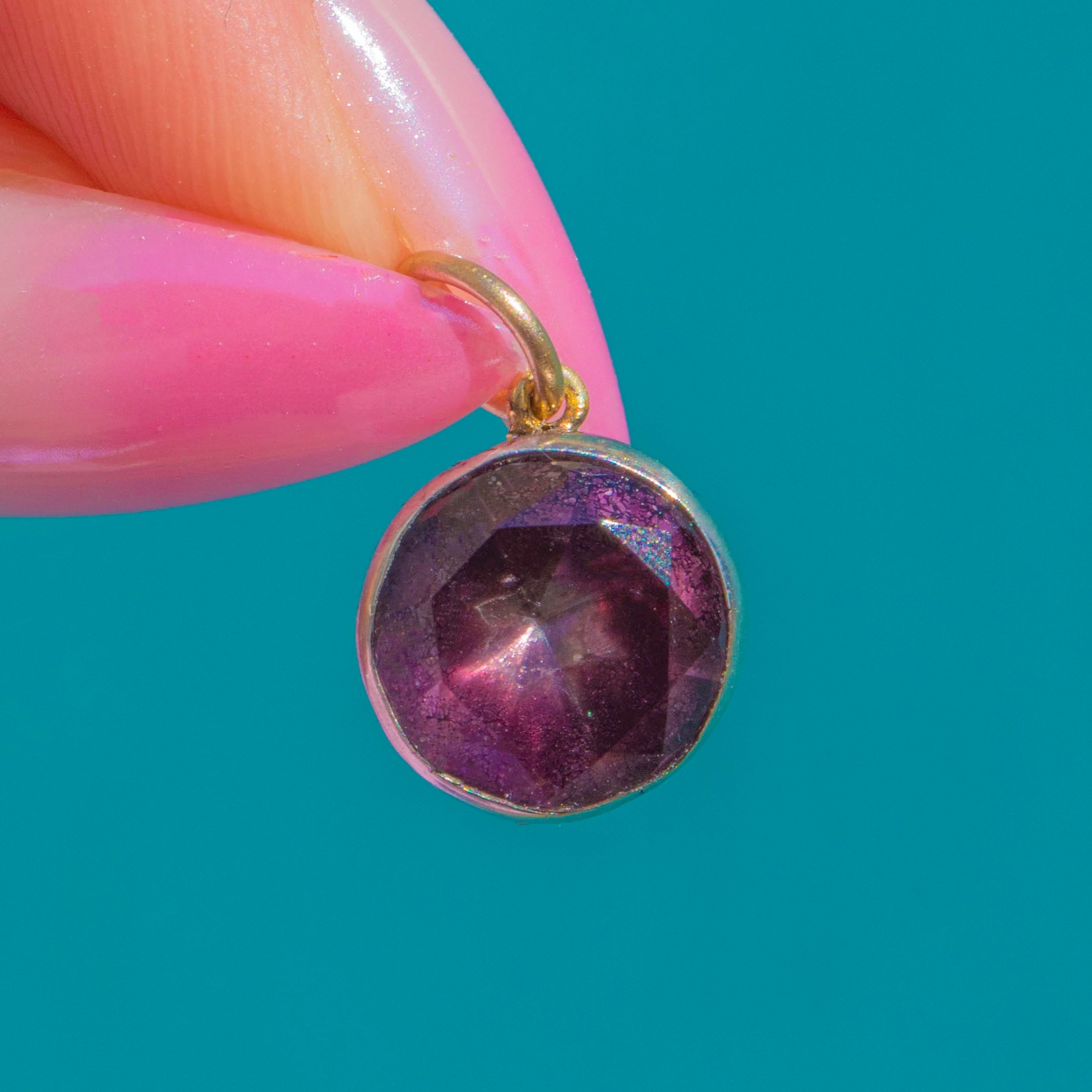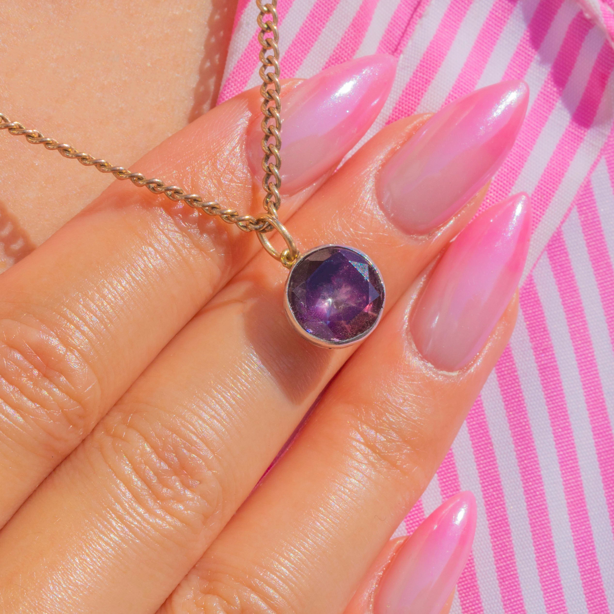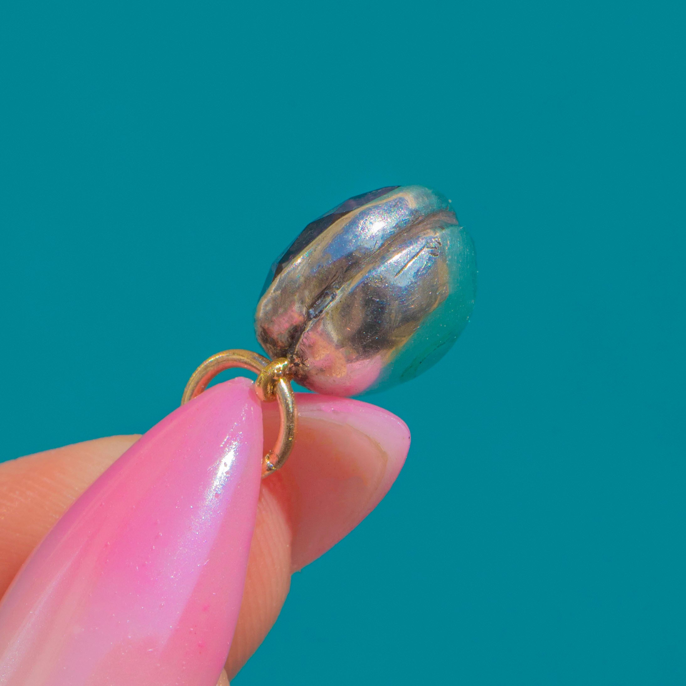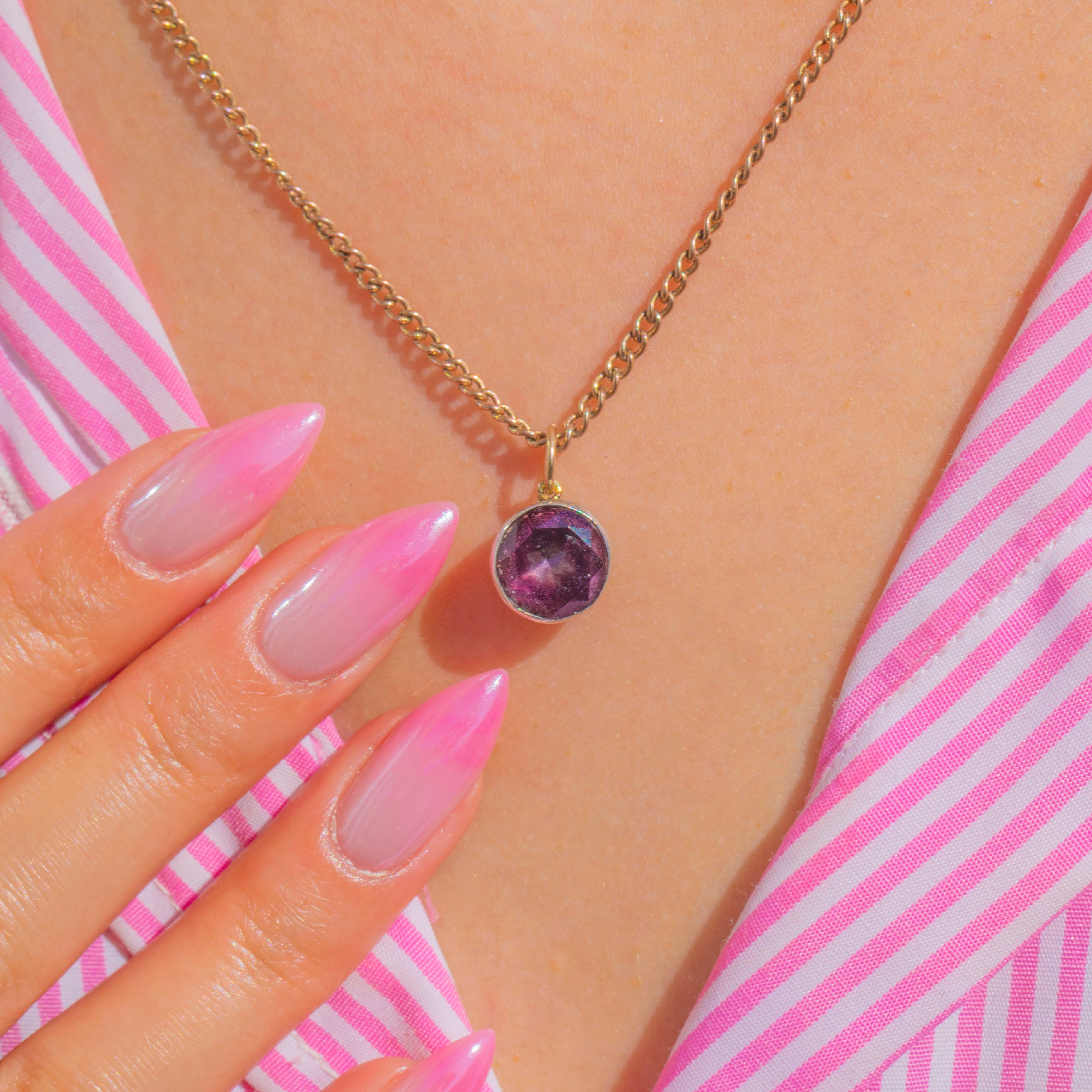 繊細なGeorgian期のフォイルドアメシストチャーム。愛されるベルベットのような紫色の輝きが、クローズドバックのシルバーセッティングによって一層引き立てられています。ストーンは端正な覆輪留めでしっかりと固定され、アンティーク特有のフォイリングがロマンティックで洗練された内なる輝きを添えています。