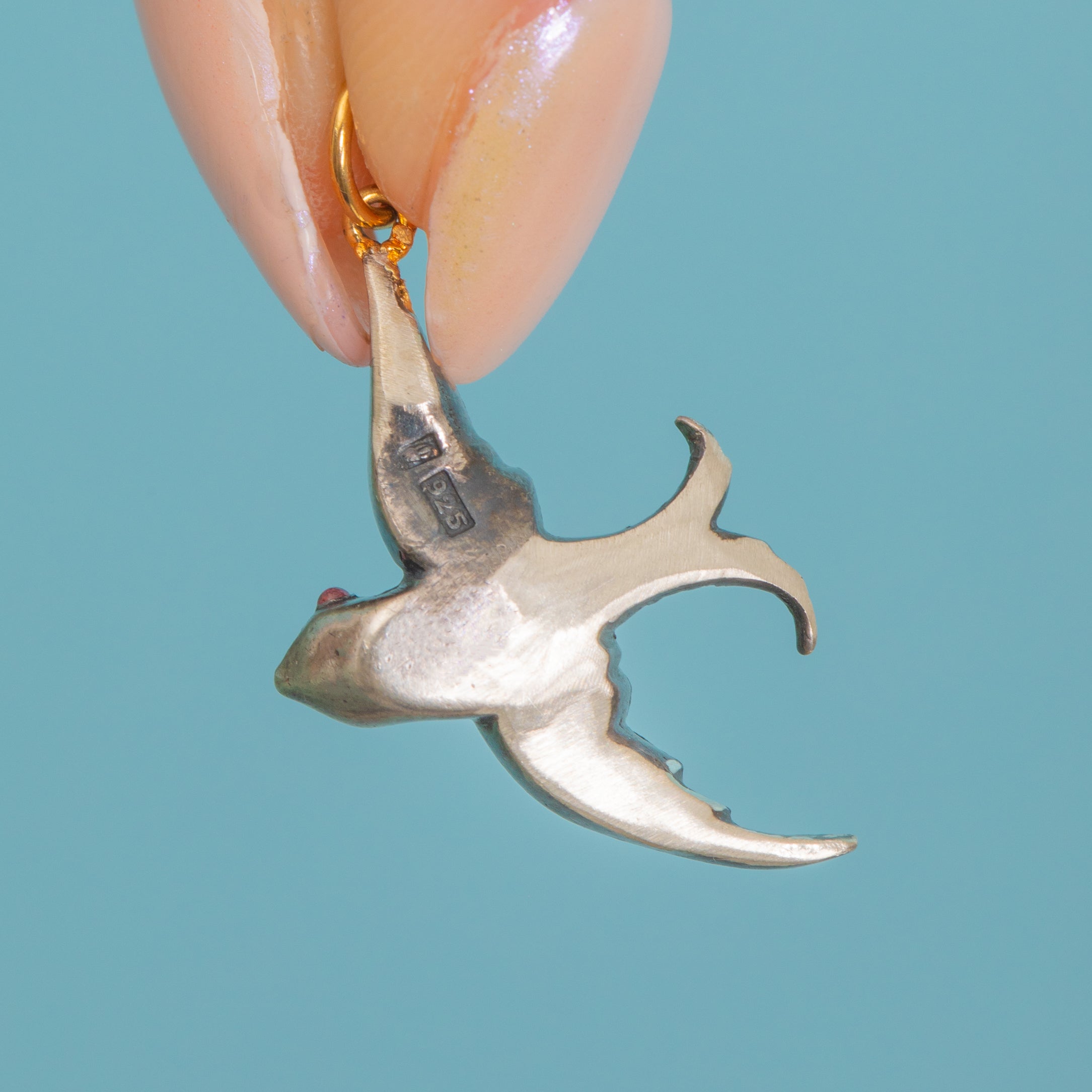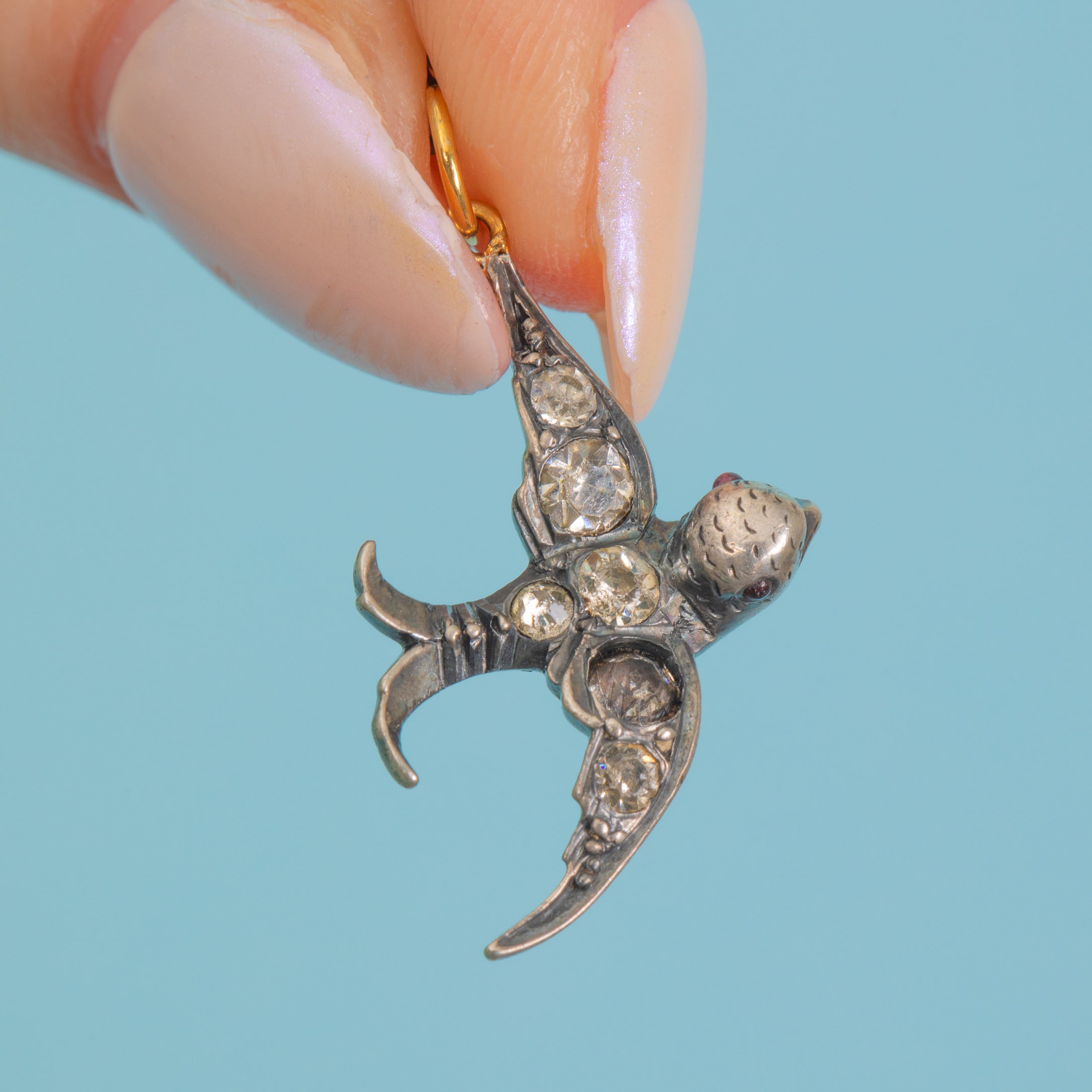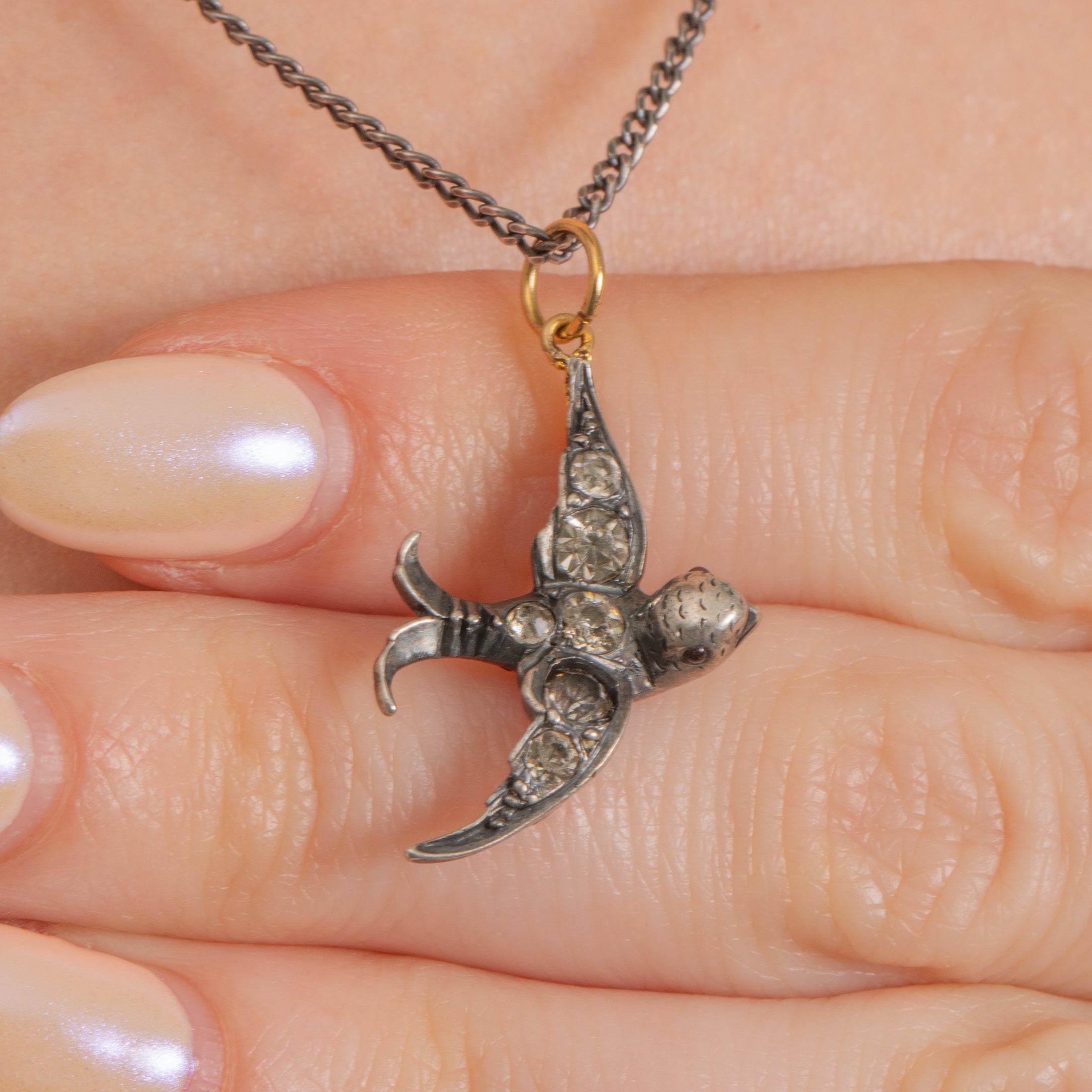 A breathtaking dainty antique Silver Paste swallow pendant! This exquisite piece features a beautifully crafted swallow made from Silver, adorned with sparkling Paste gemstones covering her entire body, complete with Ruby Paste eyes.