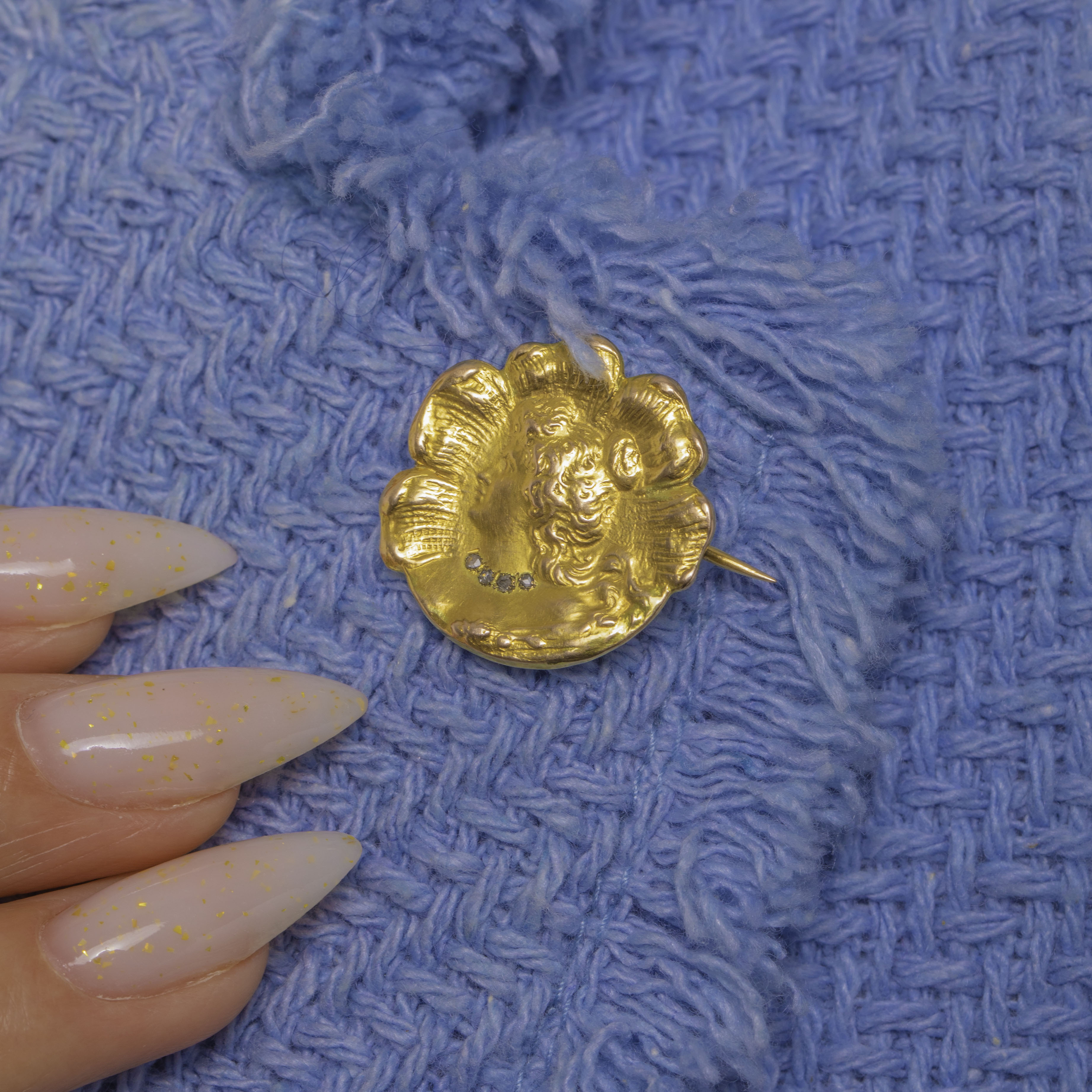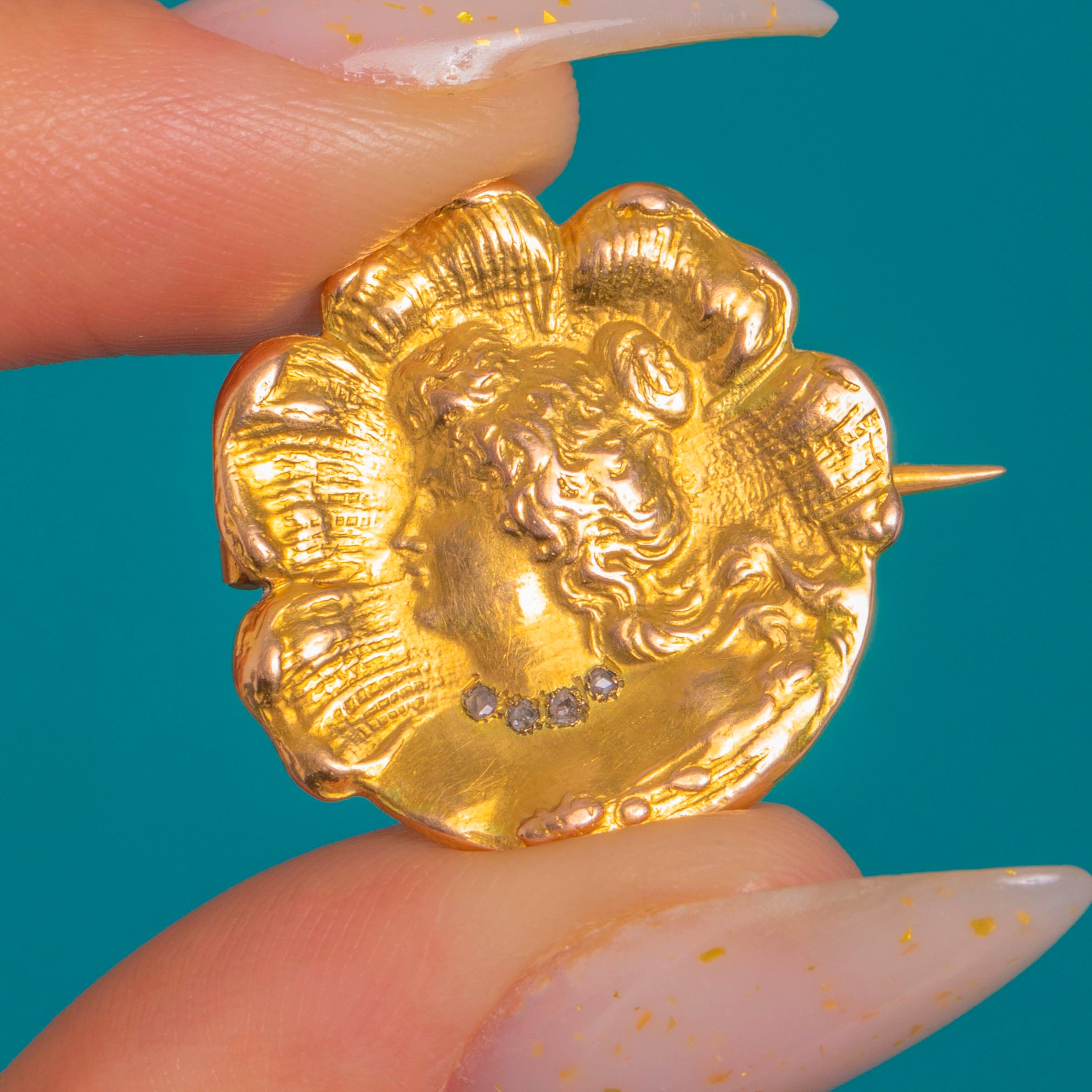 Quintessentially Art Nouveau, this petite 18ct Gold portrait brooch features a graceful maiden in sculpted relief, her flowing “whiplash” hair framed by a scalloped rosette border. A delicate collar of four tiny rose-cut Diamonds sparks at her neckline, lending a subtle, elegant shimmer against the mellow glow of antique Gold.