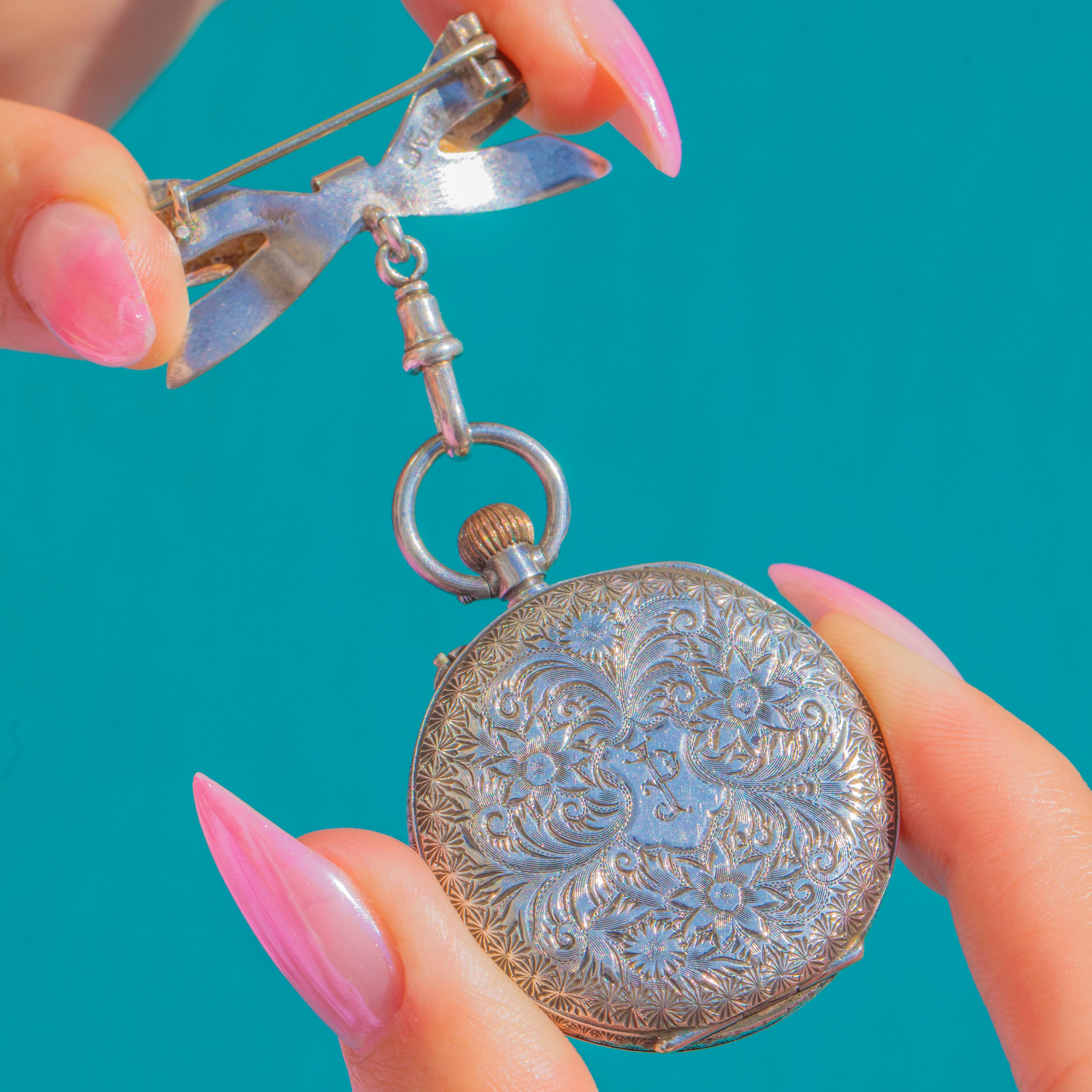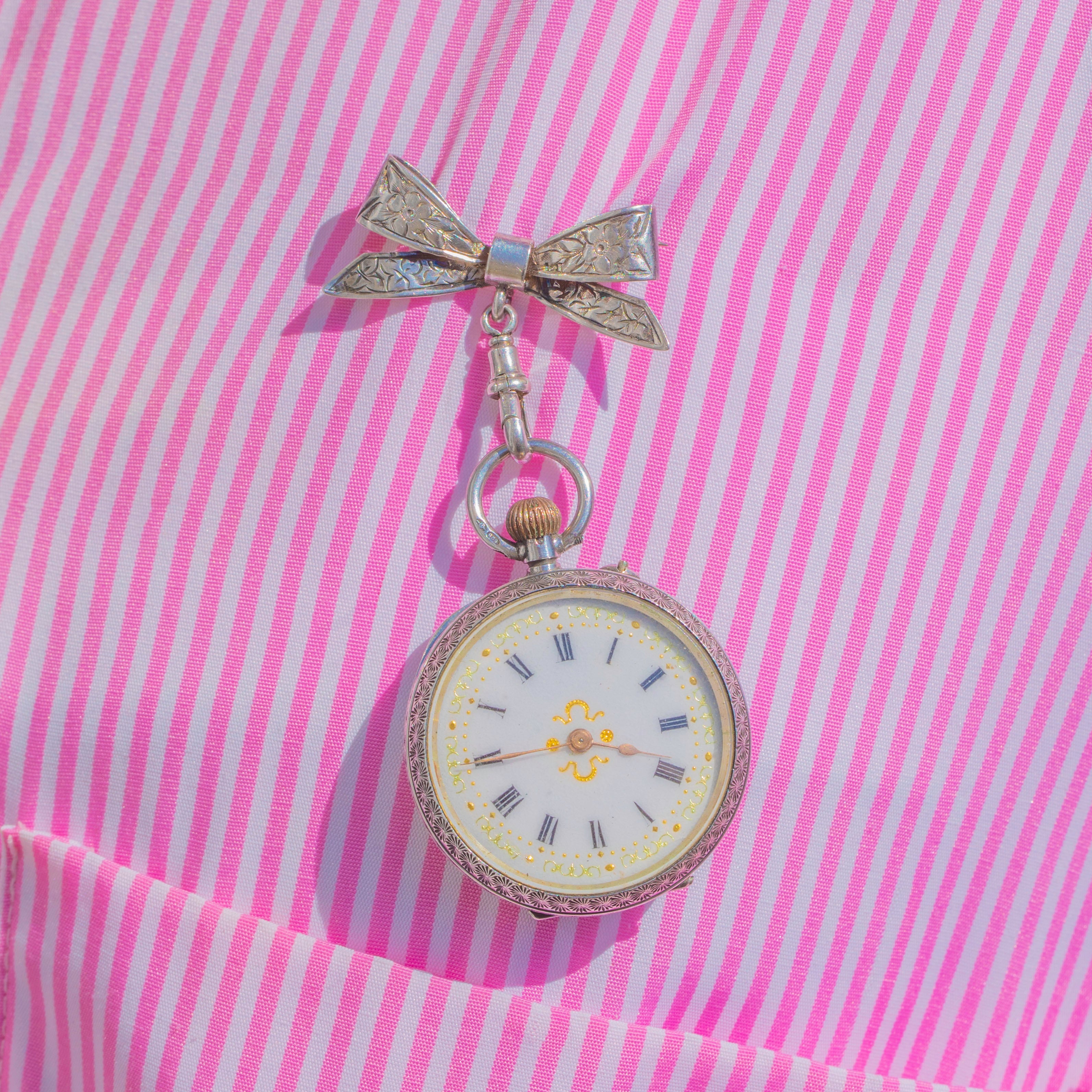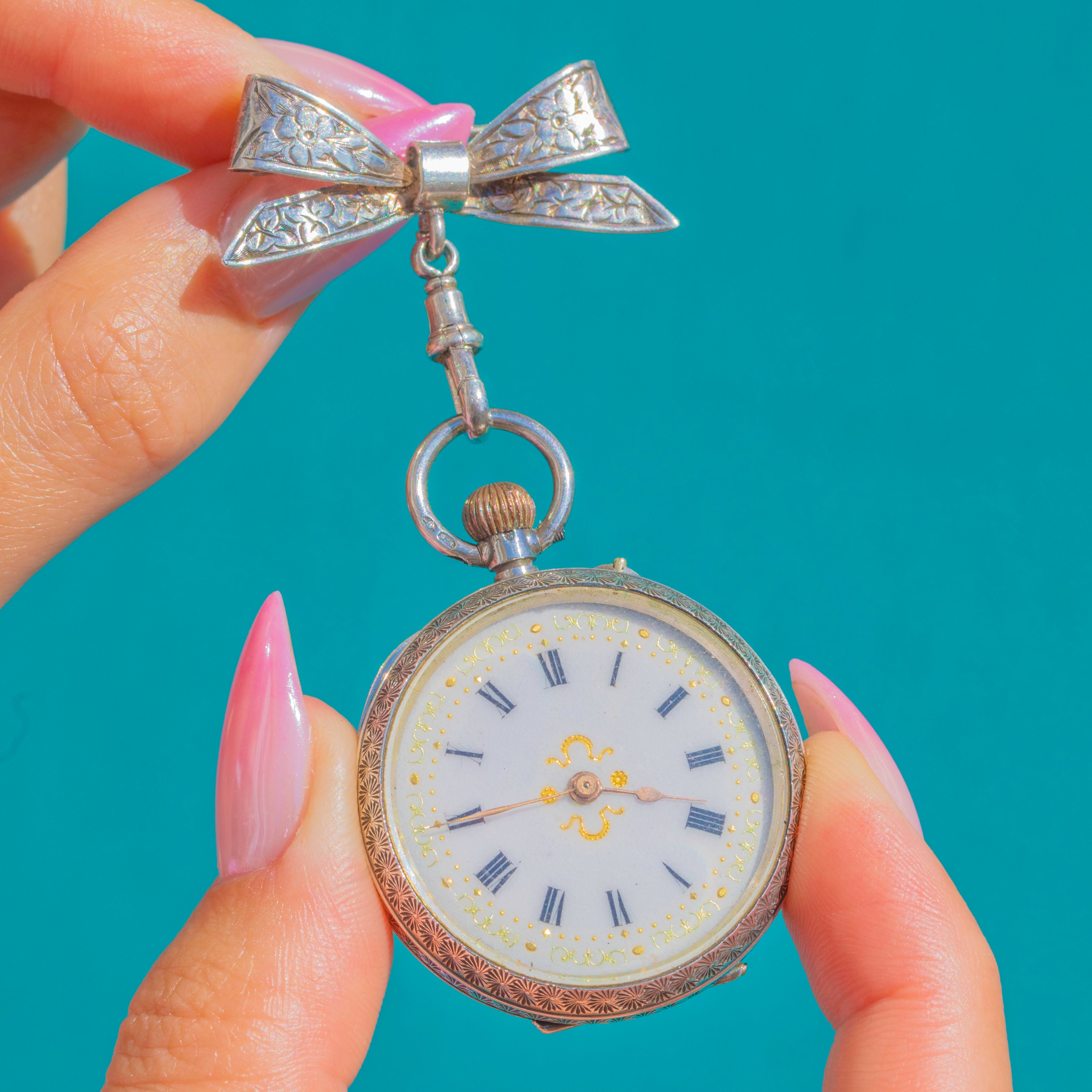 ロマンティックなEdwardian期の逸品。スターリングシルバー製のリボンブローチが、優美なアーティキュレーテッドドロップで小さなペンダントウォッチを吊り下げています。リボン部分には繊細な植物模様の彫刻が施され、ウォッチケースはエンジンターンドの縁取りで控えめなギヨシェ風の輝きを添えています。ホワイトエナメルの文字盤にはブラックのローマ数字、繊細な金彩のスクロール装飾、そしてエレガントなゴールド針が配され、温かみのある金色のリューズが最後のアクセントとなっています。